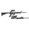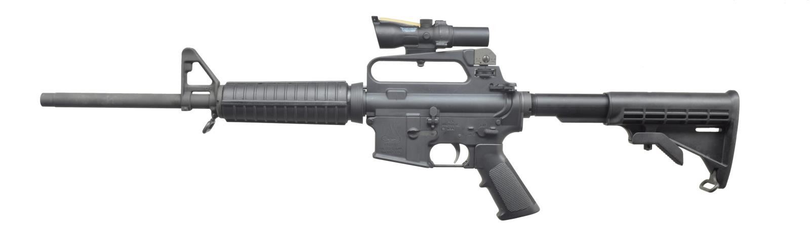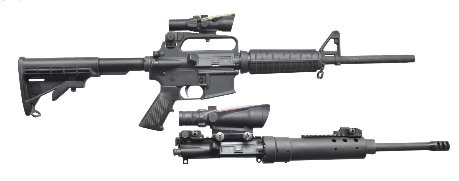 Cal. 223 Rem. S# L472181. Bbl. 16". “1/9 H BAR”. No threads or muzzle brake. No bayonet lug. Carry handle upper receiver w/ rnd. forward assist & brass deflector. Protected post front sight & E-2 adj. rear sight for windage & elevation. Trijicon TA45-2 sight w/ 8 MOA amber triangle reticle. 6 Position collapsible buttstock. Sling swivel front & rear. Dark black anodized finish. Jewell 2-stage trigger. UNATTACHED ACCESSORIES: spare upper receiver, 16" bbl. w/ 223 CQB muzzle brake. Flat top receiver w/ brass deflector & rnd. forward assist. Primounts flip up sights & Trijicon acog, complete w/ SP1 style bolt carrier group & Primounts charging handle. CONDITION: exterior surfaces are free of any major blemishing w/ an outward appearance of having spent more time in storage than on the range. Reticle in Trijicon sight is clear & fiber optic system works fine, but tritium service time can’t be confirmed. Trigger installation may be incorrect as it appears to have much more movement than typical & currently functions as a single stage device, though the overall fire control mechanism appears to function correctly when cycled by hand. Bore is shiny w/ strong rifling. PROVENANCE: From the Frederic W. Thrane Collection. (20-2460/JZ). MODERN. $800-1,200.