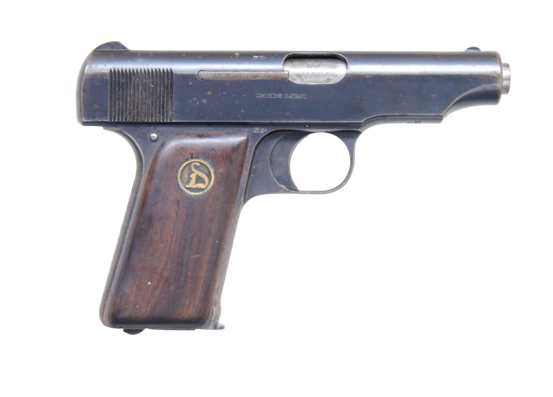 Cal. 7.65mm (32 ACP). S# 185199 (mfg. 1920-1928). Blued finish. 3 1/4" inches barrel length. Fixed front sight, fixed rear sight. Standard frame configuration. Smooth wooden grips with Deutsche Werke medallions. MAGS: 1-8 Rds. CONDITION: Overall condition is good with 70% of the original finish remaining. Slide finish at 70%. Frame finish at 70%. Bore is bright with some wear. (24-4079/MD) CURIO. $150-$250