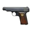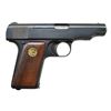 Cal. 32 ACP. S# 128331. Bbl. 3.5". Mfg. 1919-1924. Hammerless auto loading pistol designed by Heinrich Ortgies, manufactured in Germany following WWI. Serrated slide w/ integral sights. Blued steel frame & slide. Backstrap safety. Bottom magazine release. Hardwood grips w/ early brass medallion bearing "D", (Deutsche). Left side of slide marked "DEUTSCHE WERKE / WERK ERFURT" & on right side "ORTGIES PATENT". Frame, below barrel, forward of trigger guard marked w/ serial number & "GERMANY". MAGS: 1 early 8rd. marked 9mm on left side & 7.65 on right side. CONDITION: Finish is complete & consistent w/ only very light thinning at muzzle & some high spots. A few very light scratches on right side of slide. Grips have small impressions & appear structurally sound. Bright bore w/ strong rifling. (22-5693/JZ). CURIO. $250-350.
