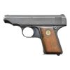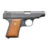 Cal. 25 ACP. S# 113850. Bbl. 2.75". Mfg. 1919-1924. Hammerless auto loading pistol designed by Heinrich Ortgies, manufactured in Germany following WWI. Serrated slide w/ integral sights. Blued steel frame & slide. Backstrap safety. Bottom magazine release. Hardwood grips w/ early brass medallion bearing "D", (Deutsche). Left side of slide marked "DEUTSCHE WERKE / WERK ERFURT" & on right side "ORTGIES PATENT". Frame, below barrel, forward of trigger guard marked w/ serial number & "GERMANY". MAGS: 1 original 6rd marked "Cal. 6.35" on floor plate". CONDITION: Finish is complete & consistent w/ thinning at muzzle w/ thinning & light patina on high spots. Grips have small impressions & appear structurally sound. Bright bore w/ strong rifling. (22-5697/JZ). CURIO. $200-300.
