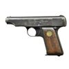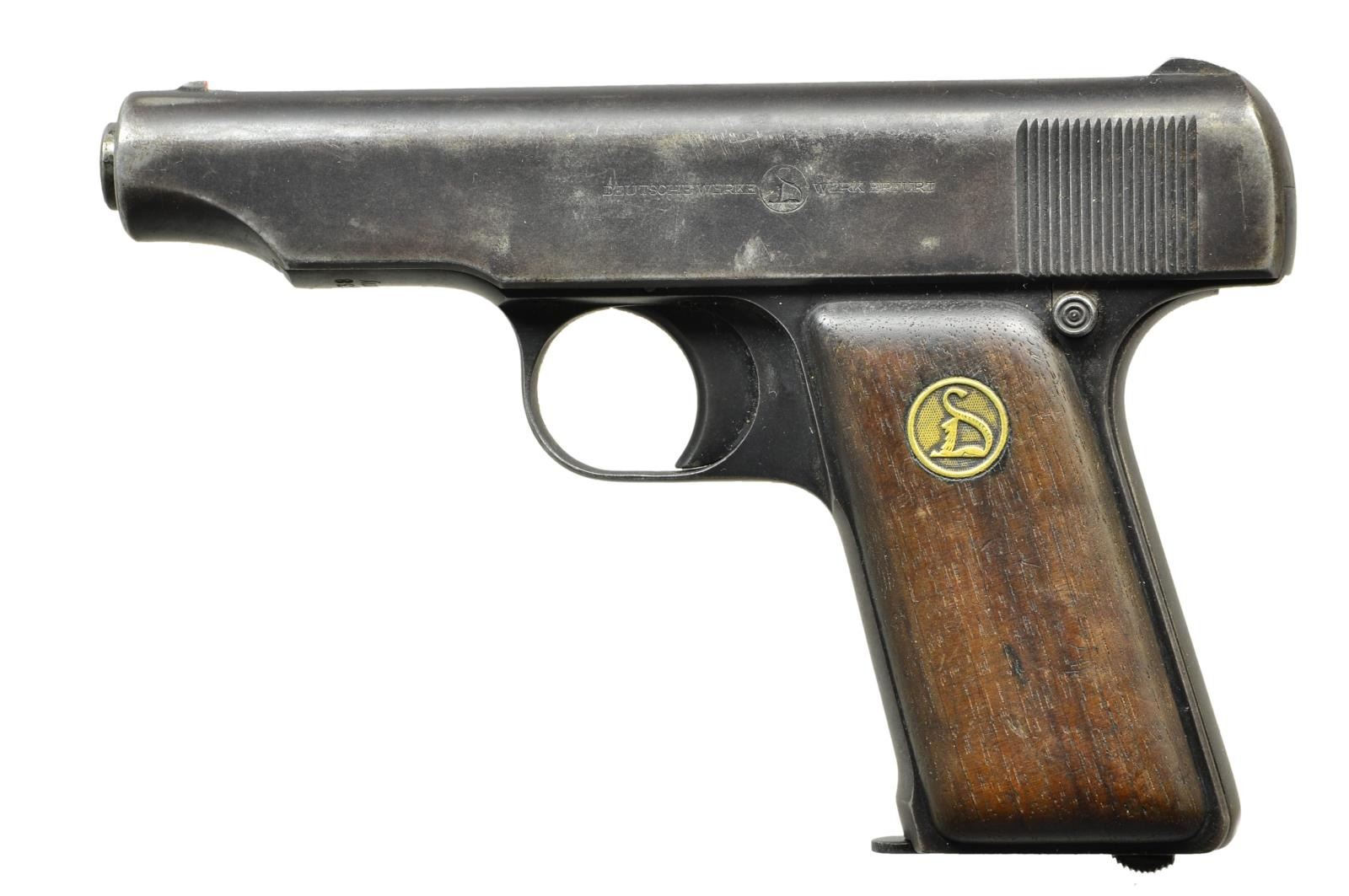 1) DEUTSCHE WERKE ORTGIES PISTOL. Cal. 32 ACP. S# 104538. Bbl. 3.5". Mfg. 1919-1924. Hammerless auto loading pistol designed by Heinrich Ortgies, manufactured in Germany following WWI. Serrated slide w/ integral sights. Blued steel frame & slide. Backstrap safety. Bottom magazine release. Hardwood grips w/ early brass medallion bearing "D", (Deutsche). Left side of slide marked "DEUTSCHE WERKE / WERK ERFURT" & on right side "ORTGIES PATENT". Frame, below barrel, forward of trigger guard marked w/ serial number & "GERMANY". MAGS: 1 steel 8rd. CONDITION: finish is thinning to brown, especially at muzzle & high spots. Scattered patina throughout. Grips have only a few small impressions & appear structurally sound. Dark bore w/ strong rifling. (22-3833/JZ). CURIO.