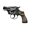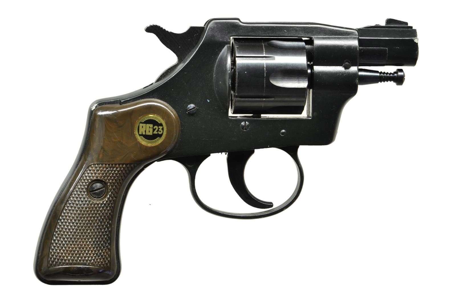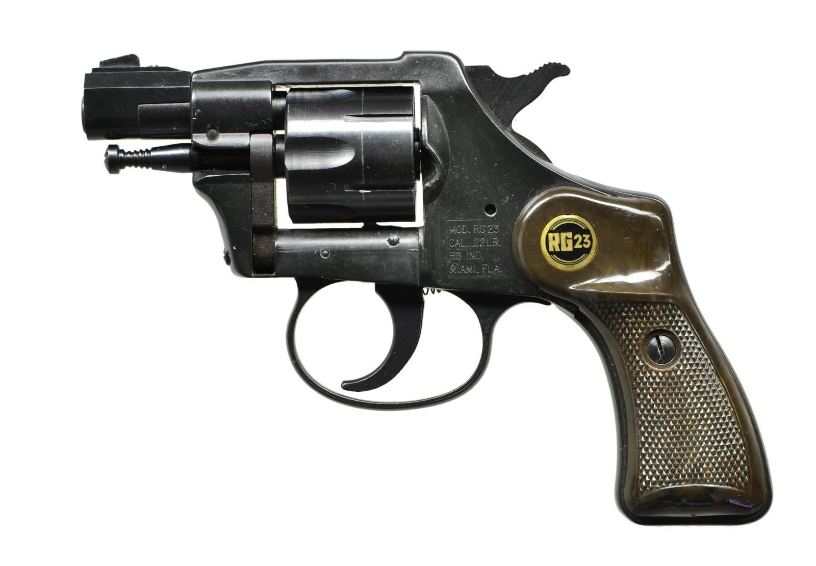 2) RG INDUSTRIES RG23 DOUBLE ACTION REVOLVER. Cal. 22 LR. S# 213387. Bbl. 1.75". 6 shot, traditional double action revolver. Aluminum frame w/ steel barrel & cylinder. Blued finish. Black & gold RG23 medallion on 2-pc brown plastic checkered grips. Fluted cylinder. Front blade & fixed rear notch sights. Flat serrated top strap & serrated hammer spur. CONDITION: finish is fairly complete & consistent w/ normal signs of carry & use. Grips in very nice condition w/ signs of light use. Bright bore w/ descent rifling. (22-3834/JZ). MODERN. $200-300.