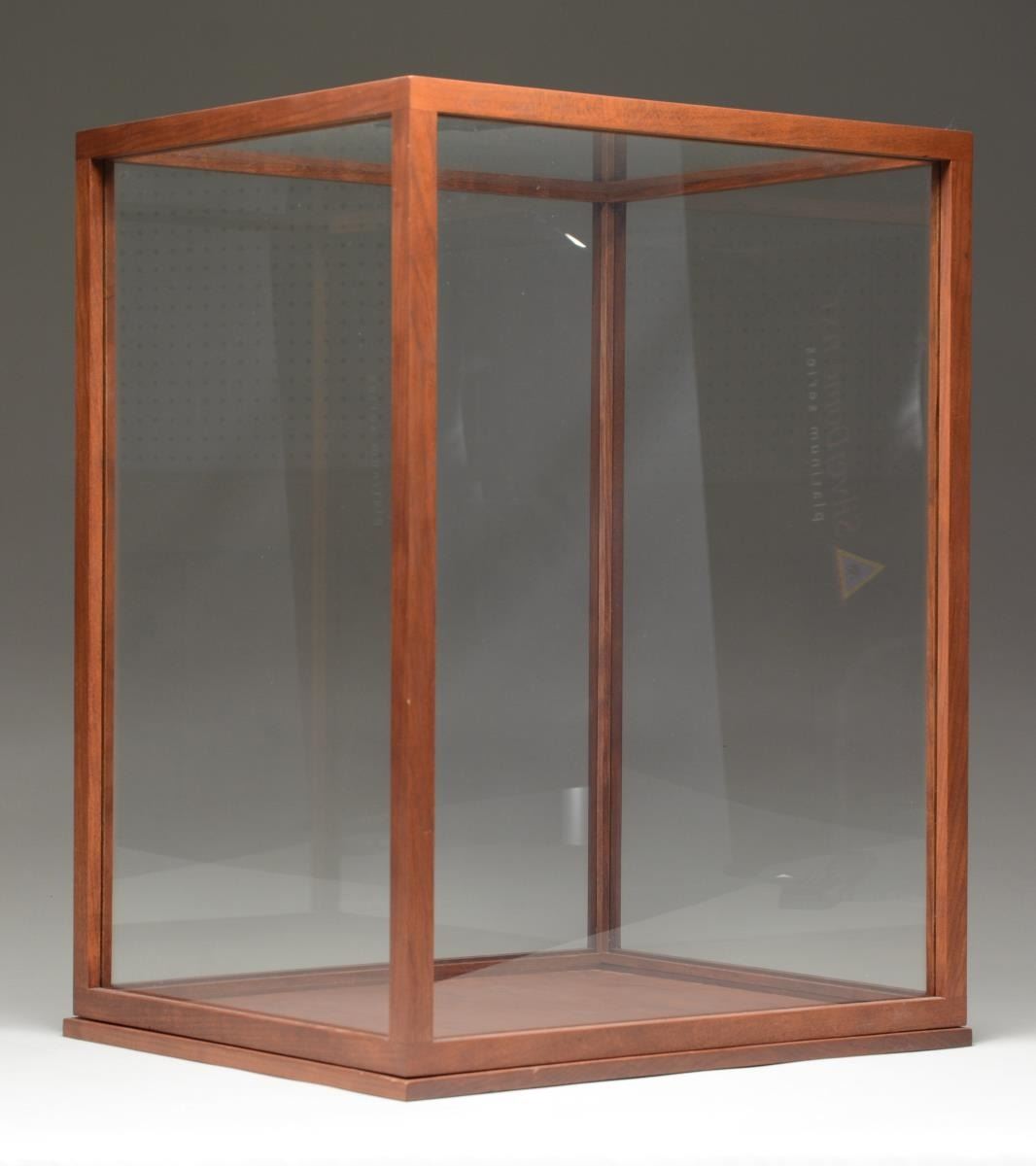 A beautiful, custom-made, modern walnut & glass display case measuring 17 3/4" x 15 1/8” x 23 1/2" high. The case lifts off the base for access to the interior. It is an exceptionally well-made case that would compliment a quality item in any room of the house. CONDITION: case is like new with very light wear. (02-20149-2/BF). $150-300.