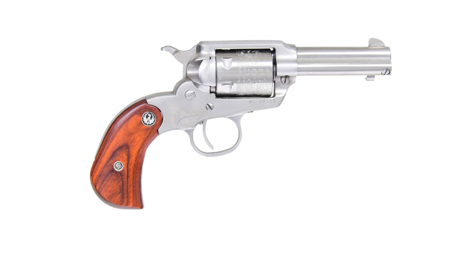 MODEL 00915 SAREVOLVER WITH MATCHING FACTORY BOX. Cal. 22 LR. S# 95-00561 (2013). Catalog No. KSBCBH-3 This revolver features a stainless steel finish with decorative scrollwork on the cylinder. Manufactured in 2013 with a 3-inch barrel. Fixed sights. The trigger is stainless, and the hammer is also stainless. The frame is of standard configuration. The cylinder holds six rounds and is not fluted. The grips are smooth wood with the Ruger emblem. UNATTACHED ACCESSORIES: Factory box and instruction manual. CONDITION: Overall condition is near excellent with approximately 99% of the original finish remaining on the barrel and frame. The grips are in near excellent condition with minimal wear. The bore is bright with strong rifling. MODERN (24-3007/MD) $300-500.