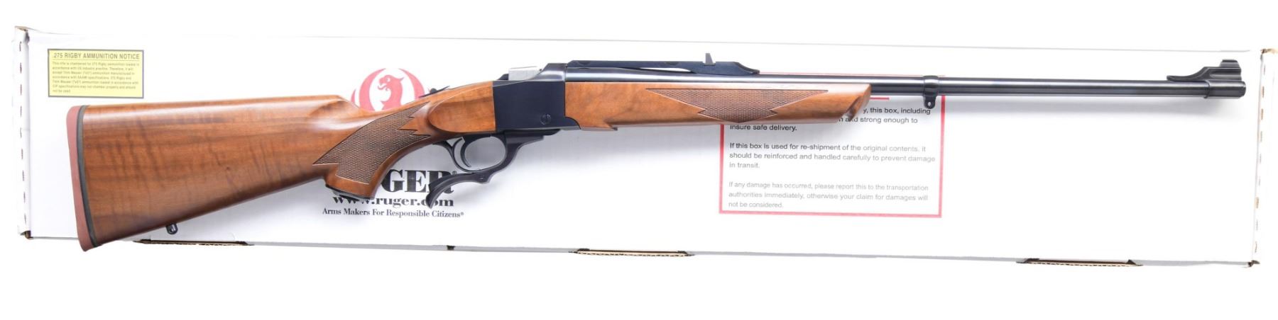 SINGLE SHOT RIFLE WITH MATCHING FACTORY BOX. CAL. 275 RIGBY. S# 134-47013 (2016). Blued finish with 24-inch barrel. Equipped with a bead front sight and an express rear sight. Falling block action with blued lever. Checkered Alex Henry forearm and checkered pistol grip buttstock with a metal grip cap. Factory red rubber pad. UNATTACHED ACCESSORIES: Factory box. CONDITION: Overall near excellent. Barrel retains approximately 95% original blued finish. Frame retains about 95% of the original blued finish. Forearm and buttstock show light handling marks with crisp checkering. Bore is bright with strong rifling. MODERN (24-3326/MD) $600-$900.