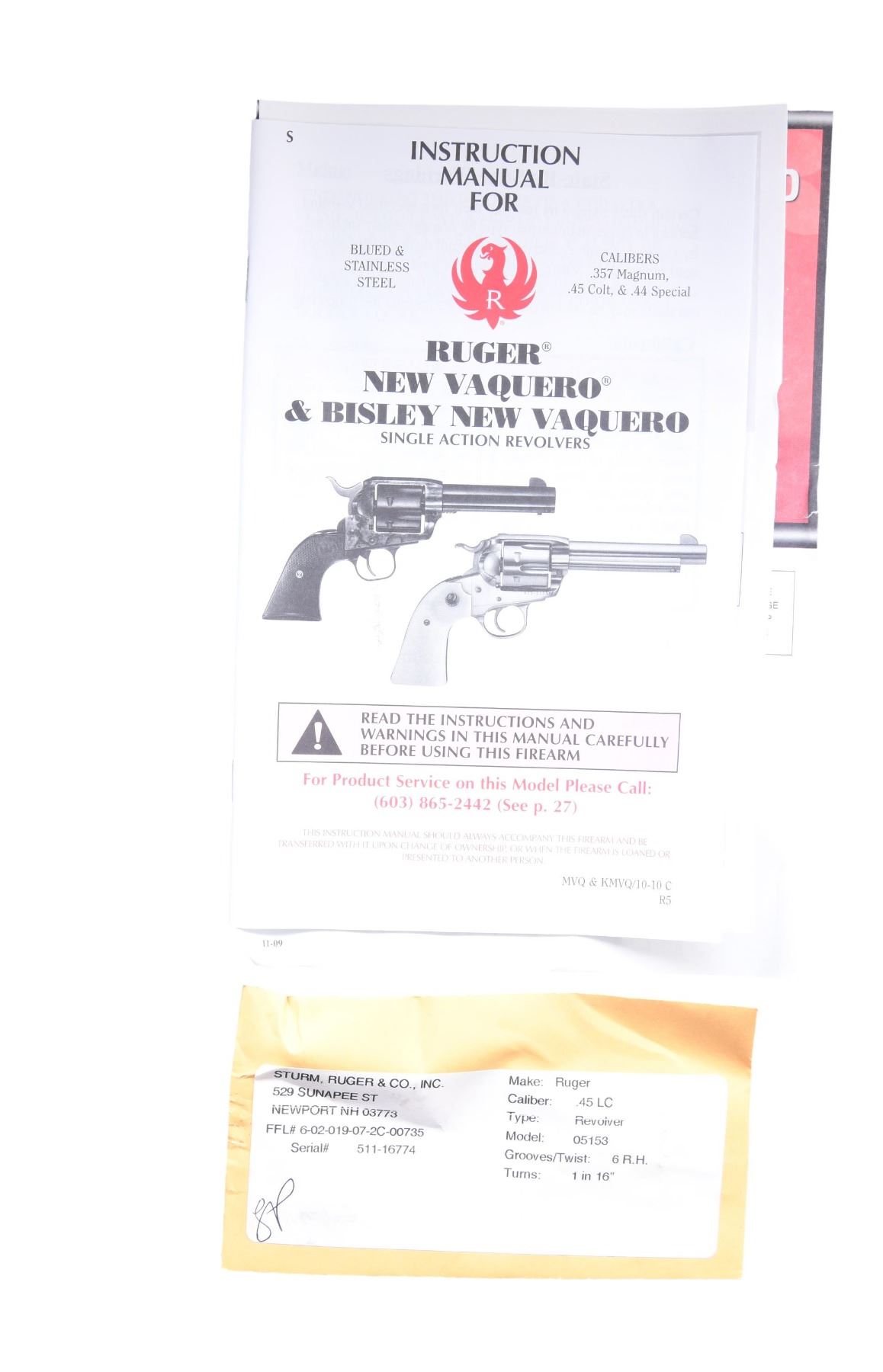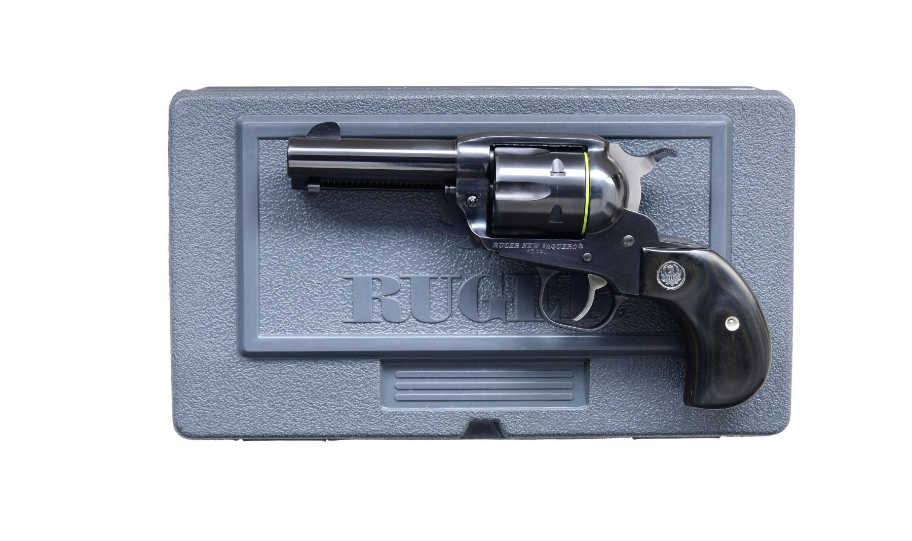WITH MATCHING NUMBERED BOX. Cal. .45 Colt. S# 511-16774. Mfg. 2011 as Model 05153 / Catalog No. NVBH-453. This Ruger Vaquero features a blued finish. It has a 3.75-inch (3 3/4-inch) barrel with a fixed front sight and a notch rear sight. The trigger is a standard smooth trigger, and the hammer is a standard spur hammer. The frame is the standard Vaquero configuration. The cylinder is fluted and holds 6 rounds. The grips are smooth laminated wood with Ruger medallions. UNATTACHED ACCESSORIES: factory box, manual, and original paperwork. CONDITION: overall, the revolver is in near excellent condition. The barrel retains approximately 98% of its original blued finish, and the frame retains about 97% of its original blued finish. The grips are in excellent condition. The bore is bright and sharp. (24-2960/MD). MODERN. $300-500.