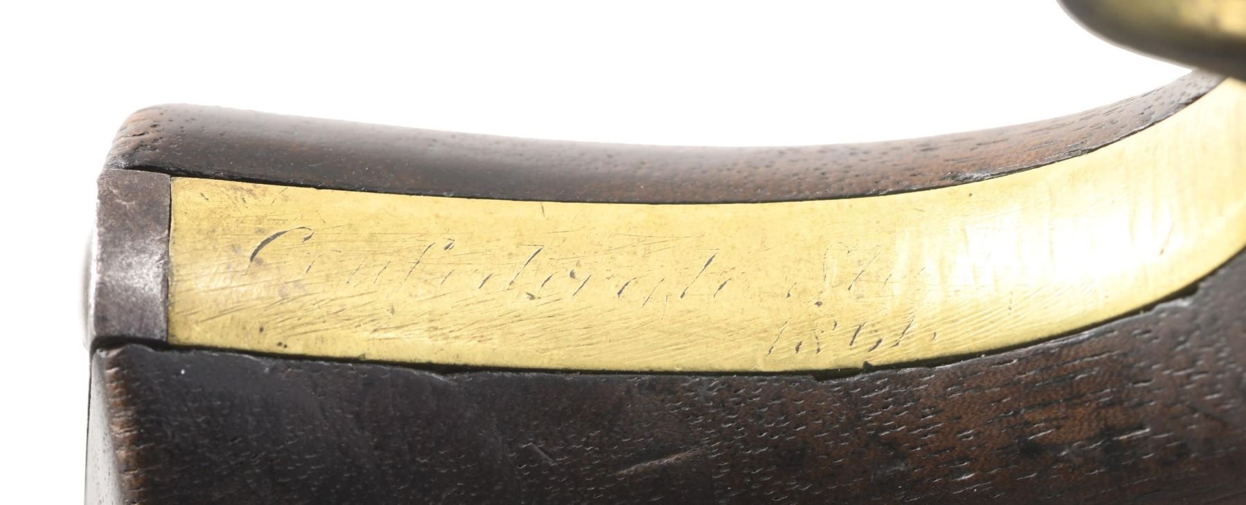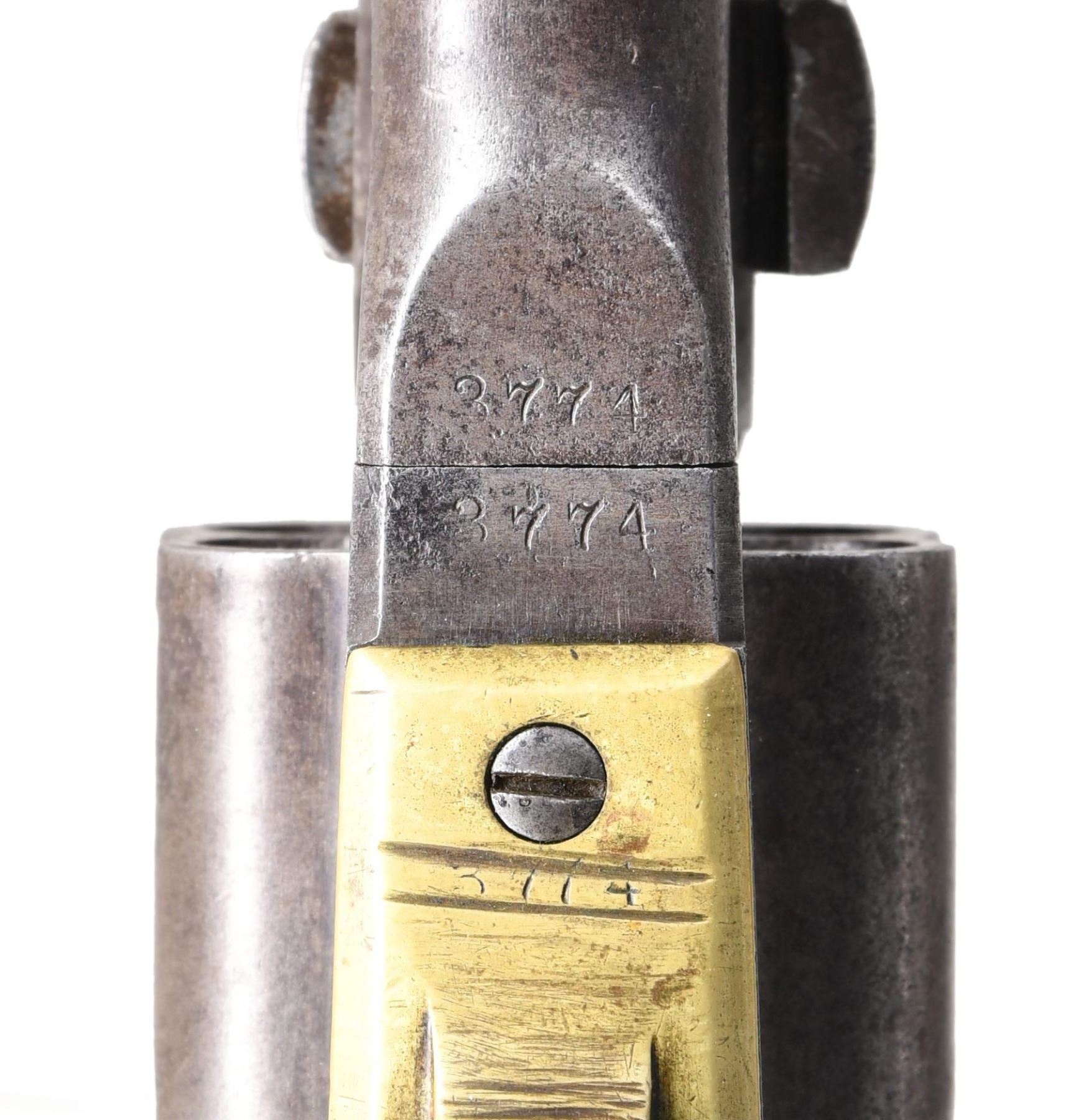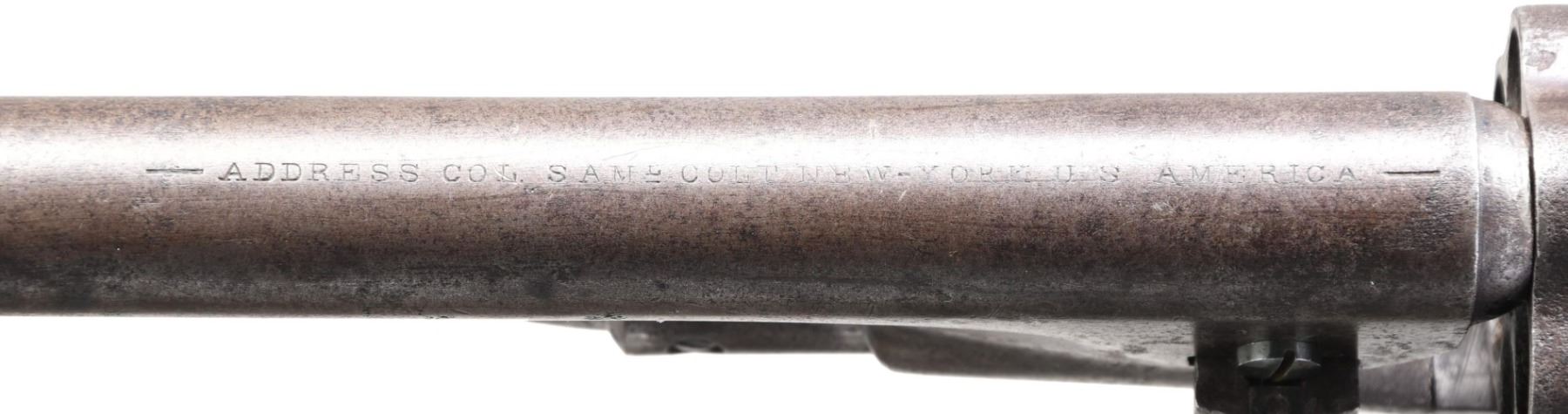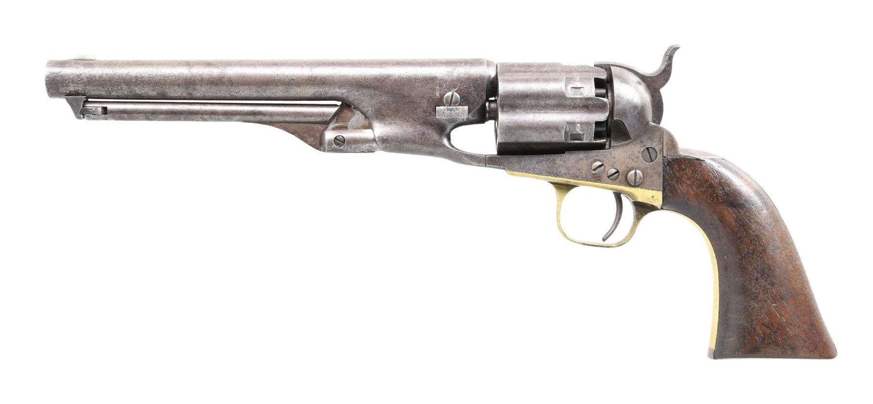COLT FLUTED ARMY REVOLVER. Cal. 44. S# 3774. This revolver was part of a pair with S# 3770 which is housed in the American Civil War Museum in Richmond, VA. It was donated prior to the turn of the century by Admiral Raphael Semmes according to museum accession ledger which states "Revolver used by Admiral Raphael Semmes during the Civil War. Presented by him to Commissioner James M. Mason in London in May of 1865". Colt factory letter shows S#s 3770 & 3774 shipped to Williams, Peters Company [Peter Williams], Richmond, VA, April 15, 1861, 3 days after the firing on Ft. Sumter. Revolver is in standard configuration of other model 1860 fluted army revolvers, blue & color case hardened with 7.5" round barrel, nickel silver blade front sight and 1-line "New-York U.S. America" address. Left side of frame has a small "COLTS PATENT". Frame is 4-screw type cut for shoulder stock with flat head hammer screw. The brass trigger guard and blued steel back strap contain a 1-pc walnut grip. Single letter inspector marks are observed on some parts. Cylinder is fluted with six chambers and has 1-line patent in one flute. Revolver was inscribed "Confederate States Ship Sumter / 1861" inside gripframe & "J.M. Mason London 1865" on trigger bow. Inscription has been obliterated with file cutting both vertically and horizontally. There is enough partial text remaining to match inscription on SN 3770 it's mate which resides in the collection of the American Civil War Museum in Richmond and is in pristine condition. The inscription on S# 3774 has been deliberately removed, but enough is there that there is no doubt it has the identical inscription and was one of a pair. The reason for the inscription being removed is unknown, but it is unquestionably one of the last Colts shipped to the South, carried by Confederate Admiral Raphael Semmes, and presented to Confederate commissioner James Mason at war's end. There is not another Colt revolver with better Confederate history & provenance from 1861 to 1865 in private hands. UNATTACHED ACCESSORIES: file of research & correspondence, 2024 appraisal report of authenticity. CONDITION: good-very good. Complete, all matching and original, traces of finish, mechanically fine, good rifled bore. PROVENANCE: Shipped by Colt to Williams, Peters company [Peter Williams] April 15, 1861; "Confederate States Ship Sumter 1861" and so engraved; J. M. Mason was given pistol (as a pair) in London 1865 and so engraved ; John Lignnau, Lott, TX collection (TGCA top collector of Confederate revolvers, etc); Damon Mills, Montgomery, AL dealer bought Lingnau Estate Arms collection; Thomas "Jim" Maconkey, Landrum, SC (1944-2018) 1997; William L. Beard (1941-2024) received revolver from widow Gail Maconkey 2018-2019. (01-25602/JS). ANTIQUE. $20,000-30,000.