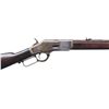 MODEL LEVER ACTION RIFLE. Cal. 44-40. S# 102943A. Bbl. 24 octagon to rnd., with sporting sights. Button mag. Blue finish, with case colored action. Walnut forearm and straight grip stock, with crescent steel trapdoor buttplate. Mfg. in 1882. UNATTACHED ACCESSORIES: Cody Firearms Museum record stating "Rifle/ Barrel Shape: 1/2 Octagon/ Plain trigger/ 1/2 magazine/ Casehardened/ Receiver in warehouse on October 28, 1882/ Shipped from warehouse on October 28, 1882, order number 353". CONDITION: bbl. shows an even brown patina. Action has a mottled gray/brown patina appearance, with spots of light pitting. Hammer shows traces of case colors on its sides. Original wood finish has an age darkened appearance, showing scattered scratches & marks. Mechanically fine, lever screw is a replacement. Bore is generally bright, with strong rifling, showing spots of very light pitting. (01-27047/DS). ANTIQUE. $3,000-4,500.