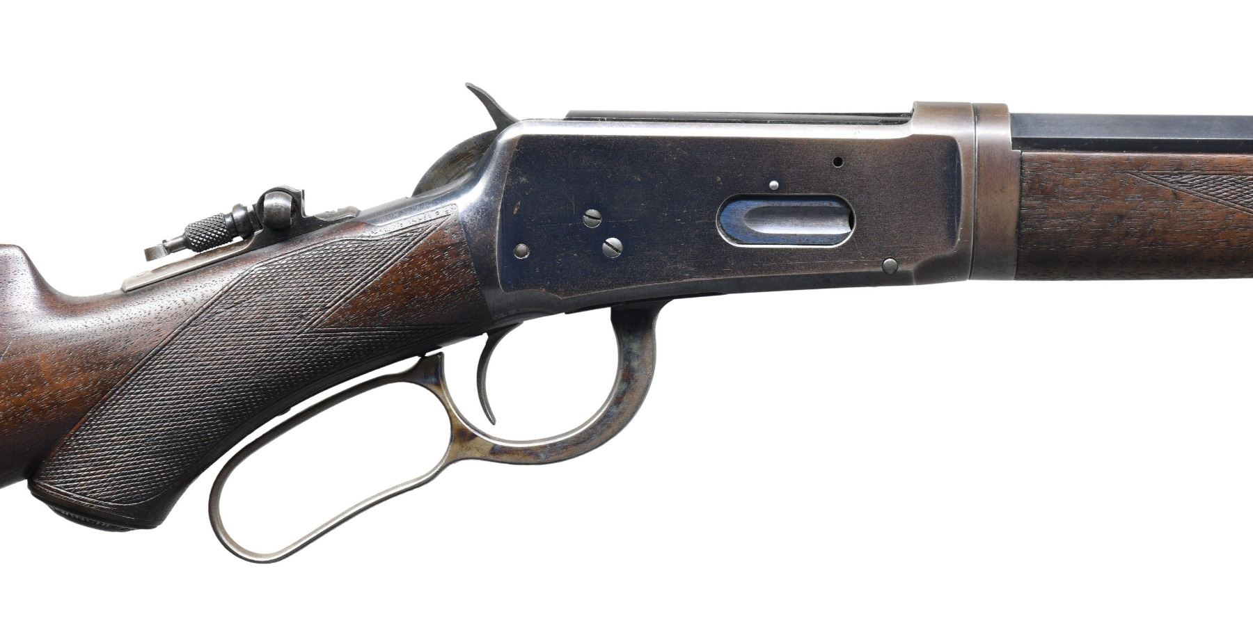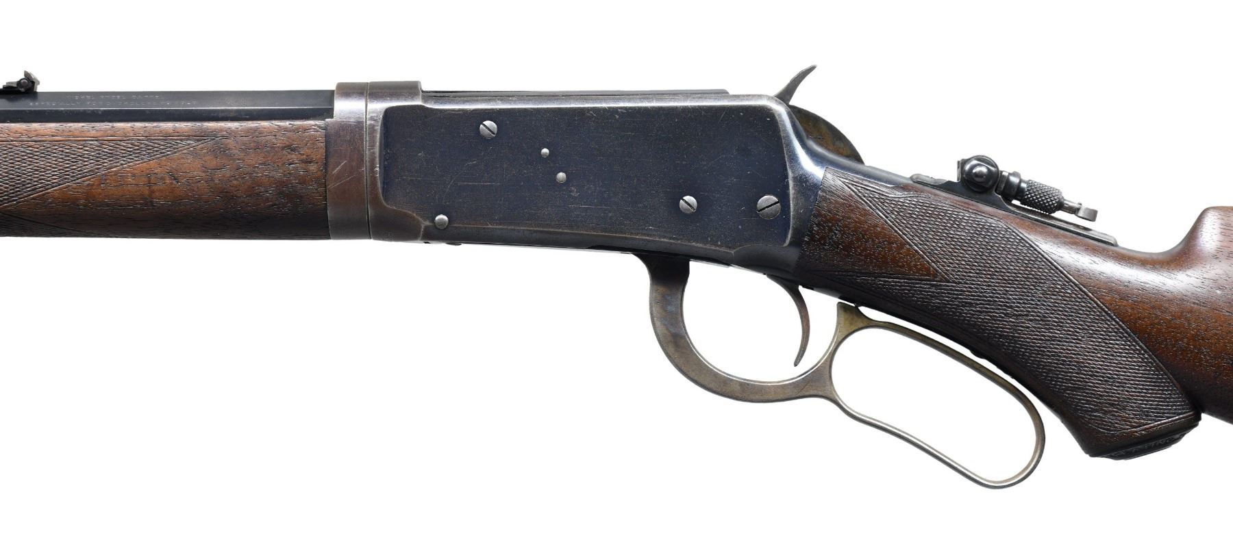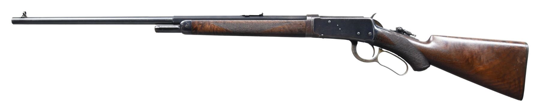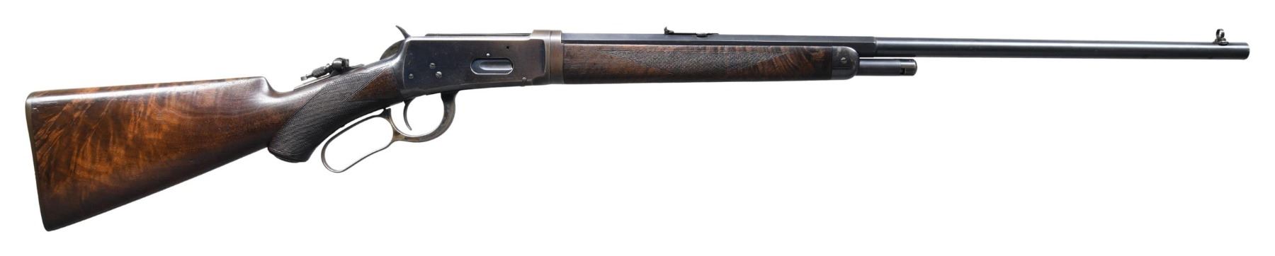 DELUXE TAKEDOWN LEVER ACTION RIFLE. Cal. 30 WCF. S# 62294. Bbl. 26" octagon to rnd. takedown style. globe front sight, 34-B Express rear sight and combination tang sight. 1/2 length takedown mag. Blue finish with case colored hammer and lever. Forearm and hard rubber capped pistol grip stock of XX fancy black walnut, with hard rubber shotgun buttplate. Stock and forearm have factory style H hand checkering. Left inside of lower tang is marked with assembly # "7431", followed by "RB", and "OH". Top tang channel of stock has matching markings. UNATTACHED ACCESSORIES: Cody Firearms record stating "Caliber: 30/ Barrel Type: 1/2 Octagon/ Trigger: Plain/ Checkered stock, Pistol grip/ Sights: Lyman front and rear/ 1/2 Magazine/ Shotgun butt, Rubber buttplate/ Takedown/ Oil Finish/ Received in warehouse on August 28, 1899/ Shipped from warehouse on August 28, 1899, Order number 34209". CONDITION: over 80% original blue, showing edge wear, with scattered scratches, marks, and small spots of very light pitting. Hammer and lever retain some visible case colors on their sides. Original wood has moderately worn finish and checkering, showing numerous scratches, marks, and small dents. Mechanically fine. Bright bore, retains strong rifling. (25-3576/DS). CURIO. $6,000-8,000.