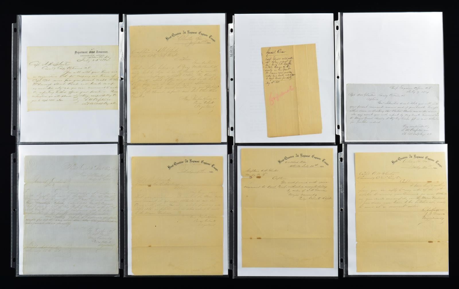 8) This document measures 5" x 8" & is on white lined paper. The document is titled, “Engineer Office AT August 10 1864”. The document is addressed, “Capt A. W. Gloster Commdg Eng Troops AT Captain” & reads, “Capt. Gloster will without delay report to Major General G.W. Smith to take charge of the work on his front. Lieutenant Davies, now with Gen’l Smith will report to you for duty.”. Document is signed, “Very Respectfully S.W. Presstman Lt Col Eng Troops”. Historic Note: Many of these documents contain unknown facts about the Battle of Atlanta. CONDITION: paper is generally in solid condition. There are no notable tears in the documents. Writing is generally clear & in a good hand. Most letters can easily be read. (02-15341-4/BF). $1,200-1,600.