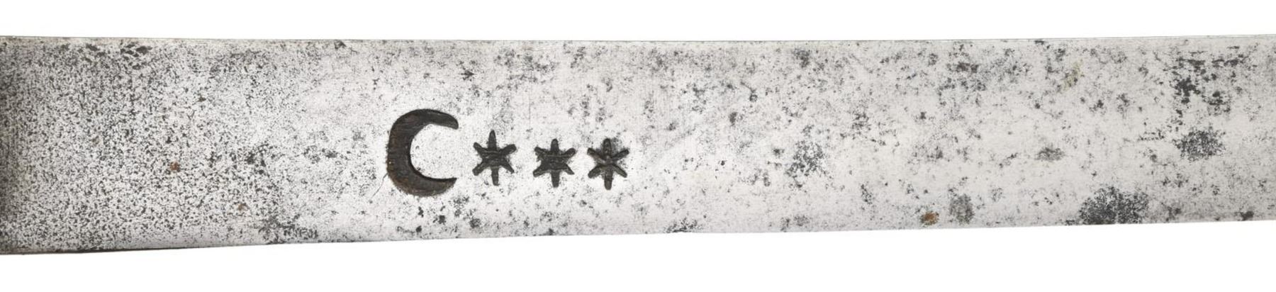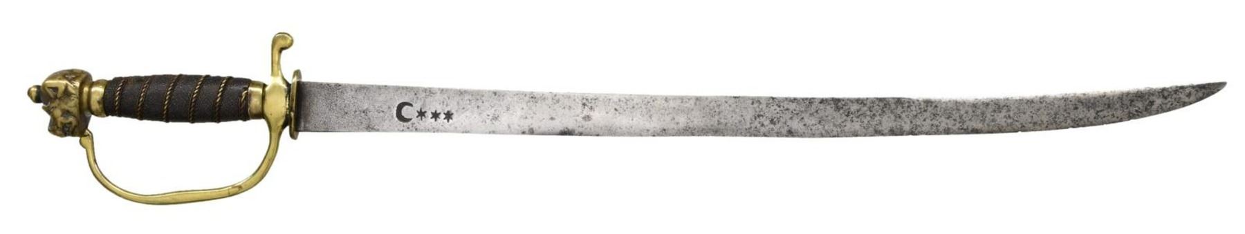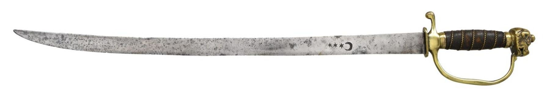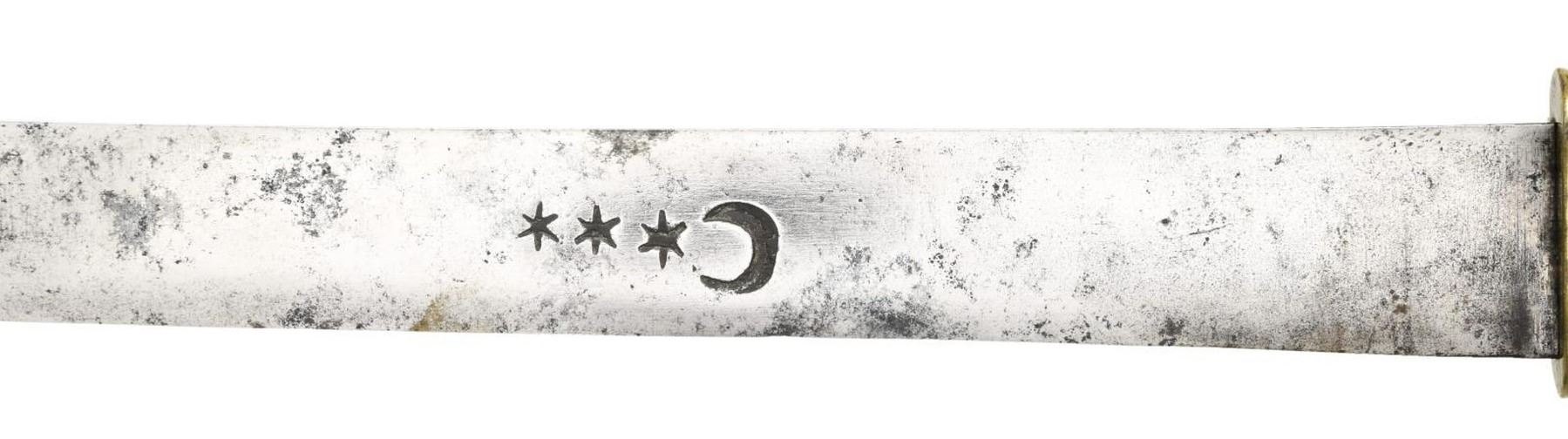 Overall length: 28 1/4". Blade length: 22”. This sword has an early blade with what may be a later hilt. Perhaps a revered family blade was re-hilted in the 19th century. Plain, flat blade stamped on both sides with a crescent moon and 3 stars with 6 points. Brass hilt with a simple plain guard and slightly downturned quillon. Plain knuckle bow enters the lower jaw of the dog head pommel. Wire-wrapped sharkskin grip. No scabbard. CONDITION: blade has a medium gray, cleaned patina with areas of cleaned pitting. The hilt has been cleaned but has begun to acquire a mellow brass patina. Grip shows light wear with minor losses. (02-20088/BF). $600-900.