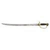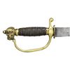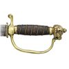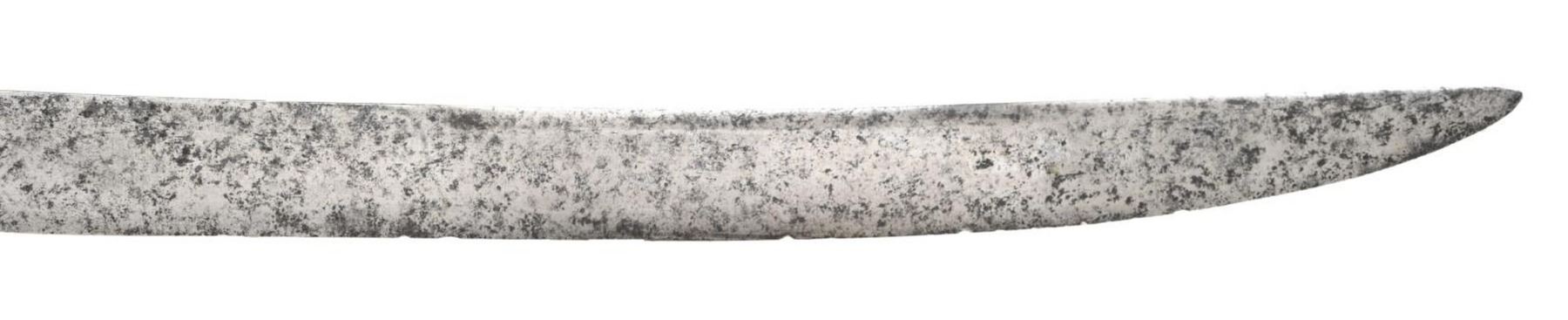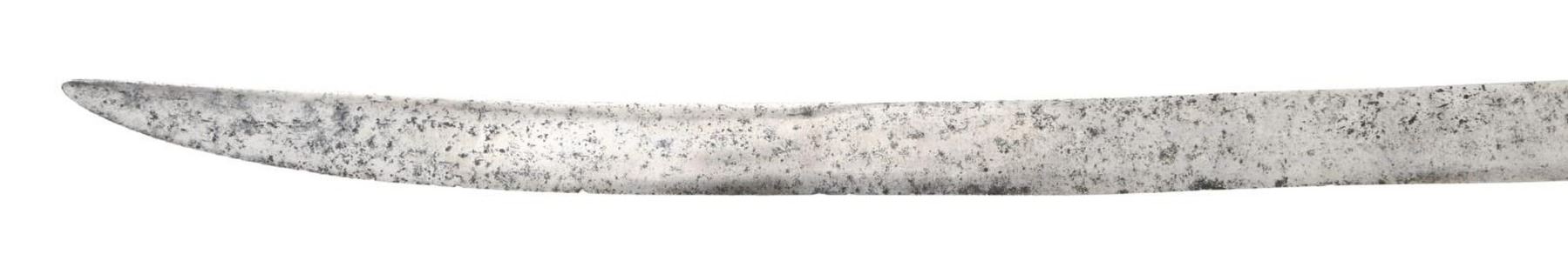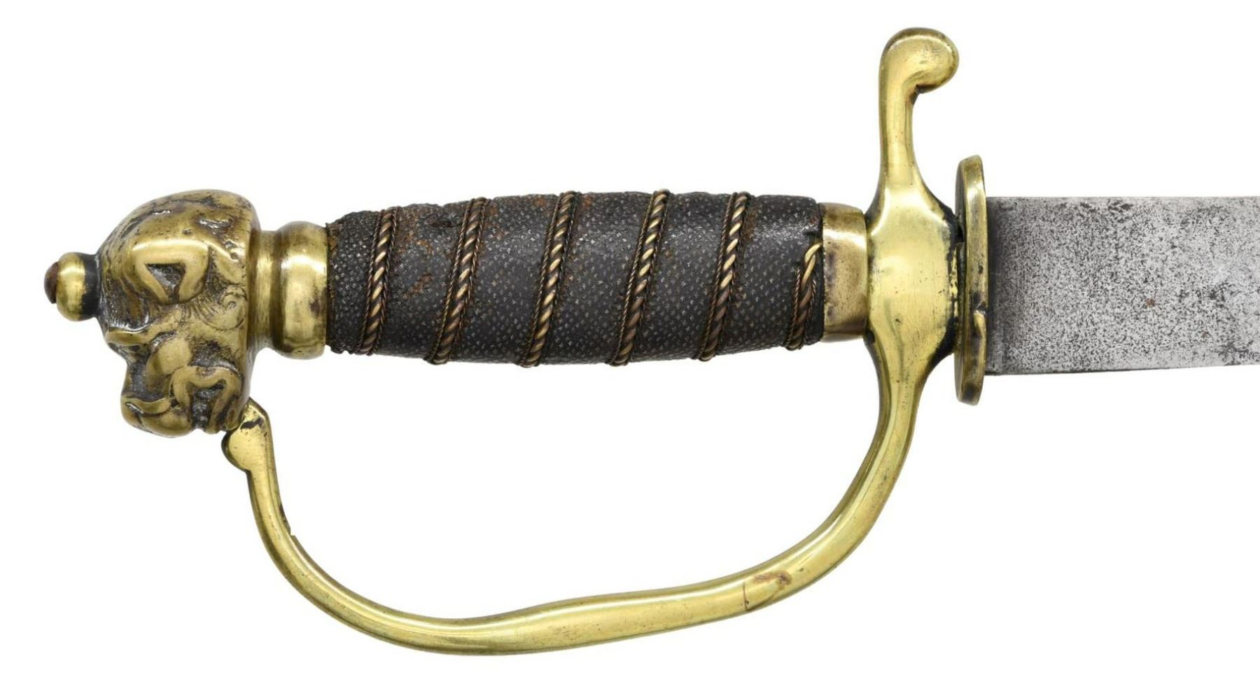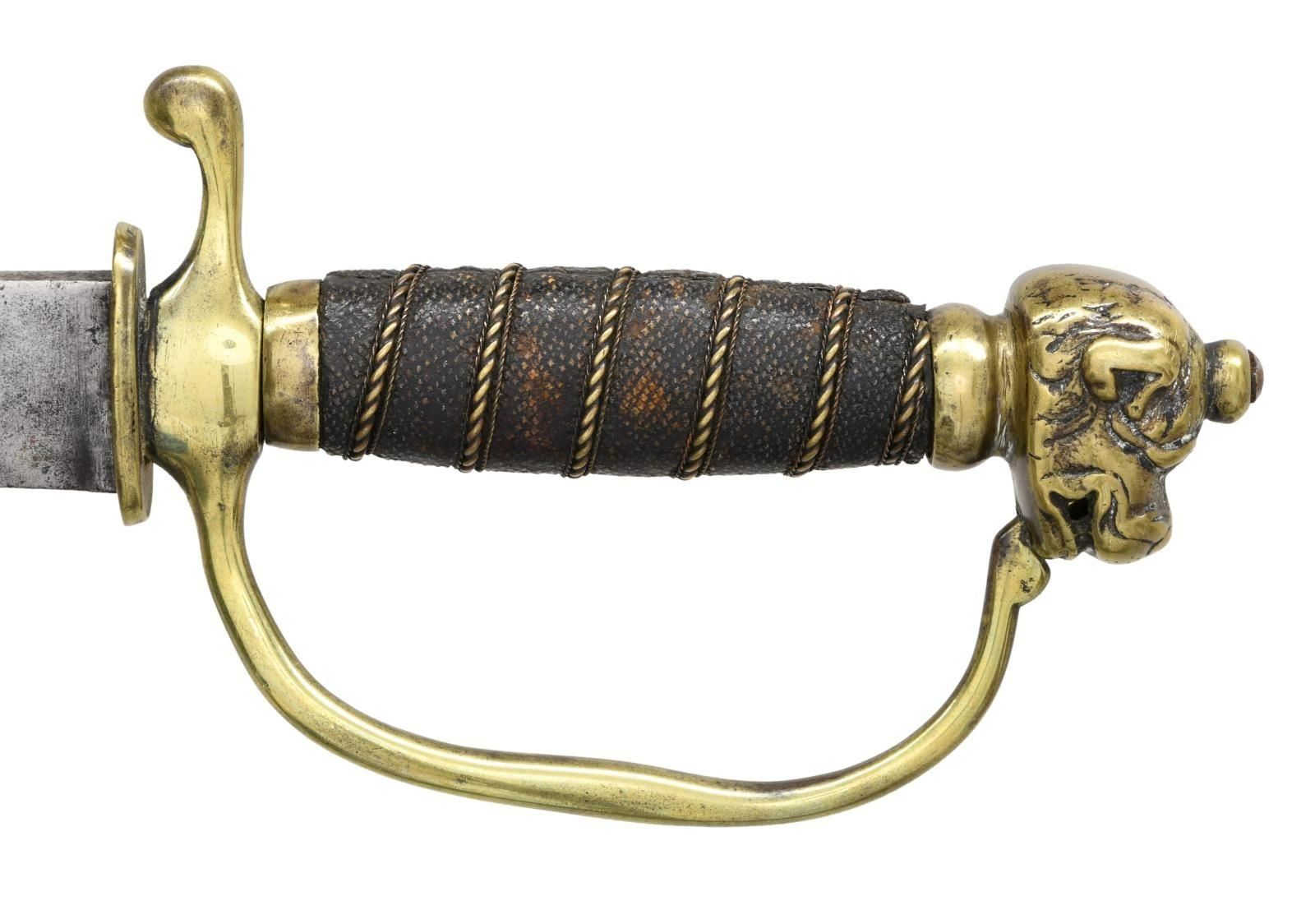 Overall length: 28 1/4". Blade length: 22”. This sword has an early blade with what may be a later hilt. Perhaps a revered family blade was re-hilted in the 19th century. Plain, flat blade stamped on both sides with a crescent moon and 3 stars with 6 points. Brass hilt with a simple plain guard and slightly downturned quillon. Plain knuckle bow enters the lower jaw of the dog head pommel. Wire-wrapped sharkskin grip. No scabbard. CONDITION: blade has a medium gray, cleaned patina with areas of cleaned pitting. The hilt has been cleaned but has begun to acquire a mellow brass patina. Grip shows light wear with minor losses. (02-20088/BF). $600-900.