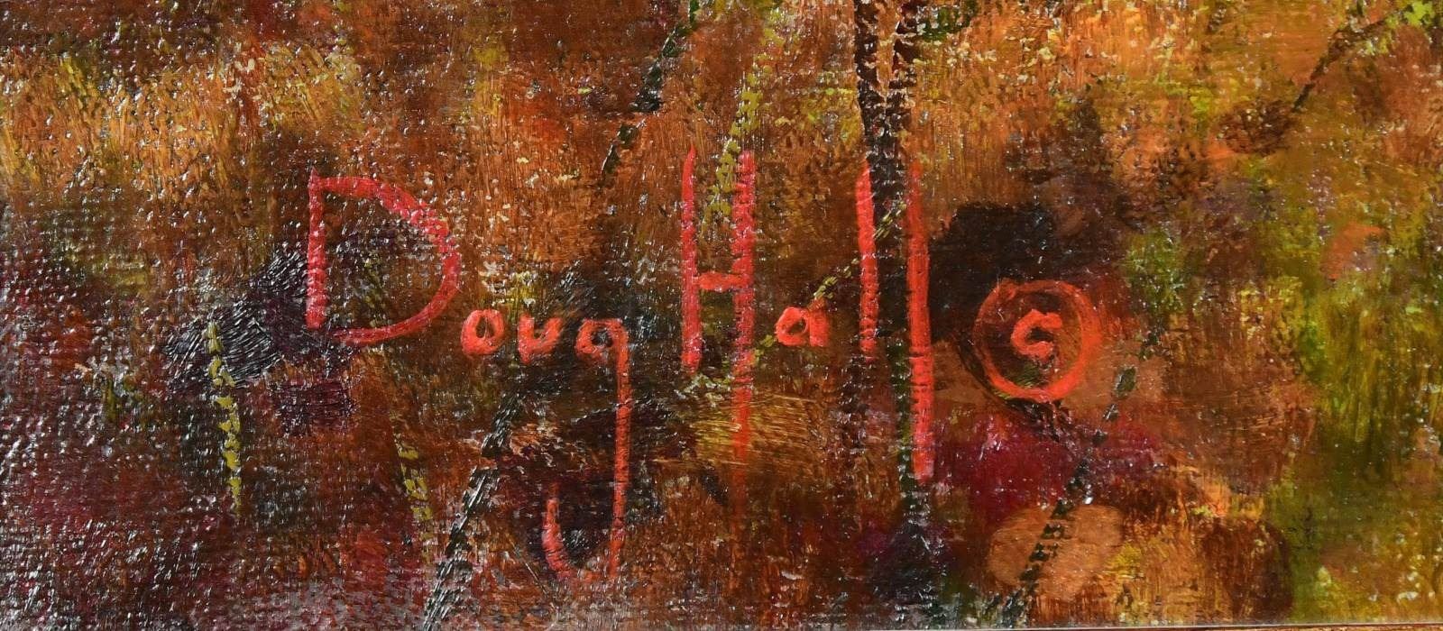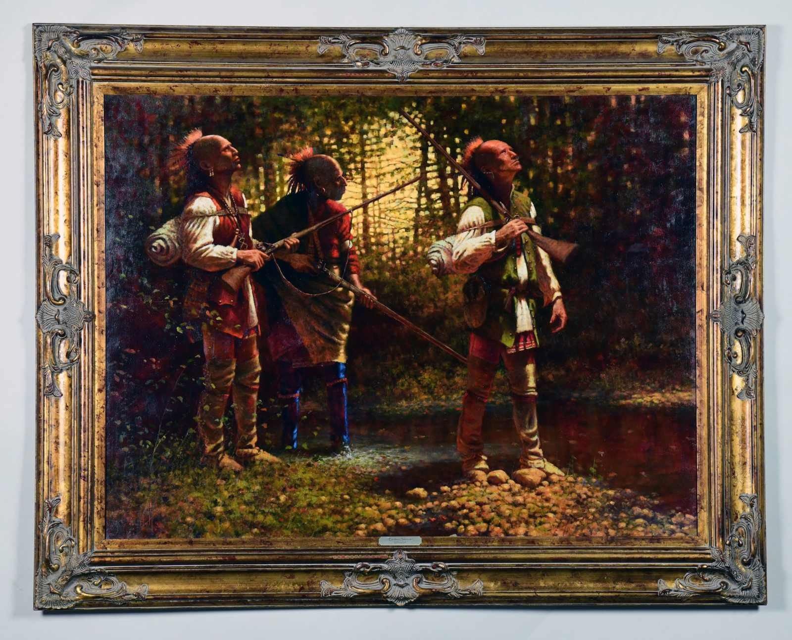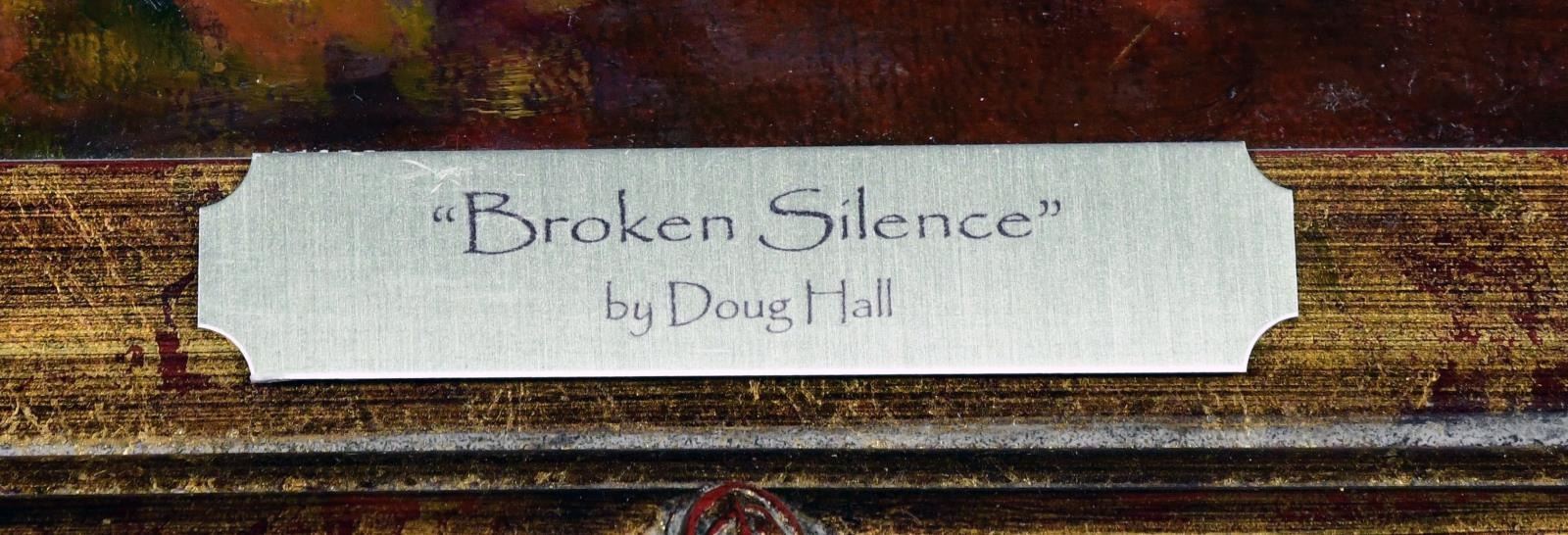 SILENCE". The study of early eastern woodland Native Americans is an interest of the artist who executed the original painting "Broken Silence". He produced Limited Edition and numbered fine art prints of this painting in varying smaller sizes. This gillee print is hand signed "Doug Hall©" lower left and is housed in a bronze gilt molded wood frame. SIZE: overall 47" x 58", sight 36" x 50". CONDITION: very fine original condition. PROVENANCE: Martin Lane Historic & Western Americana Lifetime Collection. (02-21388/TG). $1,000-3,000.
