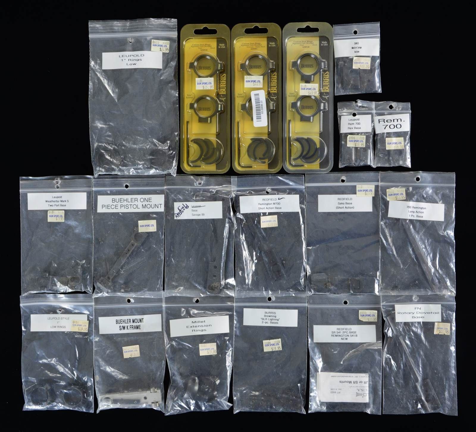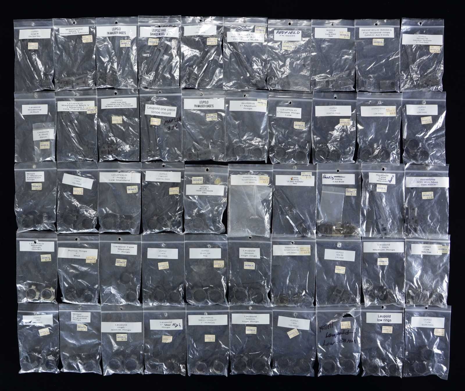Various makers with almost all being near excellent used items that are repackaged; relying on prior labeling. No attention to matte or gloss finishes. Quantities are singular unless noted. BASES: REDFIELD (10): Remington 1 piece 700 LA, Remington 1 piece 700 SA, Remington 2 piece 541, Savage 1 piece 99, FN Mauser 1 piece, FN Mauser 2 piece, 2 Sako 2 piece LA, 2 Sako 2 piece SA. LEUPOLD (18): FN Mauser 2 piece, 2 Savage 1 piece Model 99, 6 Remington 2 piece Model 700, Marlin 1 piece Model 336, 2 Weatherby 2 piece Mark V, Weatherby 1 piece Mark V, 2 FN Mauser 2 piece, Browning 1 piece BLR, Browning 2 piece 300 Win. Mag., Browning A-Bolt 2 piece. BURRIS (4): Browning 1 piece BLR, Browning 2 piece A-Bolt, Browning 1 piece 22 Auto, Browning 2 piece BLR. BUEHLER (2): 1 piece pistol, K&N frame S&W silver. MILLETT (1): Remington 1 piece Model 700. RINGS (1" unless noted): LEUPOLD (24): 10 Low, 4 Medium (1 is silver), 4 High, 2 Medium Extension, 1 Low 30mm, 2 Medium 30mm, 1 High 30mm. MILLETT (4): 1 Engraved Medium 1", 1 Low 30mm, 1 Medium 1" Extension, 1 Medium 1" Double Extension. BURRIS (6): 3 New 1" High, 3 Medium 1". PROVENANCE: The Collection of Gun Sport Ltd owned by Jon R. Thomas. (02-20856-22/NW). $650-900.