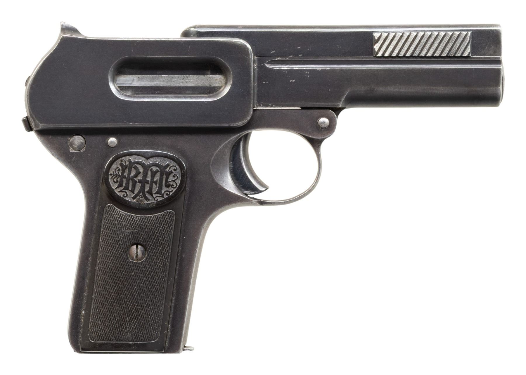Cal. 7.65mm. S# 240645. Bbl. 3 5/8". Model 1907 semi-automatic pistol mfg. by Dreyse. Left side of the upper assembly is marked "DREYSE/ RHEINMETALL ABT. SOMMERDA". Left side of the frame, upper assembly, and bolt are marked with a Crown/N commercial nitro proof, with the bolt also being marked "GERMANY". Metal components exhibit a blue finish overall, save for on the interior portions of the bolt, which are polished in-the-white. Frame is mounted with 2-piece "RMF" monogram checkered black hard rubber grips. Top of the bolt features a grooved sight channel, with an integral blade front sight and integral V-notch rear sight present on the upper assembly. All serialized parts are matching and include the frame, upper assembly, and the bolt. MAGS: 1 7-rd. CONDITION: metal components retain the majority of their original factory blue finish, showing some spots/areas of light to mild wear and thinning, some scattered handling marks, as well as some spots of light surface oxidation and pitting. Relatively bright bore, exhibiting consistent light to mild pitting, while retaining fair to good rifling throughout. Proper manual mechanics. Grips show mild smoothing, as well as scattered superficial marks from handling and storage, but otherwise remain sound. (25-5630/MLW). CURIO. $300-500.