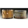 2) DRUM PARTS. Base for blue painted drum, diameter: 15 1/4", height: 10 1/2". Comes w/ 2 hoops. CONDITION: Fair overall as incomplete w/out heads or tighteners. Flaking finish, patina & lg. tears throughout. (02-16847/MD). $250-500.