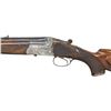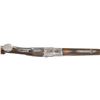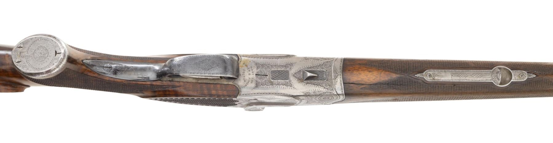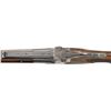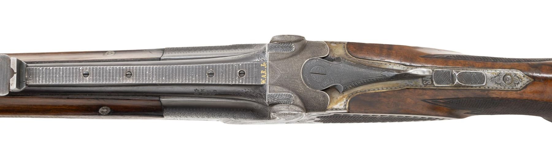 Cal. 30/30 Win. / 25/20 Win. S# 36404. The 26" O/U demi-bloc barrel set (Top in 30-30) is fitted with full length matted rib holding one standing one folding leaf rear sight and gold bead front with flip-up night bead. Maker's name and address is engraved on unmatted portion of rib and rear of rib is gold inlaid "W.A.R. Jr.". Rib has four holes drilled and tapped for scope base filled with plug screws. Barrels are stamped with German nitro proofs with 6.2/34 on bottom. Top marks inaccessible as top piece of forend can not be removed. Case hardened double Kirsten scallop back O/U boxlock action is fitted with non-automatic tang safety, raised rib tumbler end cocking indicators and selective single trigger. Action is engraved with about 70% coverage scroll within geometric borders, trigger plate is engraved "MADE FOR" "BAKER & KIMBALL" "BOSTON". Matching trigger guard is steel. Steel trap capped pistol grip buttstock made of very nicely fiddle figured and lightly marbled European walnut measures 14-1/8" over engraved and ribbed steel trap buttplate (trap covers holes for spare cartridges; two of each caliber). Stock also features well shaped shadow line right hand cheek piece, point pattern checkering at grip and a sling loop on toeline that matches that soldered to bottom of barrel. Side panels are also checkered and have broad chip carved boarders. Matching three piece ejector forend has Deeley release. MEASUREMENTS: STOCK: DAH: approx. 2-3/8". DAC: approx. 1-3/4". CAST: about 1/2" off. LOP: 14-1/8". WEIGHT: 7 lb. 12 oz. CONDITION: very good original. Barrels retaining about 70% original blue. Action has perhaps 20% case hardening color where protected and is mostly smooth silver. Stocks retain most of their original oil finish with many light marks and scratches. Checkering in moderately worn with heavy wear on forend. Bores are good to fine; mostly shiny with wear evident in top barrel. Mechanically good except top barrel ejector with not fire. An unusual and interesting combination gun made for the American market. The bottom of the forend has a 2 1/2" crack extending from the forend iron. (25-5013/MGM). CURIO. $3,000-5,000.