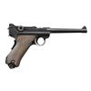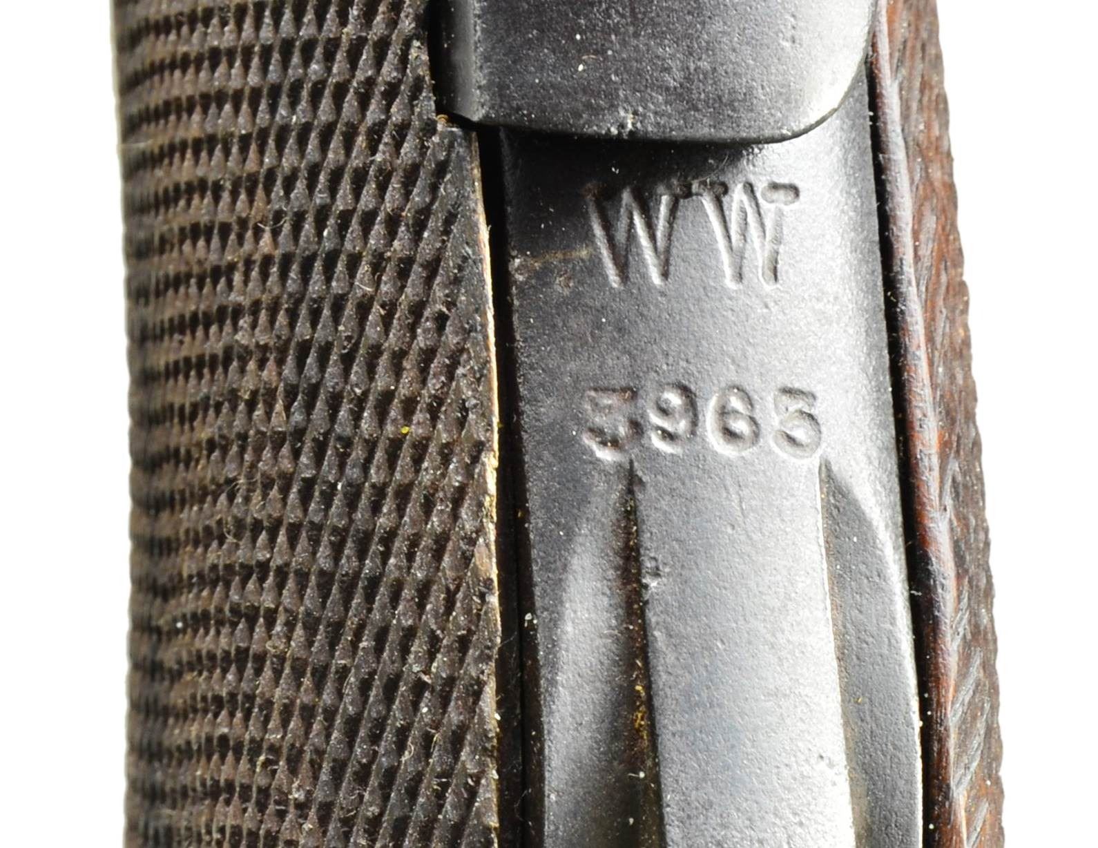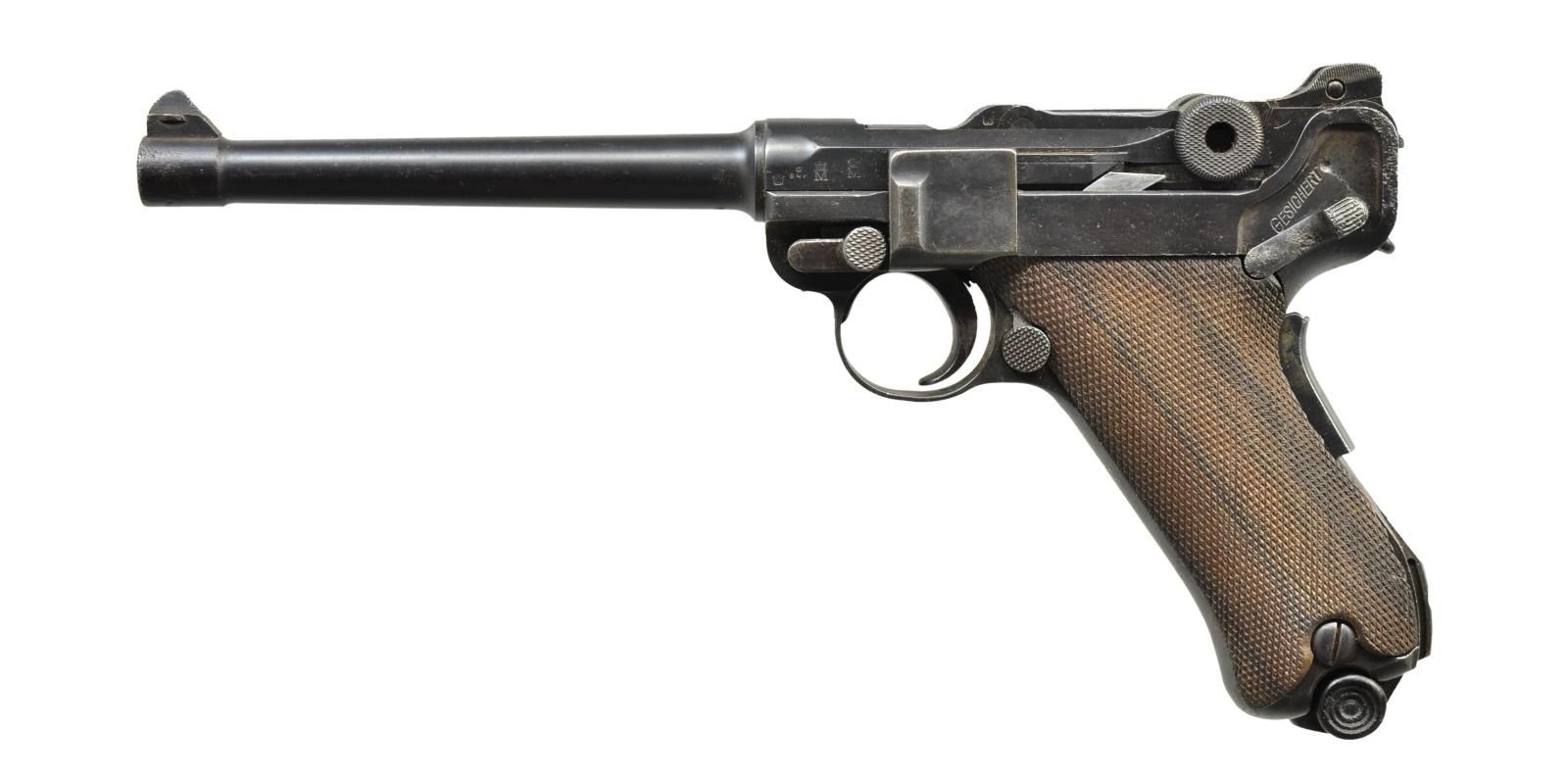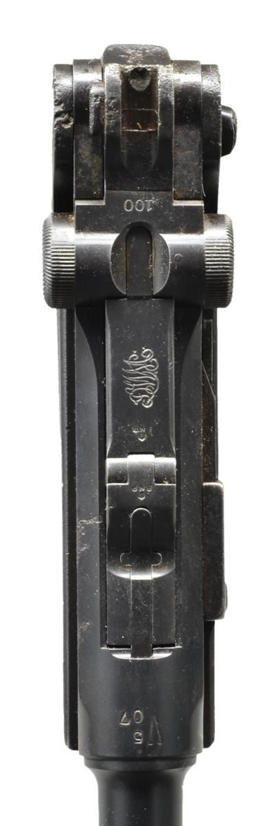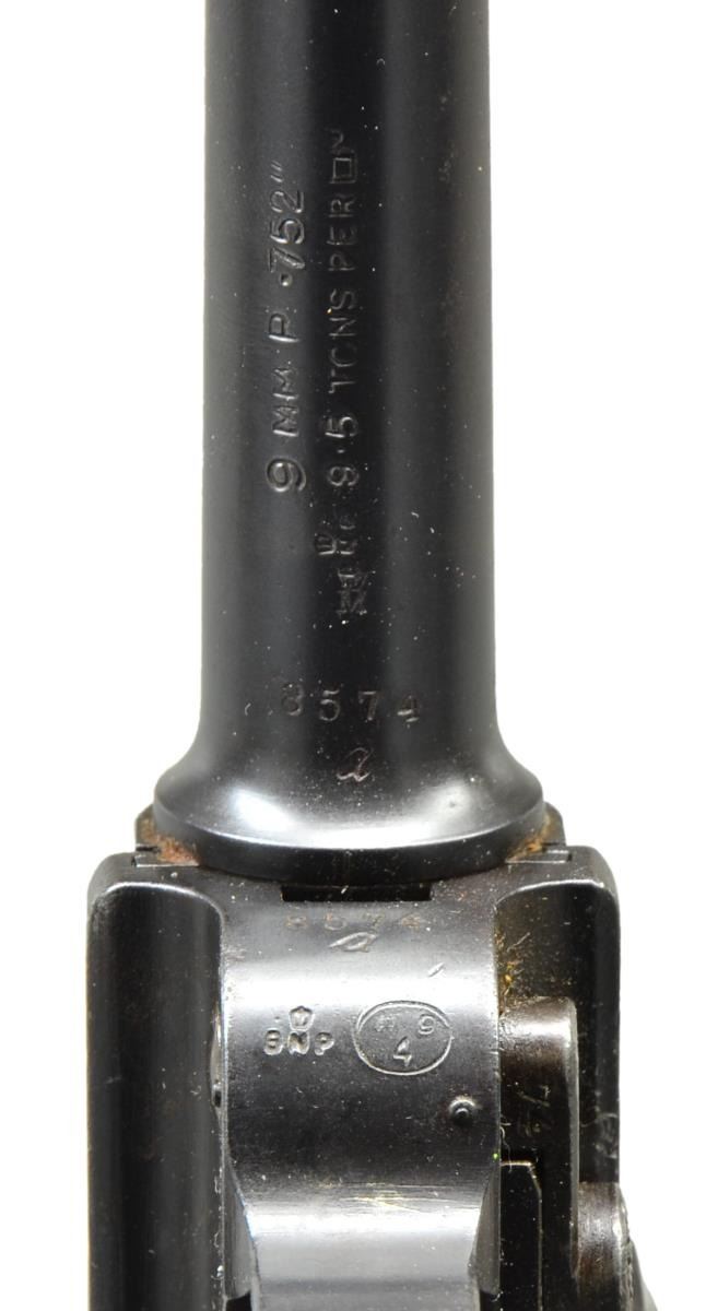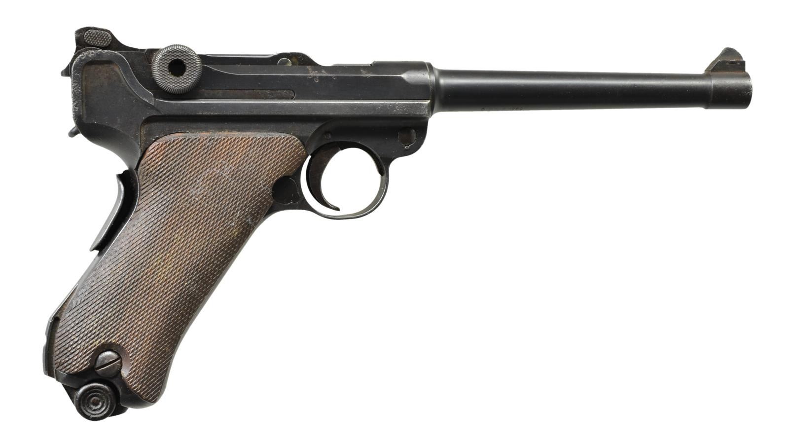Cal. 9mm Luger. S# 8574a. Bbl. 6" w/ British proofs & full S#. Crown proofs, crown M & crown BNP on bbl. plus left side of receiver. “V5/07” (unknown mark believed to be a post WWI police, or possibly militia unit mark) above chamber. Similar marks are known on other P.04 & P.08 pistols. WW/3965 (Werft zu Wilhelmshaven, pistol 3965) on backstrap between grip safety & stock lug. DWM scroll on center toggle link. Two position Navy rear sight on rear toggle link. British crown BNP proofs on toggle assembly & front of frame. Reworked “GESICHERT” in upper position; safe w/ lever in lower position. Grip safety & numbered parts on gun are matching; firing pin, hold open latch, sear & replacement checkered walnut grips are unnumbered. This pistol is featured on p. 1159 of The Borchardt & Luger Automatic Pistols by Joachim Gortz & Dr. Geoffrey Sturgess. MAGS: fair 8 rd. tin plated w/ wood base numbered 2828 perpendicular to concentric circled dimples. Magazine has pitting on body & very good wood base. CONDITION: good to very good arsenal reblue (no strawed parts) over scattered pitting that is more severe at back of upper frame & rear sight to include back of toggle. Pitting on safety lever having patina appearance. Very good appearing grips w/ nice wood grain on left; darker right w/ light wear. Bore is worn w/ light pitting. Mechanics are generally good but grip safety sticks due to grips & interior metal rubbing; proper functioning return spring. Broken spring on hold open latch; doesn't return to position. Interior of frame has distinct brown tone throughout. PROVENANCE: formally in collection of Dr. Geoffrey Sturgess. (22-353/NW). CURIO. $2,500-3,500.