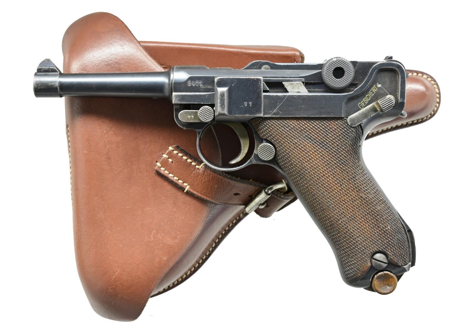 Cal. 9mm Luger. S# 5477n. Bbl. 4". Mfg. 1916; 140,000 units. All matching numbers including checkered walnut grips. Strawed sm. parts & appropriate internal areas in the white. MAGS: 1 tin plated 8 rd. w/ matching numbered wood base. Flaking plated on spine portion of upper half plus some sm. areas on front section near top. UNATTACHED ACCESSORIES: very good unmarked loading tool; near excellent brown reproduction holster w/ buckle & strap retention. Weiss branded along w/ "1917" & "P08". CONDITION: very good overall appearance w/ light high point wear near muzzle & on sideplate. Occasional spots of light oxidation such as in trigger area, face of muzzle, front sight, sideplate & right frame rail. Especially nice well fitted grips w/ minimal hand wear. Very good bore w/ faint hint of frosting. Very good straw colors w/ faint fading on safety lever. Nice all matching example. (21-661/NW). CURIO. $900-1,400.