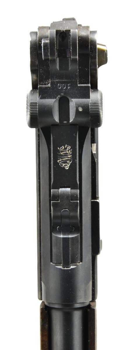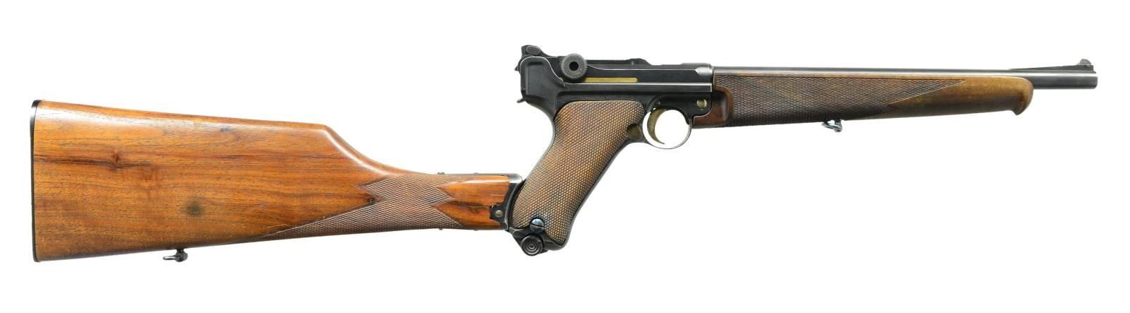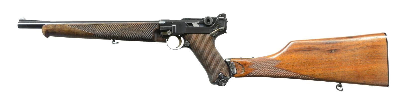 PISTOL. Cal. 30 Luger. S# 67. Bbl. 300mm (11 3/4"). Mfg. for commercial sales utilizing Navy Luger components. Front sight dovetailed bead on integral serrated ramp. Rear sight 100-200 Navy style on rear toggle rather than usual carbine sight on rear of bbl. No visible proof marks but Crown N & 67 on bottom rear of bbl. Interior of checkered walnut forend w/ schnabel that slides over frame extension has "GERMANY" export mark & 67; retained by screw swivel rather than wedge. Forend does not have recoil actuator mechanism. Items w/ 67 are forend hanger, forend, breech block, rear toggle, take down lever & trigger. Extractor marked "LOADED" w/ #91. Safety is in lower position w/ "GESICHERT" in upper position. Fire blued small parts including forend swivel (standard bluing on buttstock) & grip screws. Strawed frame sm. parts plus appropriate in the white interior areas. Standard rear toggle pivot is not large head Naval style. Sporting checkered walnut buttstock w/ grooved buttplate not having widows peak. Two screw attached iron w/ strawed latch lever; no marks or numbers. MAGS: 1 fair to good tin plated 8 rd. w/ wood base numbered 1388, Crown M proof & concentric circles in dimples. Flaking finish & cleaned oxidation. CONDITION: about near excellent overall appearance plus near excellent bore. Frame is slightly proud of grips plus right has wood added to back to better fit upper left frame recess w/ purpose to eliminate looseness that would otherwise occur at top of grip / frame juncture. Very nice carbine w/ longest possible sight radius. (22-359/NW). CURIO. $4,000-6,000.