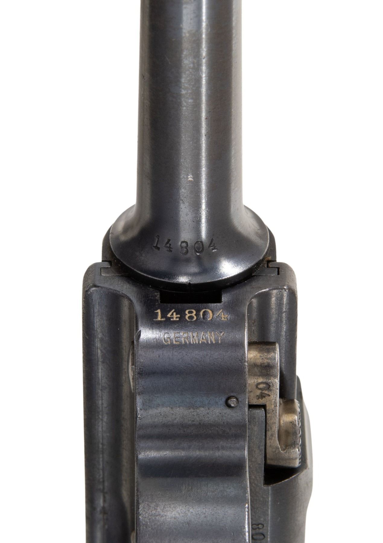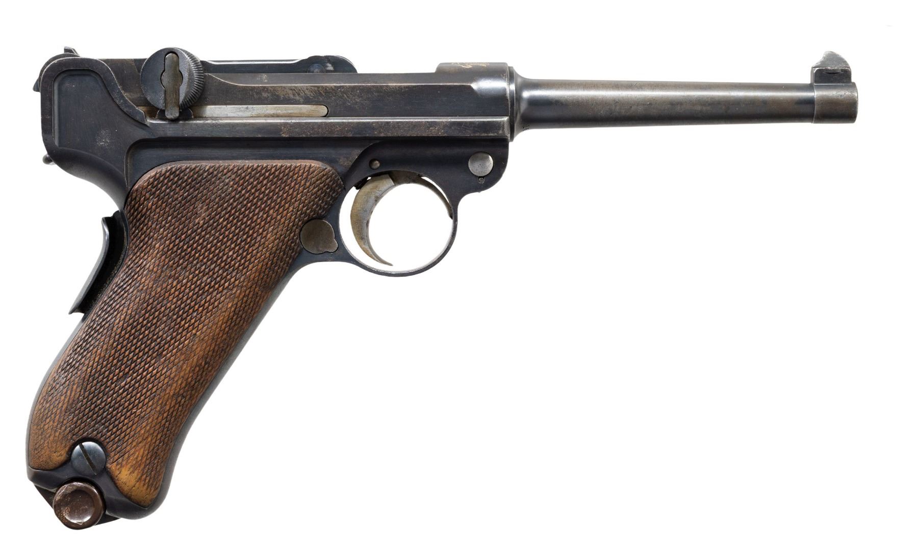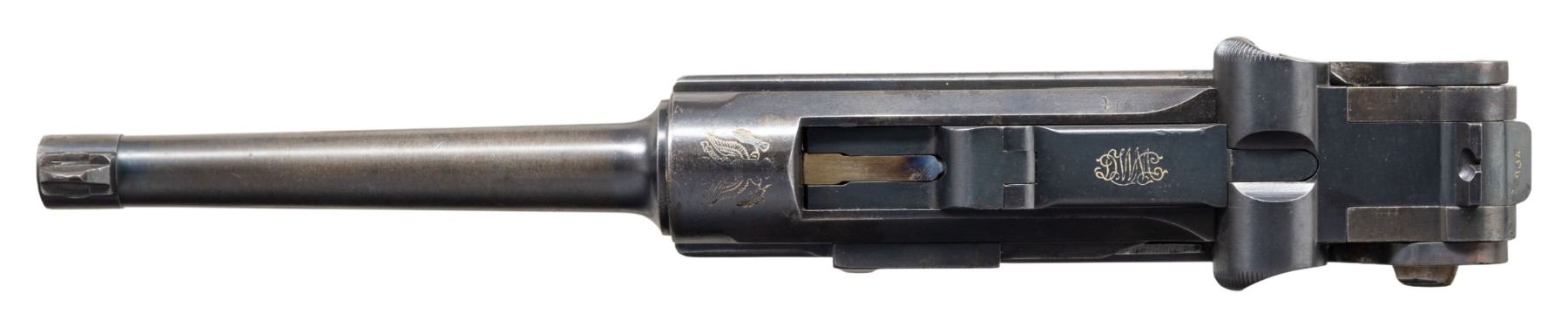 PISTOL WITH CASE. Cal. 7.65x21mm Parabellum. S# 14804. Bbl. 4 3/4". Model 1900 American Eagle Luger semi-automatic pistol mfg. by DWM for commercial sales within the United States. Top of the bbl. extension is marked with the Great Seal of the United States, with the intertwined DWM monogram marked on the toggle. Metal components exhibit an older reapplied blue finish overall, with some small parts exhibiting a reheated straw finish. Frame is mounted with 2-piece checkered wood grips, and features a grip safety. Interior of right grip panel is carved "WPO". Dovetailed blade front sight, with fixed V-notch rear sight. Dished toggles with anti-rebound arm on frame. All serialized parts are matching in the correct "hidden" commercial fashion, and include the frame, takedown lever, sideplate, trigger, grip safety, bbl., bbl. extension, breechblock, toggles, as well as the grips. MAGS: 1 (likely Swiss) plated 8-rd. mag., with brown pressed resin bottom. UNATTACHED ACCESSORIES: vintage wood display case, featuring a red felt lining. CONDITION: metal components retain large amounts of their reapplied blue finish, exhibiting areas of wear and thinning that show through to gray and brown patinas, scattered superficial handling marks, scattered spots of light to mild surface oxidation, as well as scattered areas with varying degrees of pitting (both above and below the finish) overall. Strawed parts retain large amounts of their finish, exhibiting areas of wear that show through to gray patina. Dark bore, exhibiting consistent dark moderate pitting, while retaining good rifling throughout. Grips show smoothing, as well as scattered marks and impressions from handling and storage. Case shows scattered marks from handling and storage, but otherwise remains sturdy and serviceable. (25-1203/MLW). CURIO. $800-1,200.