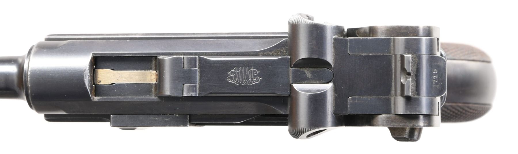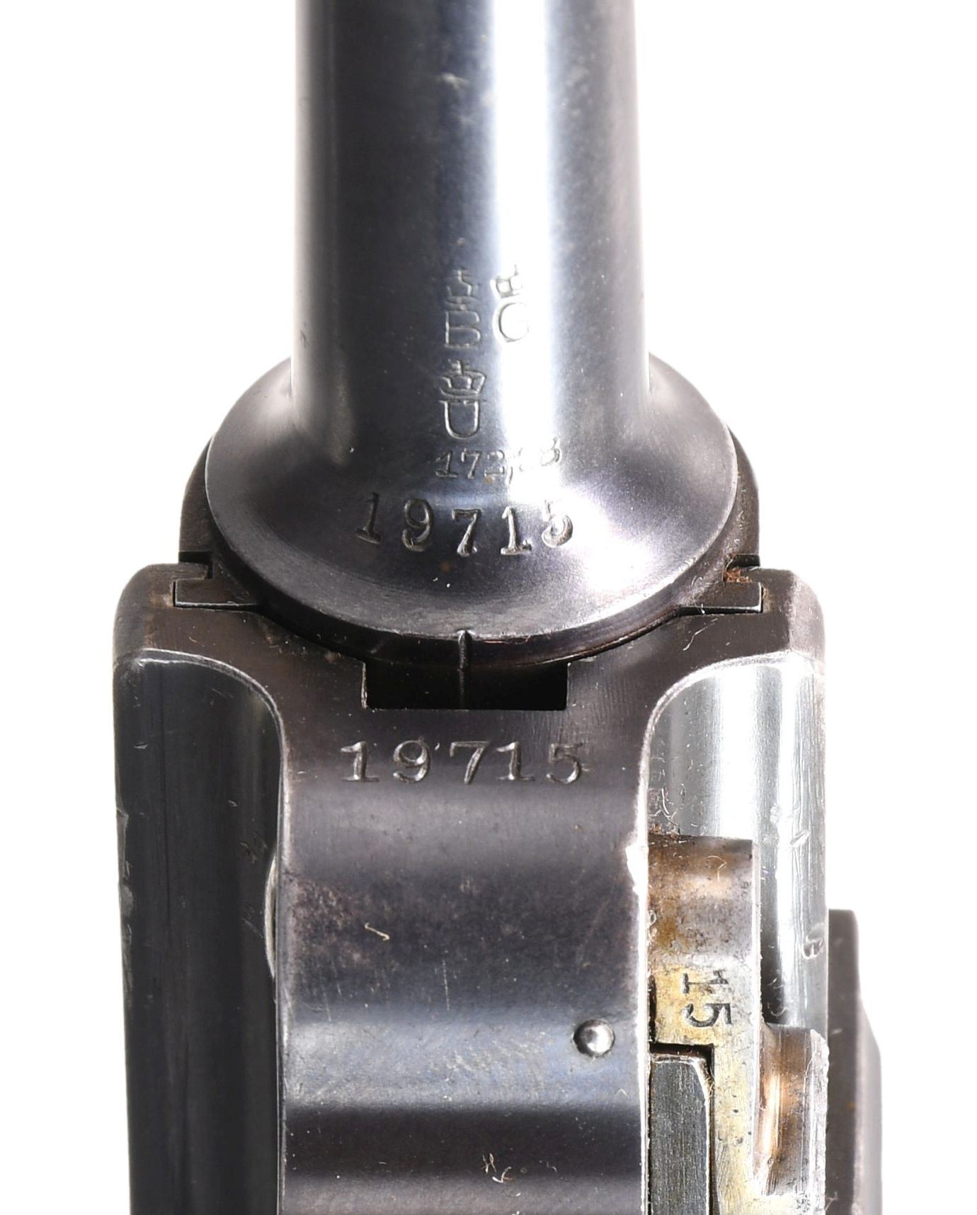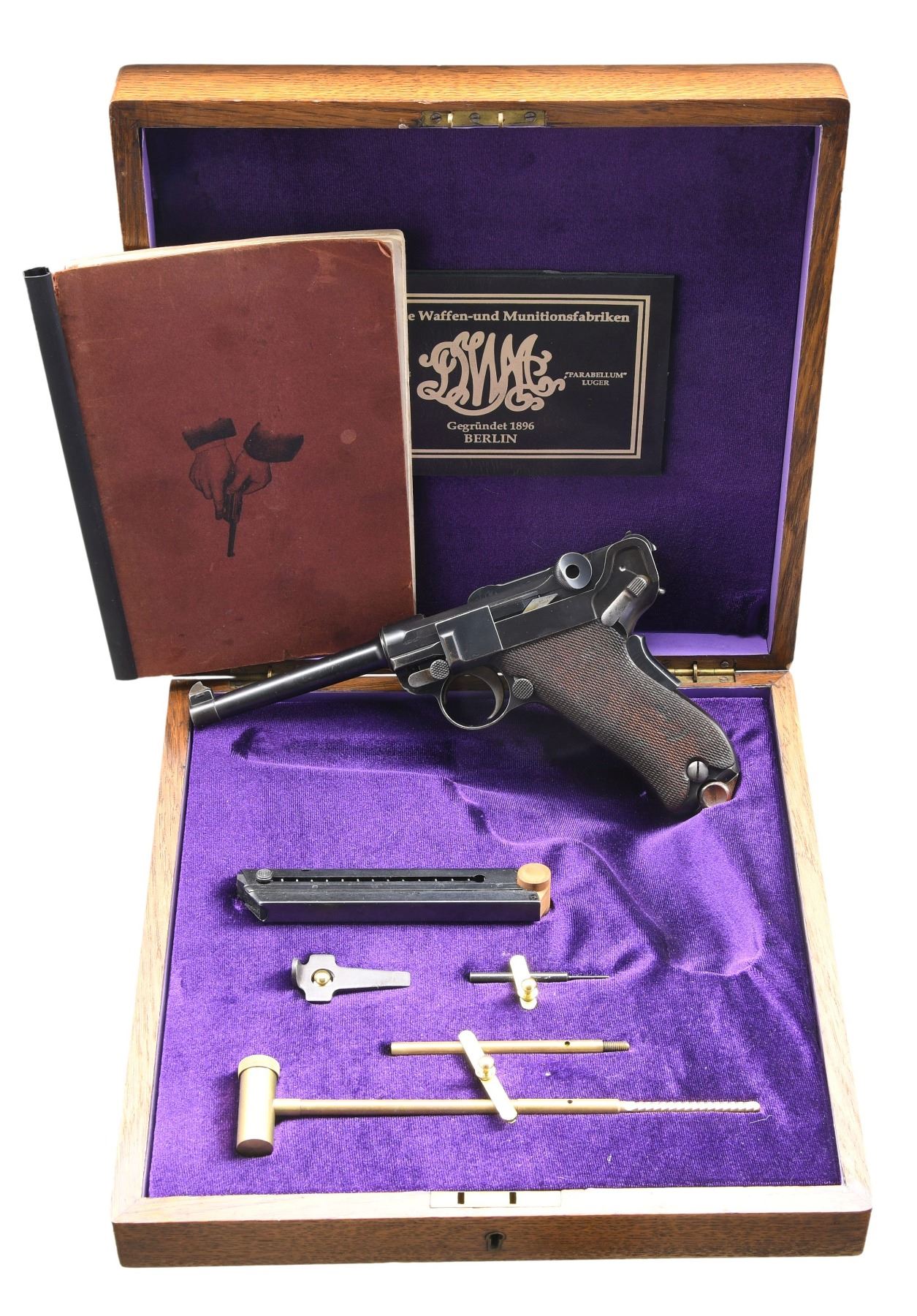 PISTOL WITH CUSTOM DISPLAY CASE & ACCESSORIES. Cal. 7.65x21mm Parabellum. S# 19715. Bbl. 4 3/4". Model 1900 Luger, mfg. in Germany by DWM for commercial sales. Toggle is marked with the intertwined "DWM" monogram. Crown over "B", "U", and "G" commercial proofs are present on the underside of the bbl., with Crown over "B" and "U" proofs present on the bbl. extension, breechblock, and forward toggle link. Major metal components exhibit a rust blue finish, with some smaller components exhibiting either a straw or nitre blue finish. Bbl. extension appears to have been reblued at one time. Frame is mounted with 2-piece checkered wood grips. Dished toggles, with anti-rebound arm. All numbers are matching and include the frame, takedown lever, sideplate, trigger, grip safety, bbl., bbl. extension, breechblock, toggles, as well as the grips. MAGS: two 8-rd. UNATTACHED ACCESSORIES: Custom wood display case containing one contemporary mag., a punch tool, and a cleaning rod, as well as a vintage copy of "The Parabellum Automatic Pistol" manual. CONDITION: metal components retain the majority of their original blue finish, exhibiting areas of wear and thinning overall that show through to gray and brown patinas, some scattered flecks of light surface oxidation and/or pitting, as well as some scattered handling marks and dings. Strawed components exhibit varying degrees of wear, with worn areas exhibiting a gray patina, as well as spots of light pitting and age-related discoloration. Bore exhibits consistent dark pitting while retaining fair to good rifling throughout. Grips exhibit some smoothing and some scattered nicks and marks from handling and storage, but otherwise remain sturdy and serviceable. Left grip panel exhibits a chip in the usual area to the rear of the safety lever. Case is very good overall. Manual exhibits age-related discoloration, with some fraying at a few page ends, but otherwise remains sturdy and serviceable. PROVENANCE: from the lifelong collection of Jim Williams. (24-2636/MLW). CURIO. $1,500-2,000.