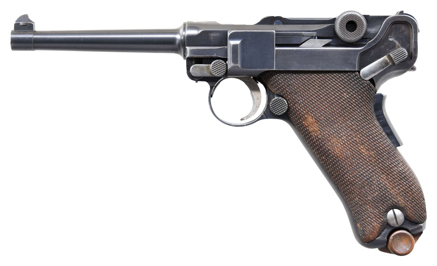 PISTOL, WITH POLISHED SAFETY. Cal. 30 Luger. S# 32123. Bbl. 4 3/4". Model 1906 American Eagle Luger mfg. in Germany by DWM for commercial sales within the USA. Top of the bbl. extension is marked with the Great Seal of the United States, with the intertwined "DWM" monogram marked on the toggle. Front of the frame is marked "GERMANY" below the S#. Metal components exhibit an older reapplied blue finish overall, save for on the takedown lever, trigger, safety lever, and ejector, which exhibit a straw finish. Frame exhibits a polished safety area. Frame is mounted with 2-piece checkered wood grips. Frame grip screw threads have been recut. Dovetailed blade front sight, with fixed V-notch rear sight. Matching numbers are present on the frame, sideplate, trigger, bbl., and breechblock. Takedown lever, grip safety, bbl. extension, trigger bar, toggle links, and grips have been renumbered to match. MAGS: 1 non-matching blued mag. with wood bottom. CONDITION: metal components retain the majority of their reapplied blue finish, exhibiting some areas of wear and thinning that show through to gray and brown patinas, with spots and areas of light to mild surface oxidation present overall. Interior of mag. well exhibits heavy striations from prior cleaning. Straw parts show varying degrees of wear, with scattered spots of age related discoloration present overall. Bore is bright, exhibiting consistent mild pitting, while retaining strong rifling throughout. Grips show some smoothing and scattered marks from handling and storage, with the left grip exhibiting some mild marring, as well as a chip in the top right corner of the panel. (25-552/MLW). CURIO. $2,000-3,000.