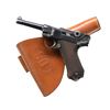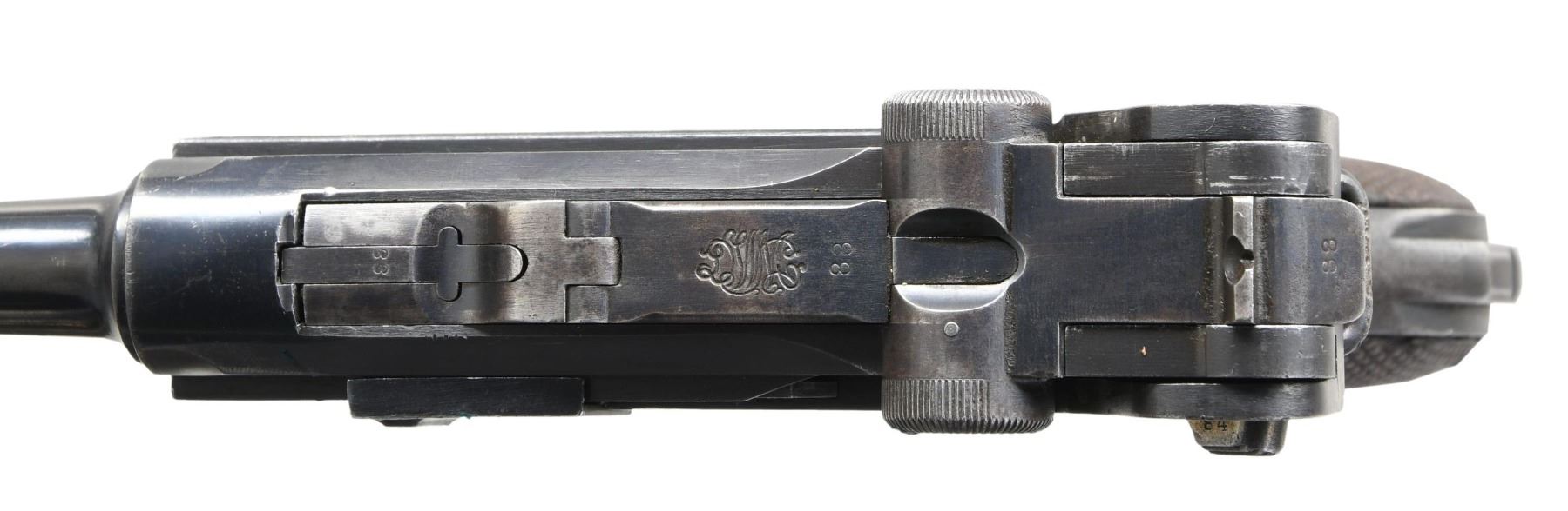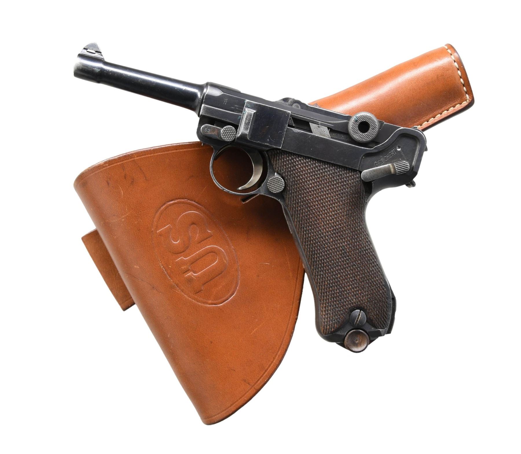 PISTOL WITH REPRODUCTION US HOLSTER. Cal. 30 Luger. S# 9737e. Bbl. 3 3/4". Model 1920 Commercial Luger, mfg. by DWM for commercial sales. Toggle is marked with the intertwined "DWM" monogram. Left side of the bbl. extension is marked with a German Crown/N commercial nitro proof, with an Imperial German Reichsadler stamped on the left side of the breechblock. Major metal components (save for the toggle train) exhibit a reapplied blue finish overall. Trigger has been restrawed and lengthened on the right side. Frame is mounted with 2-piece checkered wood grips. No matching numbers are present, save for the toggle train, which matches itself. Left grip screw is a contemporary replacement. MAGS: 1 reproduction, 8-rd. UNATTACHED ACCESSORIES: reproduction "US" embossed brown leather holster. CONDITION: metal components retain large amounts of their reapplied blue finish, exhibiting wear and thinning, as well as scattered spots of oxidation overall. Bore is bright, as refinished, exhibiting pitting and good rifling throughout. Grips exhibit smoothing and some scattered marks from handling and storage, with the left grip exhibiting a chip at the top right corner of the panel. Holster is very good overall. (24-1271/MLW). CURIO. $500-1,000.