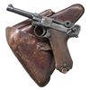 PISTOL WITH HOLSTER. Cal. 7.65x21mm Parabellum. S# 5075L. Bbl. 3 3/4". Model 1920 Commercial Luger semi-automatic pistol produced by DWM from surplus and newly mfg. parts and components for commercial sales after World War I. Toggle is marked with the "DWM" intertwined monogram. Left side of the bbl. exhibits an illegible import mark. Left side of bbl. extension, underside of bbl., and left side of breechblock exhibit a Crown/N commercial nitro proof. Metal components exhibit a blue finish. Frame is mounted with 2-piece checkered wood grips. All serialized parts are matching, and include the frame, takedown lever, sideplate, trigger, bbl., as well as the rear toggle link. MAGS: 2 8-rd. UNATTACHED ACCESSORIES: brown leather holster, which exhibits a partially legible maker mark on the interior of the closure flap that appears to read "DANZIGERLEDER/ 1916". CONDITION: metal components retain traces of their blue finish, with the balance exhibiting wear and thinning that shows through to gray patina, with scattered spots of light pitting and age related discoloration present overall. Fair bore, exhibiting pitting, while retaining fair to good rifling throughout. Grips show heavy smoothing and some scattered marks from handling and storage. Holster remains malleable, exhibiting areas of age related cracking and crazing overall. Left belt loop and loading tool provision are absent. (24-6491/MLW). CURIO. $500-800.