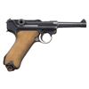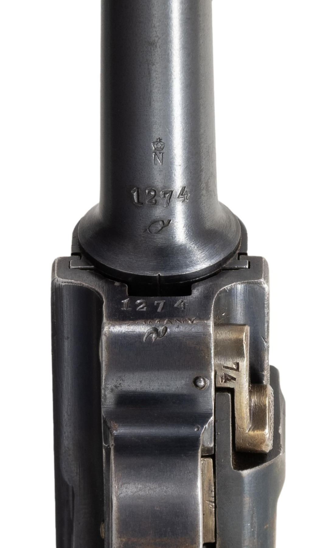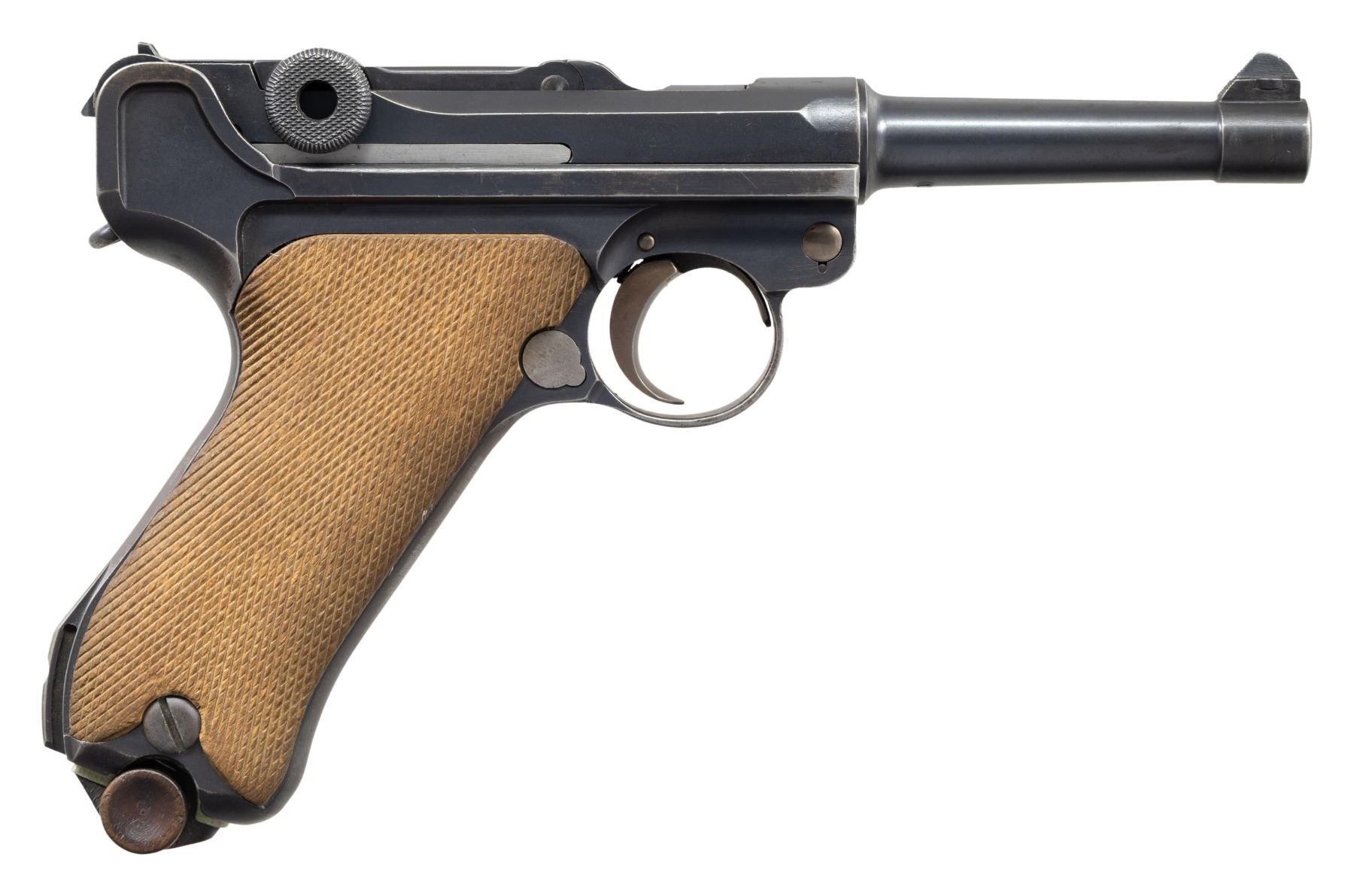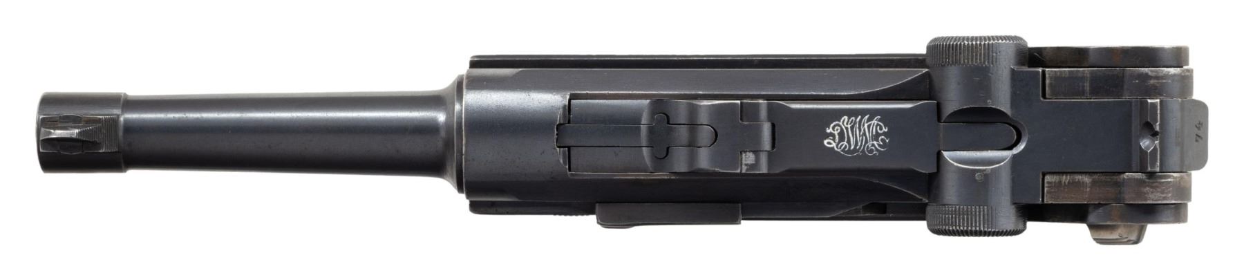 PISTOL. Cal. 7.65x21mm Parabellum (30 Luger). S# 1274o. Bbl. 3 3/4". Model 1920 Commercial Luger semi-automatic pistol mfg. by DWM from existing surplus and newly mfg. parts & components. Left side of the bbl. extension is marked with a vertical Crown/N commercial nitro proof. Toggle is marked with the intertwined "DWM" monogram, with a horizontal Crown/N proof marked on the left side of the breechblock. Metal components exhibit a rust blue finish overall, save for on some small parts including the takedown lever, trigger, safety lever & ejector, which are strawed (possibly reheated). Frame is mounted with 2-piece checkered wood grips. Standard dovetailed blade front sight and fixed V-notch rear sight. Matching numbers are present on the frame, takedown lever, trigger, bbl., and rear toggle link. Sideplate is a reblued replacement. Rear toggle link is a later Mauser (S#: 26) replacement. MAGS: 1 non-matching (S#: 99) plated 8-rd. with Imperially proofed wood plug. CONDITION: metal components retain the majority of their original factory blue finish, exhibiting some spots/areas of light to mild wear (primarily on edges) and some small spots of light surface oxidation overall. Grip straps exhibit areas of wear and thinning fading to gray patina. Bore exhibits consistent mild to moderate pitting, while retaining strong rifling throughout. Proper manual mechanics. Grips show mild smoothing and some superficial handling marks, with the left panel exhibiting a chip at the usual area, at and to the right of the safety lever. (25-6570/MLW). CURIO. $800-1,200.