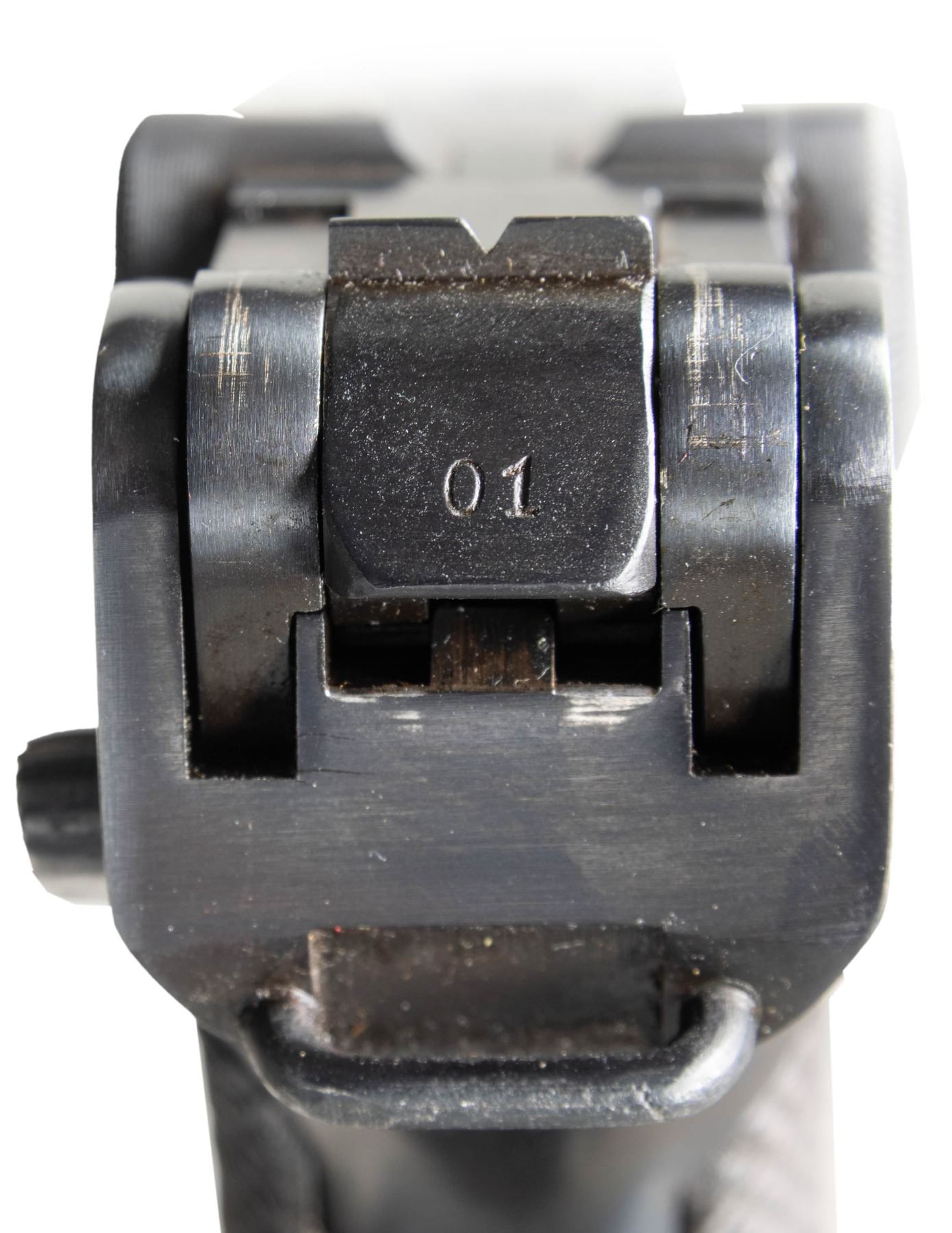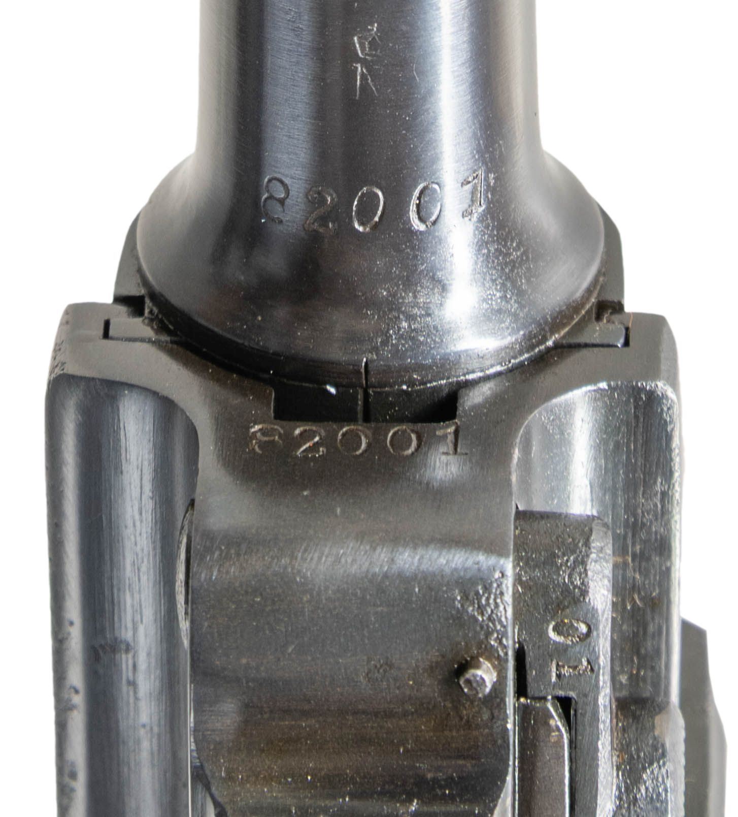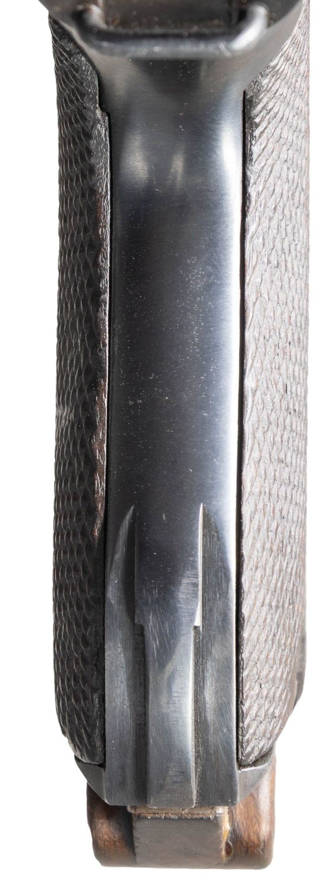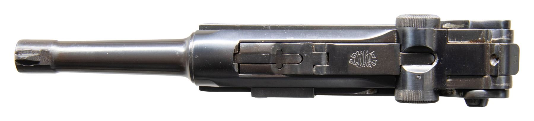 PISTOL. Cal. 7.65x21mm Parabellum. S# 82001. Bbl. 3 3/4". Model 1923 Commercial Luger semi-automatic pistol mfg. by DWM. Left side of the bbl. extension is marked with a Crown/N commercial nitro proof, which is also present on the underside of the bbl. and left side of the forward toggle link. Toggle is marked with the intertwined "DWM" monogram. Metal components exhibit a reapplied blue finish overall. Frame is mounted with replacement 2-piece checkered wood grips, each stamped with a Mauser acceptance proofs on the interior of the panels. Stock lug has been mostly ground down. Blade front sight and V-notch rear sight. All serialized parts are matching in the "hidden" commercial fashion and include the frame, takedown lever, sideplate, trigger, bbl., breechblock, and rear toggle link. MAGS: 1 8-rd. with unmarked wood plug. CONDITION: metal components retain virtually all of their reapplied blue finish, showing some light superficial handling marks, with some spots of light to mild pitting present beneath the bluing. Bore exhibits consistent dark moderate pitting, while retaining good rifling throughout. Proper manual mechanics. Grips show smoothing and some superficial marks from handling and storage, but otherwise remain sound. Wood mag. plug exhibits several cracks. (25-4650/MLW). CURIO. $700-1,000.