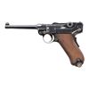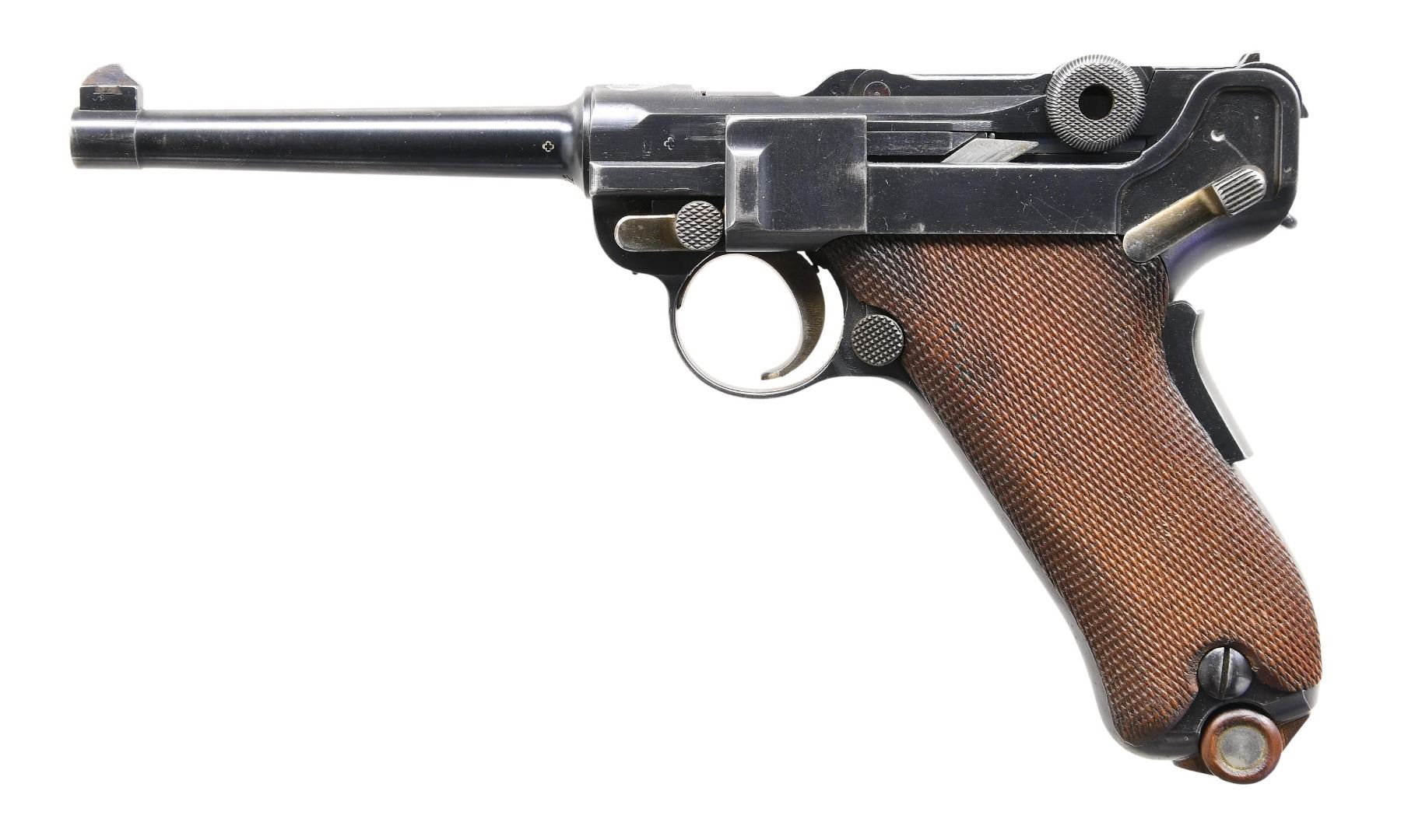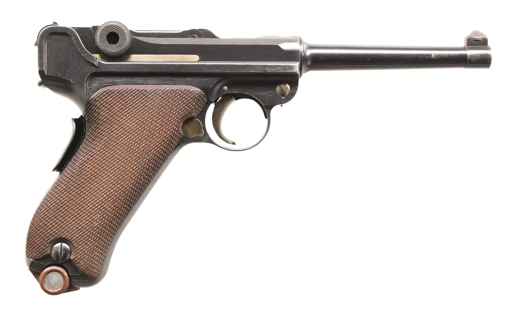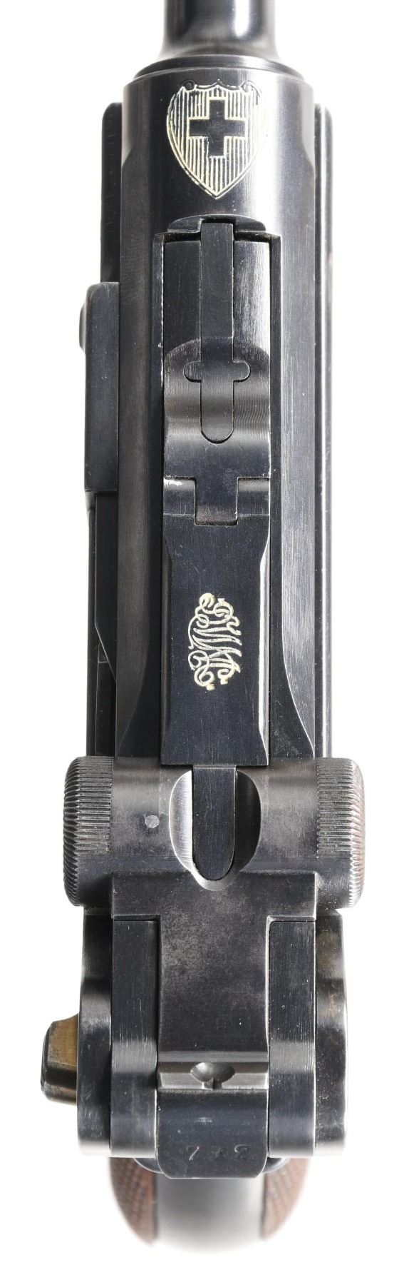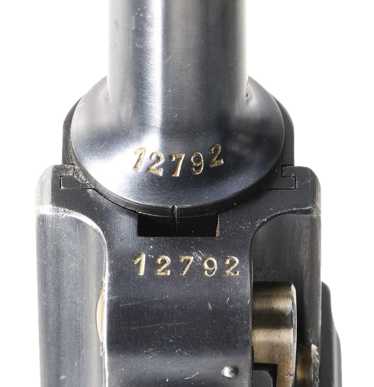 SEMI-AUTOMATIC PISTOL. Cal. 7.65x21mm Parabellum. S# 12792. Bbl. 4 3/4". Model P'00/06 Luger, mfg. by DWM under contract for the Swiss military. This example was one of 800 pistols that were ordered from DWM as parts sets that were assembled and numbered by Waffenfabrik Bern. The bbl. extension is marked with the Swiss Federal cross within a shield over the chamber, with the left side exhibiting a Cross/V (indicating inspection by Major Vogelsang). Frame, bbl., and bbl. extension exhibit a blue finish overall, with strawed components appearing to have been reheated at one time. Frame is mounted with 2-piece checkered wood grips. Blade front sight with V-notch rear sight. All serialized parts are matching in the Waffenfabrik Bern style/font and include the frame, sideplate, trigger, grip safety, bbl., the bbl. extension, breechblock, toggles, as well as the grips. MAGS: 1 Swiss 8-rd. CONDITION: metal components retain the majority of their Swiss blue finish, exhibiting a few scattered areas of light wear and thinning that show through to gray patina, as well as some scattered spots of surface oxidation overall. Strawed components exhibit some light wear that shows through to gray patina. Mirror bore, exhibiting well-defined rifling throughout. Grips show light smoothing, as well as a few marks and nicks to the diamonds, but otherwise are very good overall. (24-4119/MLW). CURIO. $1,200-2,000.