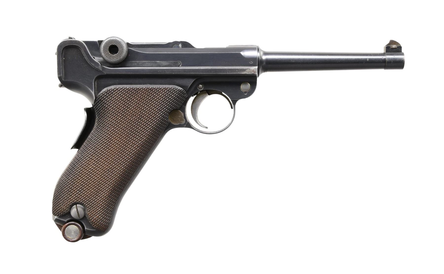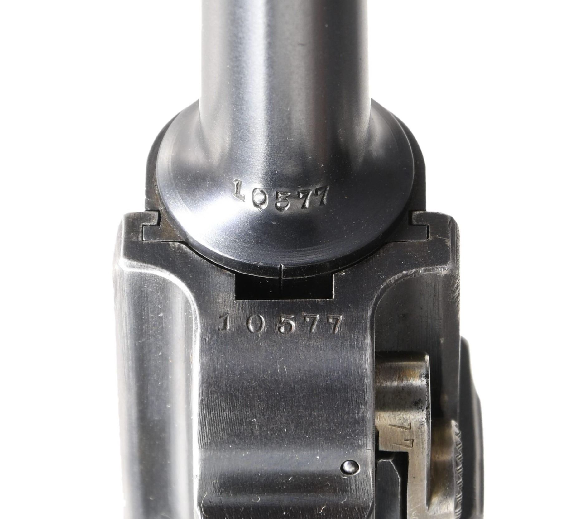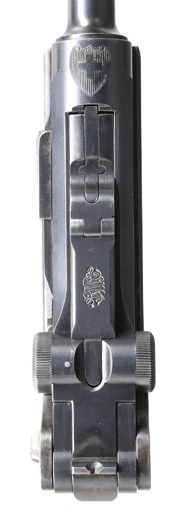SEMI-AUTOMATIC PISTOL. Cal. 7.65x21mm Parabellum. S# 10577. Bbl. 4 3/4". Model P'00/06 Luger, mfg. by DWM under contract for the Swiss military. This example falls within the 10001-12000 S# range, indicating that it was not shipped to Waffenfabrik Bern as a parts set and was instead serialized and finished by DWM. The top of the bbl. extension is marked with the Swiss Federal cross within a shield, with no Major Vogelsang inspection proof present on the left. Major metal components exhibit a blue finish, with some smaller components exhibiting a straw finish overall. Grip safety appears to have been period relued, possibly at the arsenal. Frame is mounted with 2-piece checkered wood grips. All serialized parts are matching in DWM's commercial (hidden) style and include the frame, takedown lever, sideplate, trigger, grip safety, bbl., bbl. extension, breechblock, as well as the toggles. MAGS: 1 Swiss 8-rd. CONDITION: metal components retain the majority of their original blue finish, exhibiting some areas of light to mild wear and thinning that shows through to gray patina, with some scattered flecks of surface oxidation present overall. Grip safety exhibits some pitting beneath the finish. Strawed components exhibit some wear, with worn areas exhibiting a gray patina and scattered spots of age-related discoloration. Mirror bore, exhibiting a few spots of what appears to be grease while retaining well-defined rifling throughout. Grips exhibit some light to mild smoothing, as well as some scattered nicks to the diamonds, but are otherwise very good overall. (24-4121/MLW). CURIO. $1,000-1,500.