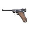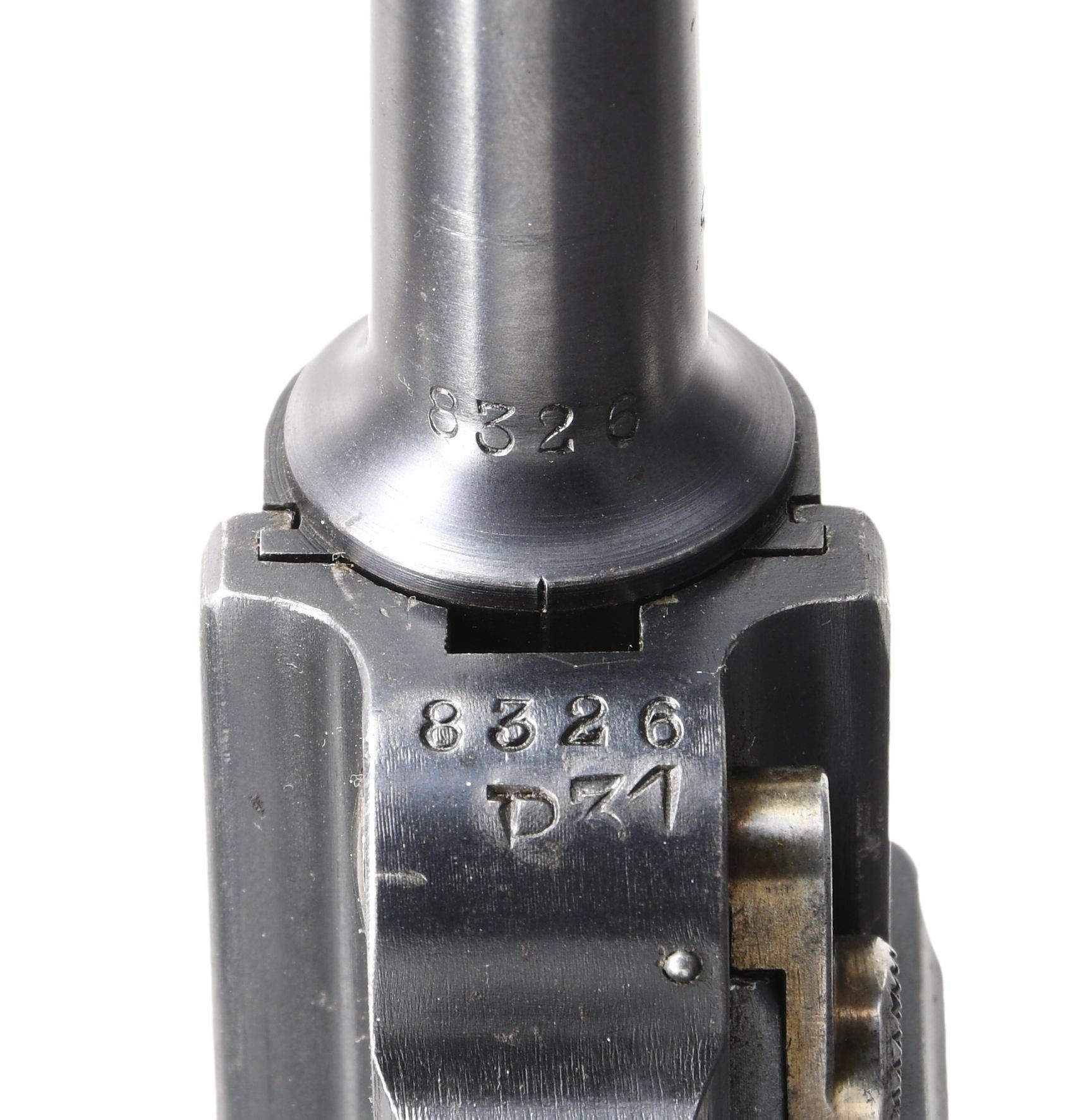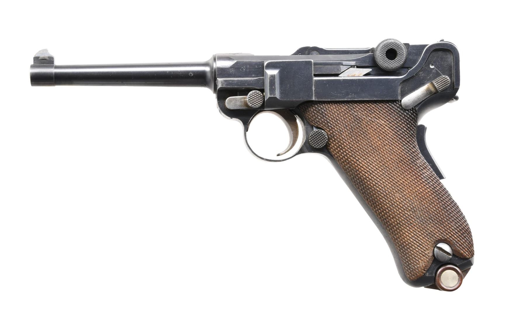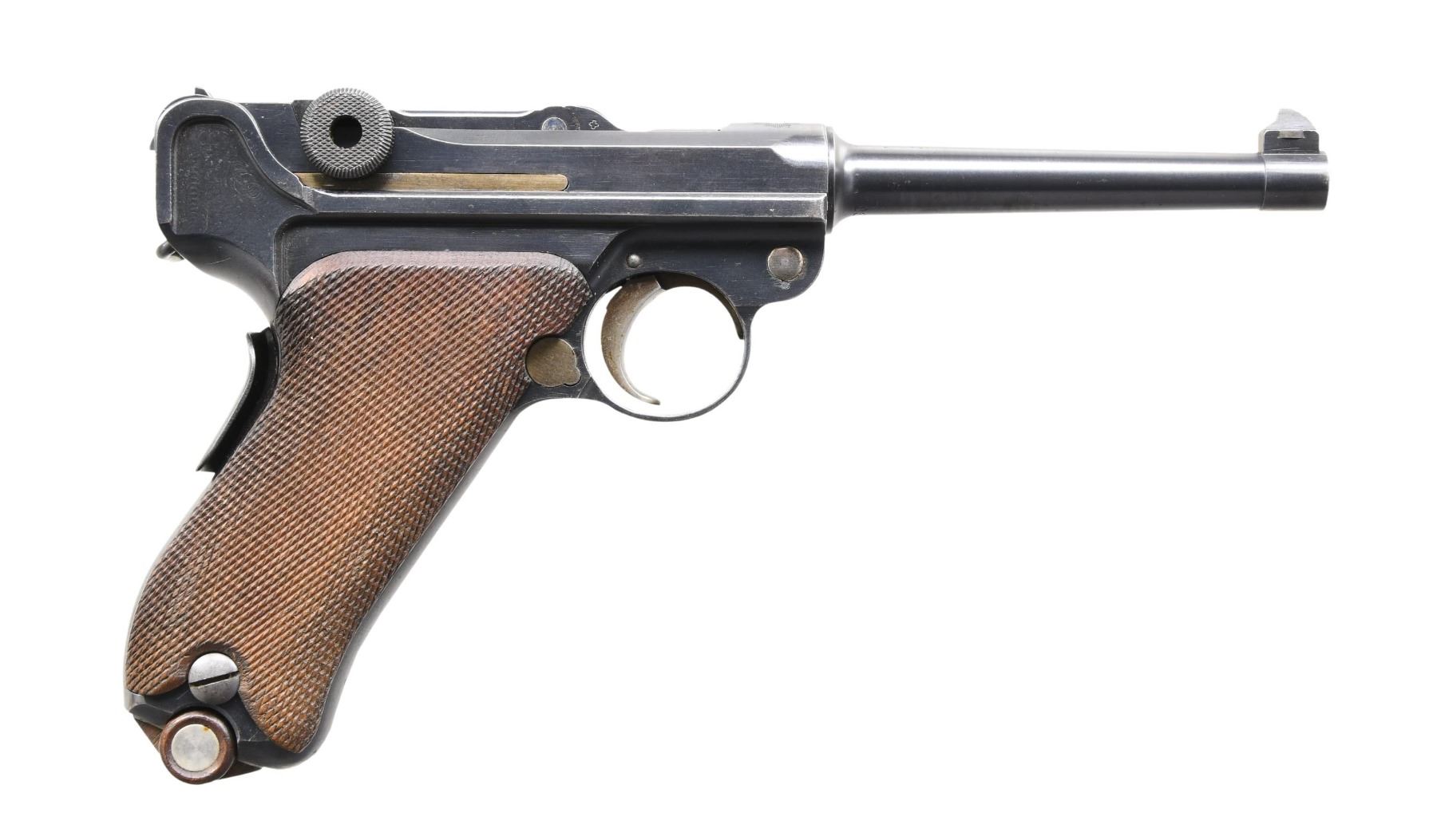 Cal. 30 Luger. S# 8326. Bbl. 4 3/4". Swiss P'06 Luger semi-automatic pistol, mfg. as a parts set by DWM and sent to Waffenfabrik Bern for finishing and serialization. The bbl. extension is marked with a Swiss Federal cross within a sunburst, with the left side exhibiting a boxed Cross/V proof (indicating inspection by Major Vogelsang). Toggle is marked with the intertwined "DWM" monogram. Front of the frame is stamped "P31", indicating that this example was reworked/refurbished for private purchase. Major metal components exhibit a Swiss arsenal reapplied blue finish, with some smaller components exhibiting either a straw or nitre blue finish. Frame is mounted with 2-piece checkered wood grips. Blade front sight, with V-notch rear sight. All serialized parts are matching and include the frame, sideplate, trigger, grip safety, bbl., the bbl. extension, breechblock, toggles, as well as the grips. MAGS: one 8-rd. CONDITION: major metal components retain the majority of their reapplied Swiss arsenal blue finish, exhibiting some light wear and thinning, with spots/areas of light to mild surface oxidation present overall. Strawed components exhibit varying degrees of wear, with worn areas exhibiting a gray patina and scattered spots of age-related discoloration. Mirror bore, exhibiting some grease within the grooves while retaining well-defined rifling throughout. Grips show light smoothing and a few impressions to the diamonds, but are otherwise very good overall. Grip screws exhibit a mostly gray patina, with the left screw having cracked and warped on the left side. (24-4059/MLW). CURIO. $1,200-1,800.