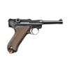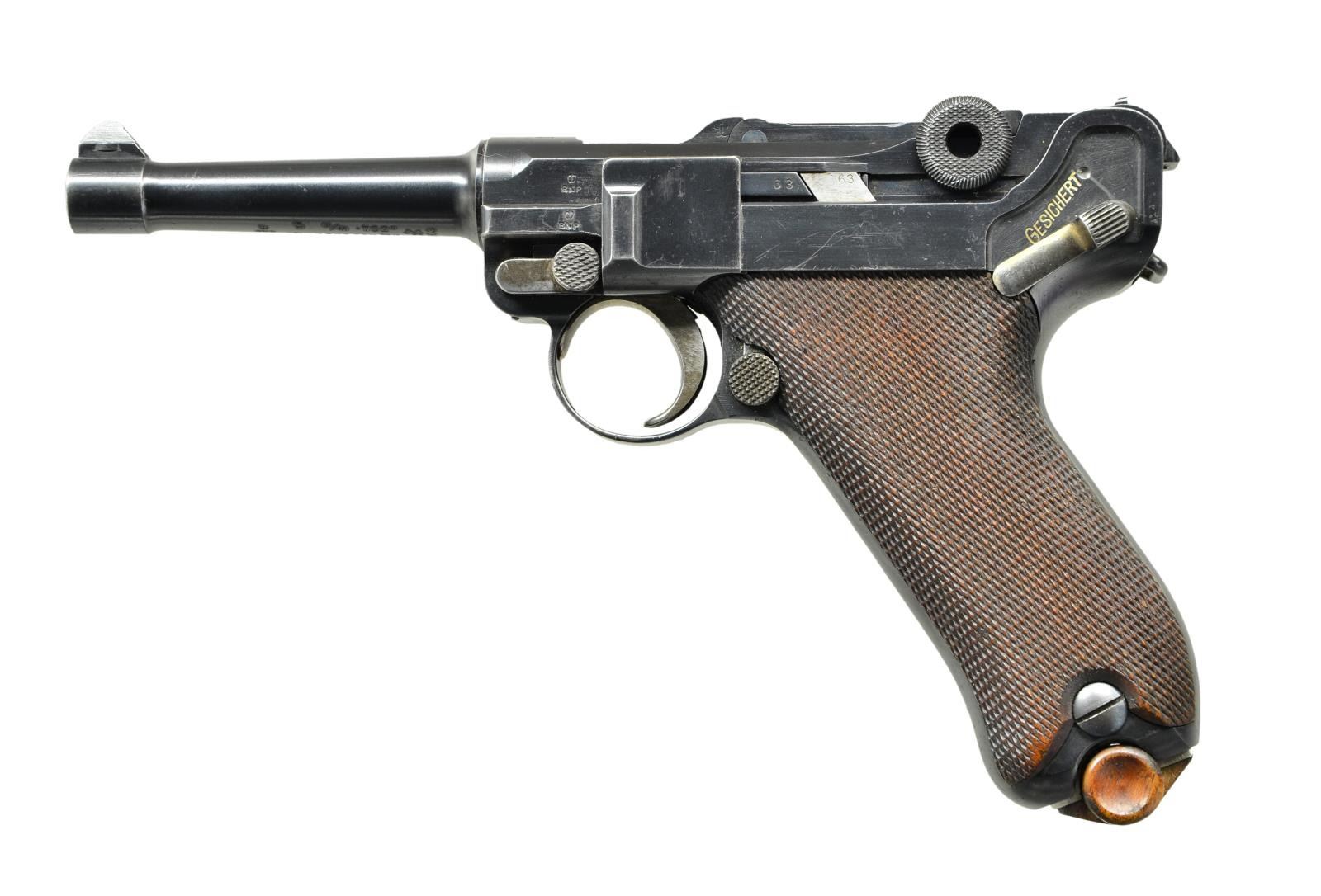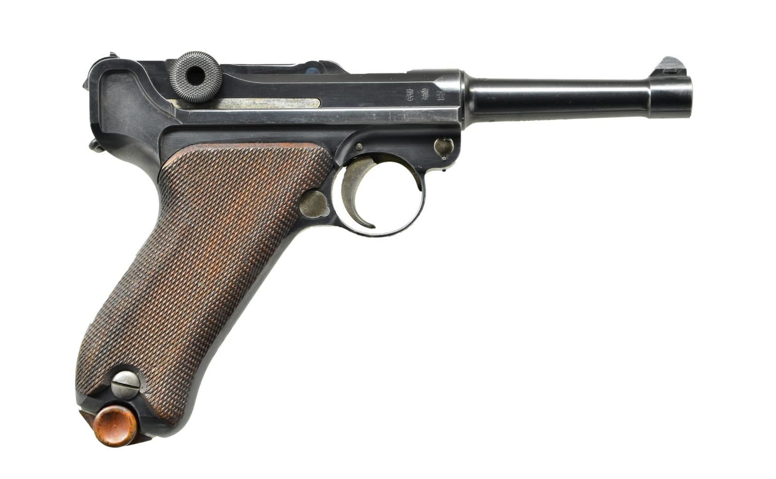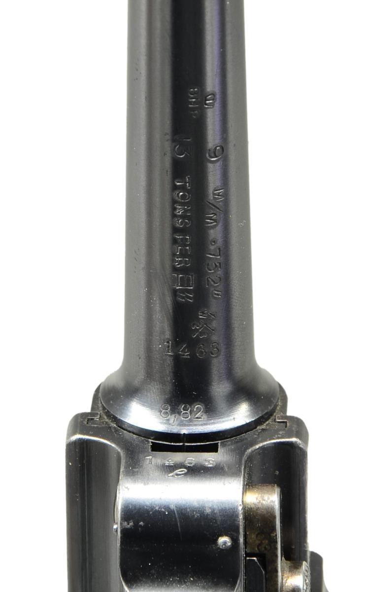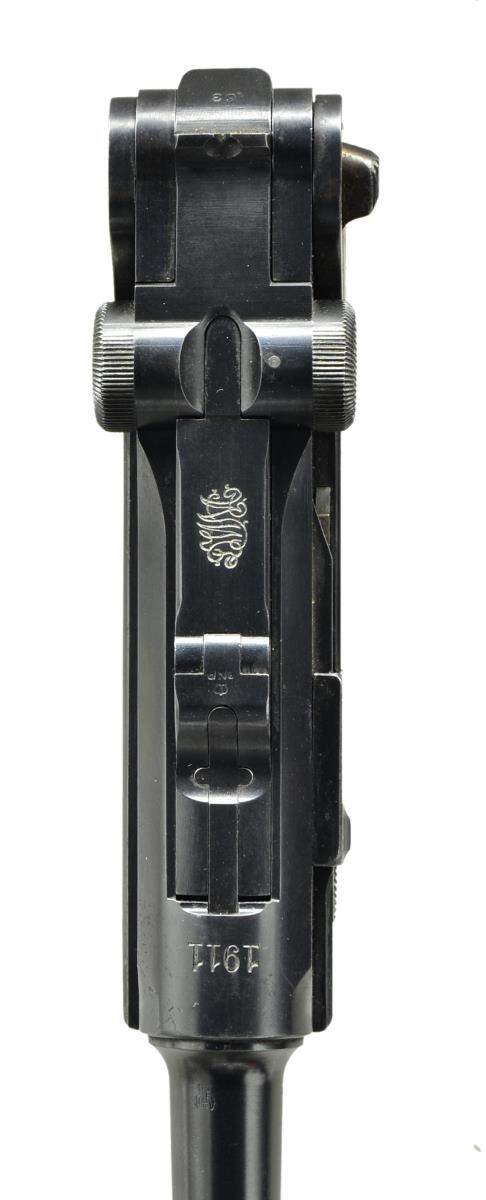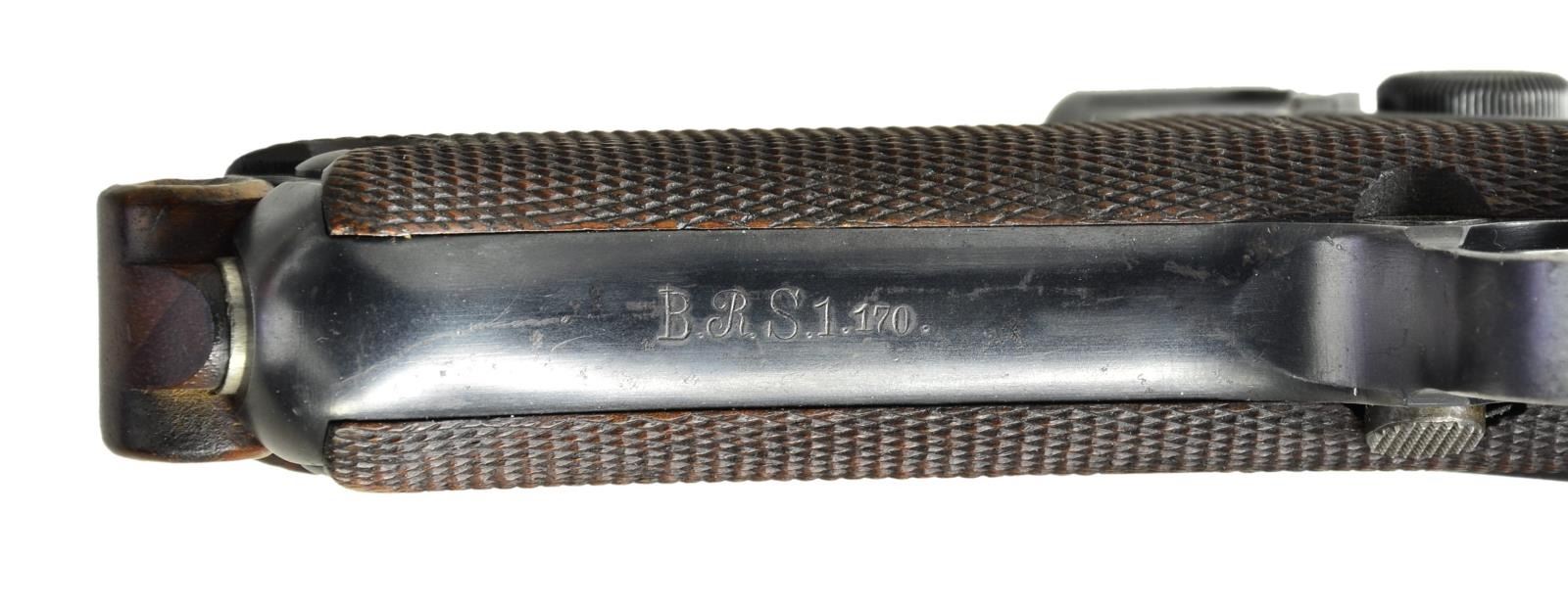 MILITARY LUGER SEMI-AUTO PISTOL. Cal. 9mm Luger. S# 1463e. Bbl. 4" w/ serrated fin shaped sight; matching numbered w/ abundant British proofs on bottom. Chamber dated 1911; 13,000 units from S# 1500c to 4825e. 58,000 units mfg. 1910-1913; S# 5000b to 315e utilizing 1913 date. Mfg. w/out stock lug or hold open latch; usually added during 1913 upgrade recall. Front strap unit marked “B. R. S. 1. 170.” indicating Bayerisches Reserve (Bavarian Reserve) Company 1 & firearm number 170. Various British proofs plus Imperial proofs on right front of receiver. Matching numbers throughout in commercial locations to include: receiver, sear, trigger, takedown lever, sideplate, safety lever, safety bar, checkered walnut grips & entire toggle assembly. Grips also have heart shaped symbol on back of each plus “5” on back of left. Strawed sm. parts, GELADEN marked extractor plus appropriate internal areas in the white. This pistol featured on p. 572 of Dr. Geoffrey Sturgess’ The Borchardt & Luger Automatic Pistols. MAGS: 1 good slightly stained, tinplated, 8 rd. mag. w/ wood base numbered 5120e at rear half of base reading front to rear; appears to have very faint (unreadable) proof mark just forward of midpoint. CONDITION: very good appearance w/ slight high point & function wear. Occasional very sm. spots of peppery oxidation. Very good straw colors w/ only a hint of staining. About very good bright bore w/ hint of wear & extremely faint frosting. PROVENANCE: formally of Dr. Geoffrey Sturgess Collection. (22-5647/NW). CURIO. $2,000-3,000.