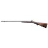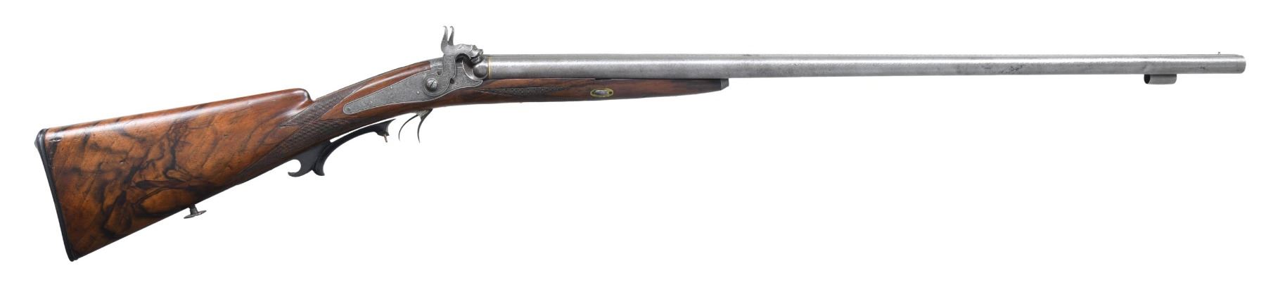 SHOTGUN. Cal. 16 Ga. NSN. Bbls. 28.5". Damascus bbls. with alloy bead on the flat rib. London Crown V proof on the rib in front of two gold bands. Lefaucheux-style back action locks, and the top tang plate has a scroll engraving, highlighting woodland hunting scenes on the locks with a resting hunter on top. Engraving on hammers. Wedge-fastened walnut stock with wraparound point pattern checkering on the forearm and wrist, spear-tipped finial thimble and trigger plate, and cheekpiece with relief floral carving. Horn buttplate. CONDITION: The bbls. have a very good Damascus pattern with spots of patina throughout; one ramrod pipe is missing. A portion of the horn triggerguard is missing. Wood has a good appearance with small, deep marks. Dark, pitted bores. (01-26209/MD). ANTIQUE. $300-1,000.
