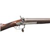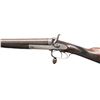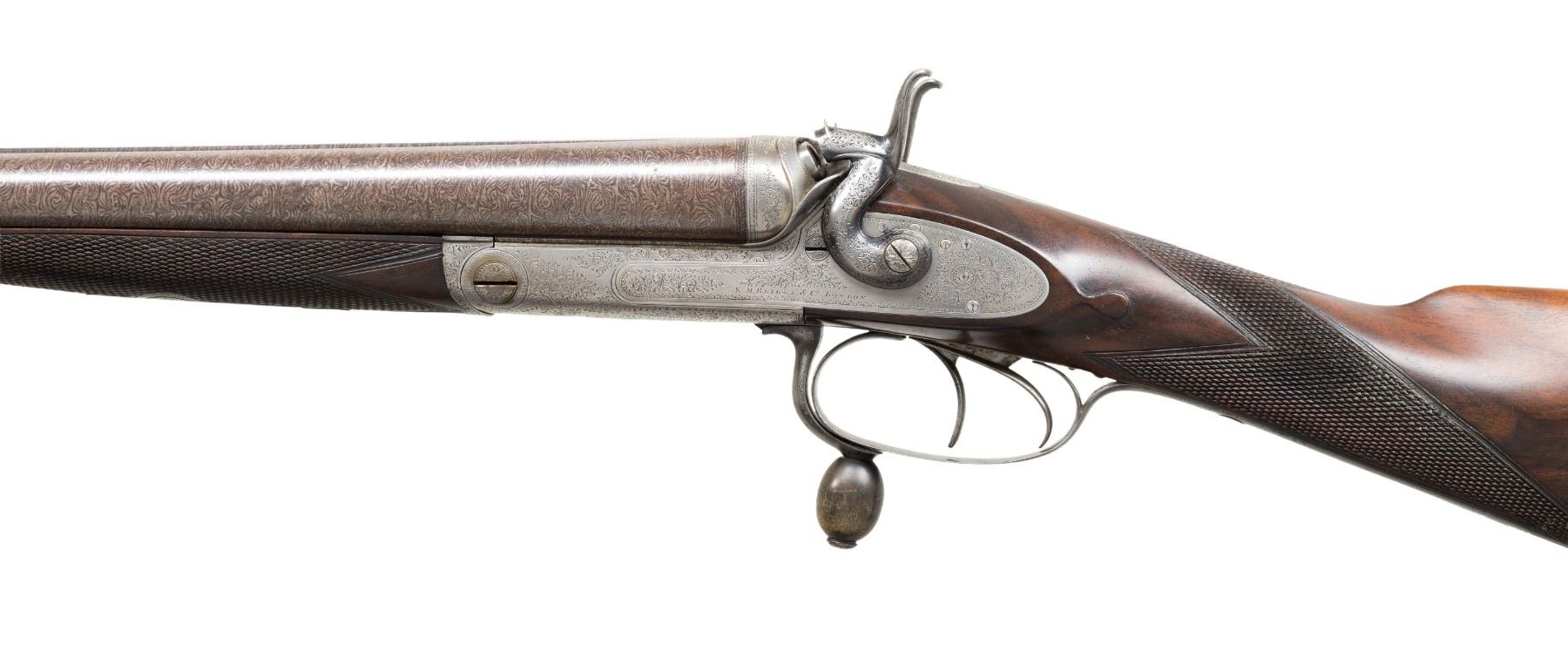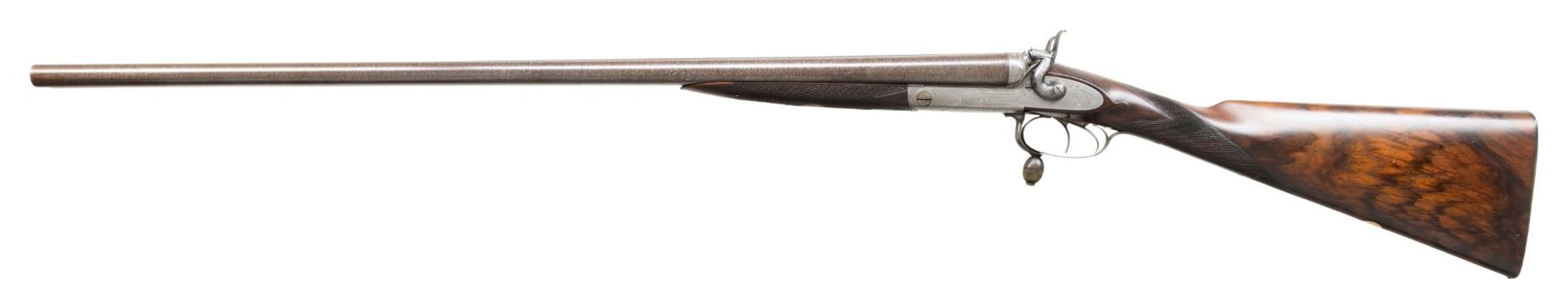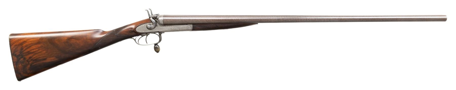 HAMMER SxS SHOTGUN. Cal.16ga 2 1/2". S# 20112. Bbl 30" of fine damascus steel. Top rib is marked "E.M. Reilly & Co New Oxford St London & Rue Scribe Paris". Rounded frame exposed hammer action with rebounding locks, high fences and push forward under lever action. Under lever is operated with an oval horn knob. Action and fittings have generous coverage of fine English scroll engraving, lock plates are marked " E.M Reilly & Co. London". Steel tipped splinter forearm and straight hand stock of fine English walnut with drop points and brass oval in toe line. LOP: 14 5/16" over a checkered horn buttplate. DAC: 1 5/8". DAH: 2 1/16". Stock has approximately 1/8" cast on. Bore Diameter (RT) .672. (LT) .672. Choke Construction (RT) .012 (LT) .010. Minimum Wall Thickness (RT) .028. (LT) .023. Weight 6lb 6.4oz. CONDITION: bbls have 95% finely rebrowned finish. Action and locks have clean, bright appearance. Triggerguard has 80% lightly worn blue. Stocks have very good refinish showing a few small marks, checkering is lightly freshened. Sound action and locks. Very good bright bores. (01-28490/DS). ANTIQUE. $1,000-1,500.