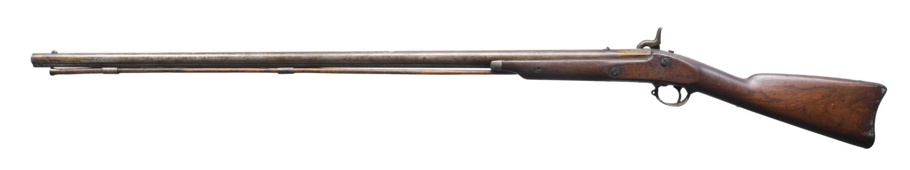 Cal. 62 w/ smoothbore. NSN. Bbl. 40" round replacement w/ 1864 date. Semi-circular front sight w/ fixed V notch rear sight. French style sidelock nipple bolster. Walnut stock is shortened to sporter length w/ pewter nose cap & added spring fastener. Brass tipped hardwood ramrod held on iron underrib by two plain pipes. CONDITION: metal has mottled gray-brown appearance w/ handling marks & spots of pitting. Stock shows heavy wear w/ handling marks having large chips around lock & tang areas. Sound lock. Dark pitted bore. PROVENANCE: from the renowned collection of quality sporting arms from Lewis Drake together with inventory of Lewis Drake Associates. (01-26138/DS). ANTIQUE. $400-600.