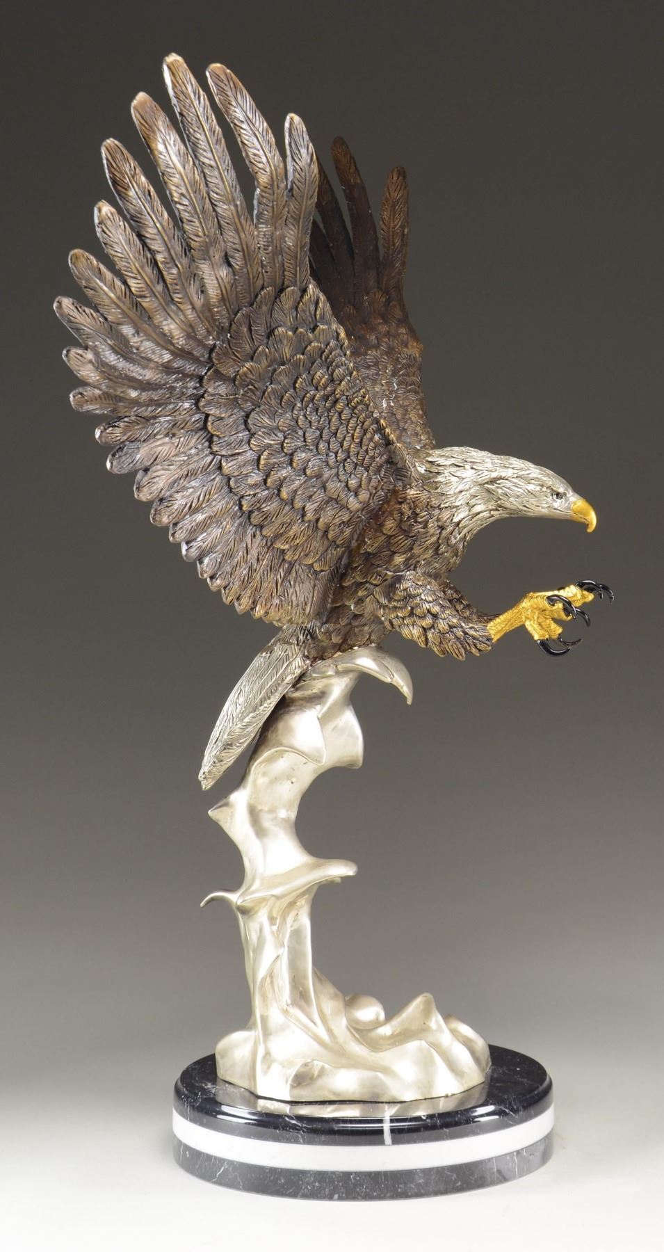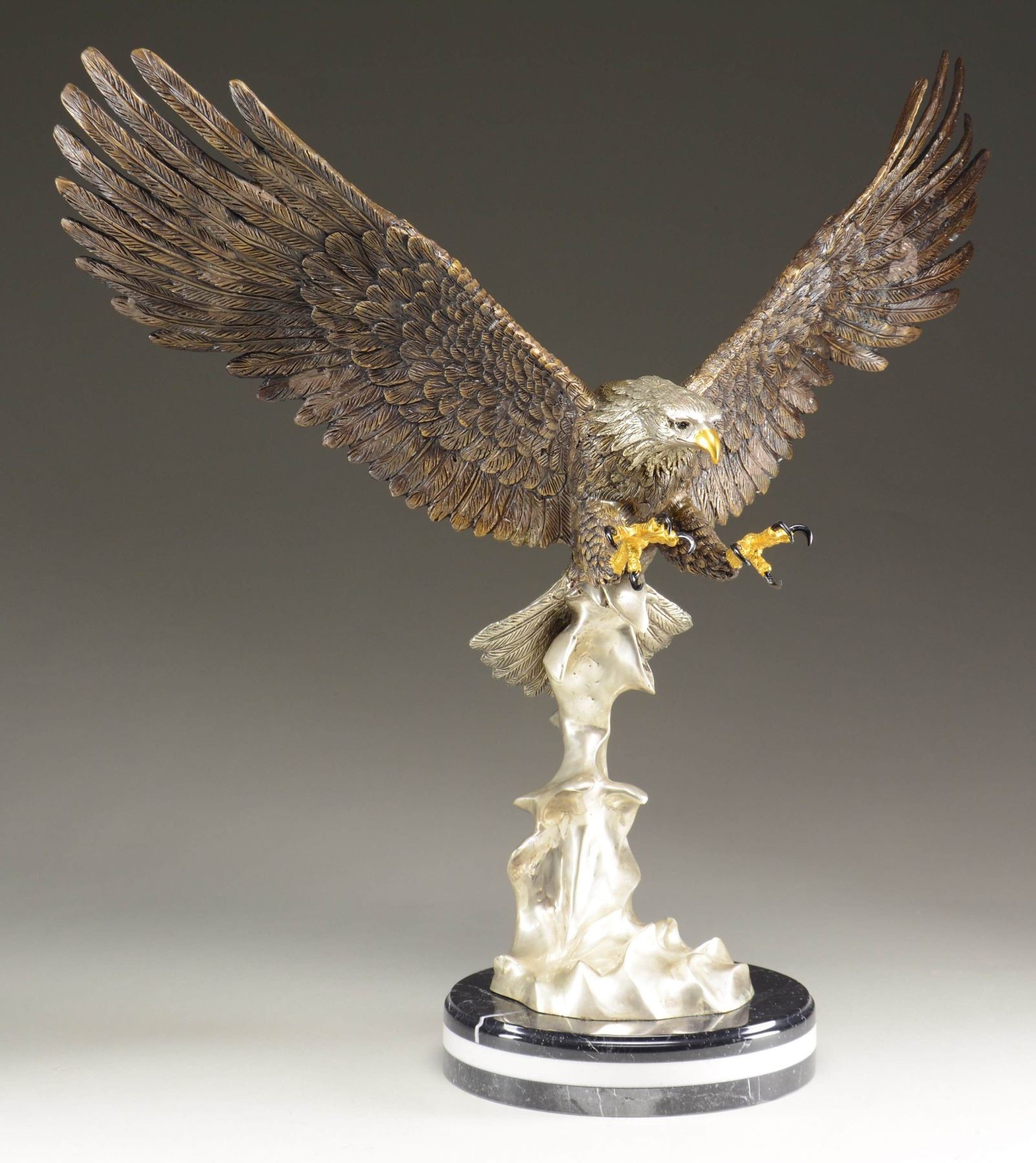 "ARRADIA". Attractive large polychrome bronze sculpture depicting an eagle landing, with it's legs and talons outstretched. Eagle features a white colored head and tail, with a brown body and wings, and gold colored beak and legs. Tail terminates in a white colored base, which is inscribed "Arradia" on the right side. 3 layer black and white marble base. Sculpture measures approx. 31 1/2" from wing to wing, and approx. 30" in height from the marble base to the tip of the wings. CONDITION: very good overall, with some pots of appropriate age related discoloration to the metal. Marble base is excellent overall. (02-22990/MLW). $2,000-2,500.