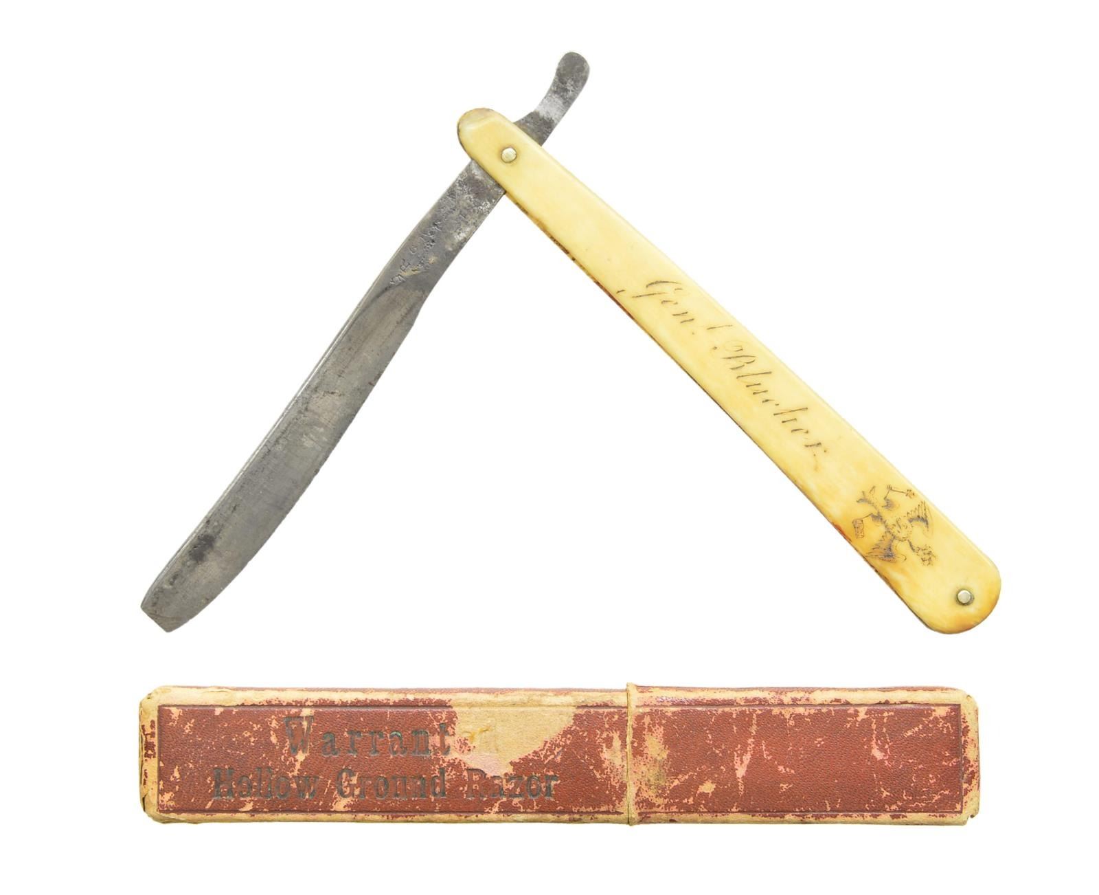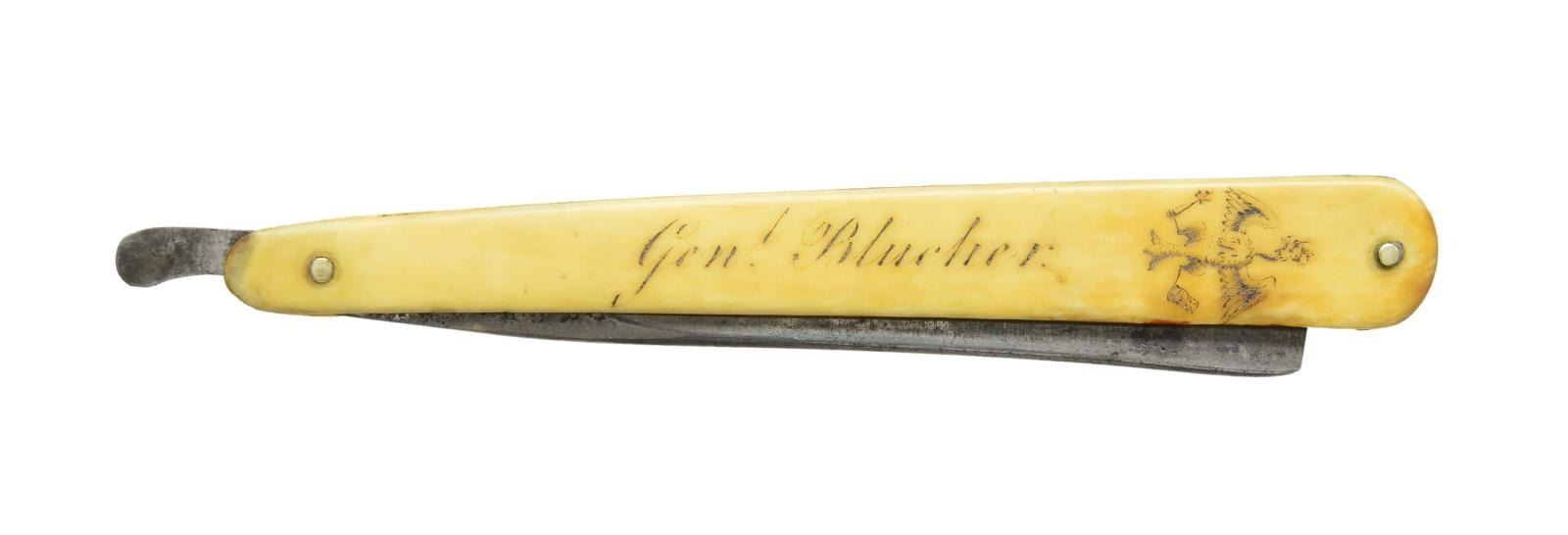 GEBHARD BLUCHER OF PRUSSIA. This razor is of classic, early 19th century style, form & construction. Stampings at the base of the blade include a crowned, “GR” & a British maker’s mark that has become partially illegible due to wear & light pitting. The certifiably antique ivory handle is held together w/ 2 brass pins. 1 Side is engraved w/ a fine rendition of a crowned Prussian eagle holding an orb & scepter w/ an “R” on its chest. The handle is further engraved, “Genl. Blucher”. Prussian General Gebhard Leberecht Blucher, 1742-1819 was a famous Prussian General & is best known for leading his army against Napoleon I at the Battle of the Nations in Leipzig during 1813 & at the Battle of Waterloo in 1815. Blucher visited England in 1814 & 1816 likely obtaining this fine razor during one of those visits. The razor is housed in a dark red colored paperboard box marked, “WARRANTED HOLLOW GROUND RAZOR”. A rare opportunity to acquire a personal item associated w/ a famous Napoleonic era general. UNATTACHED ACCESSORIES: information about General Blucher & his exploits along w/ information about the razor & a letter from the National Army Museum in London attesting to the age of the razor. CONDITION: the razor is undamaged but shows its age. The engraving is clear, crisp & easily read. (02-15662/BF). $500-800.