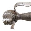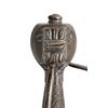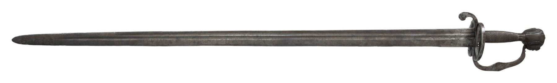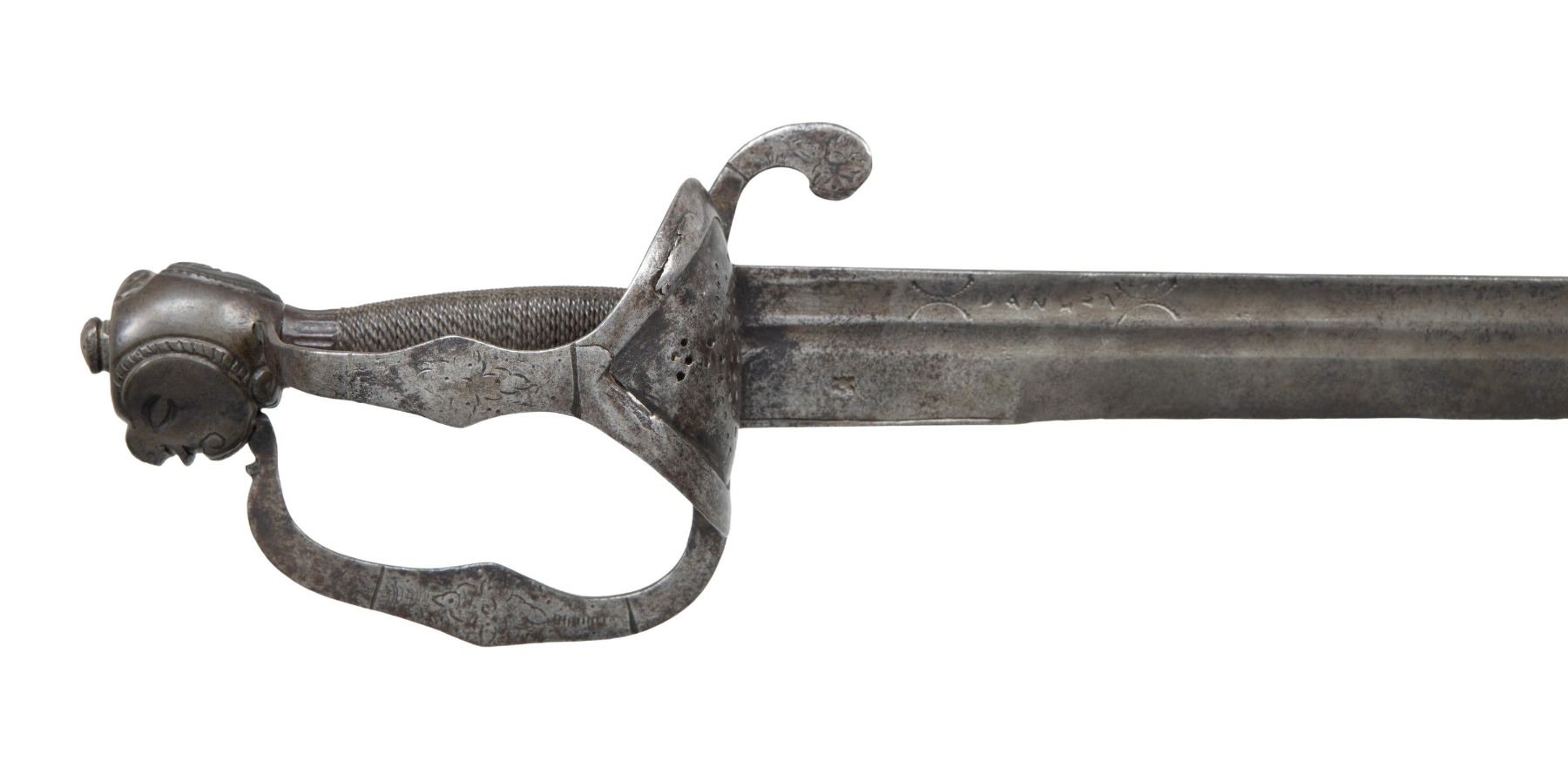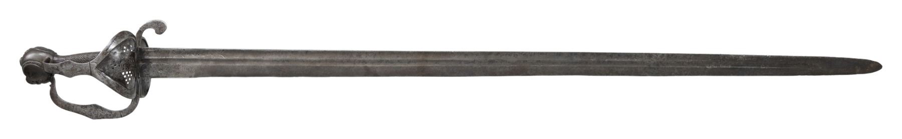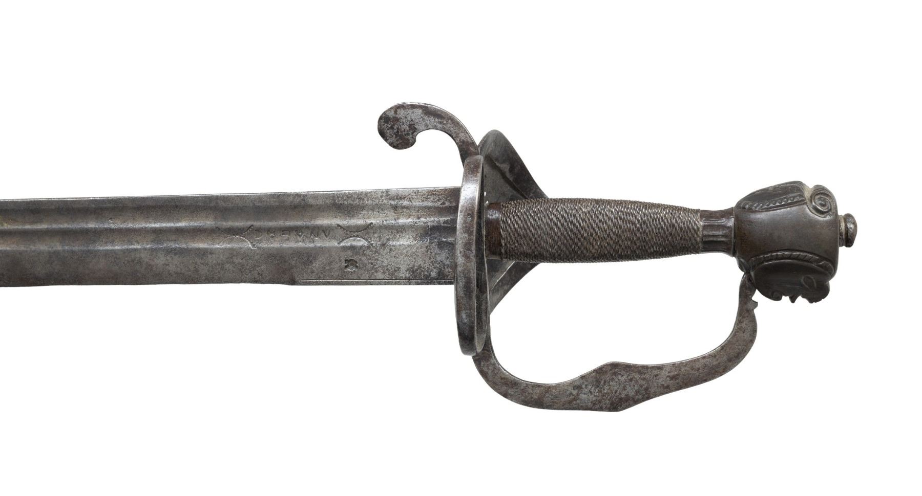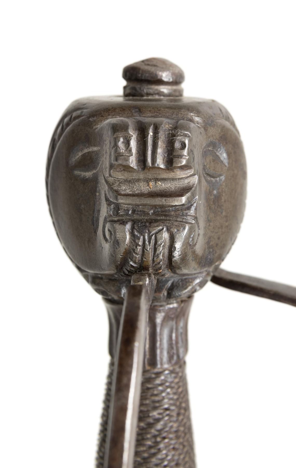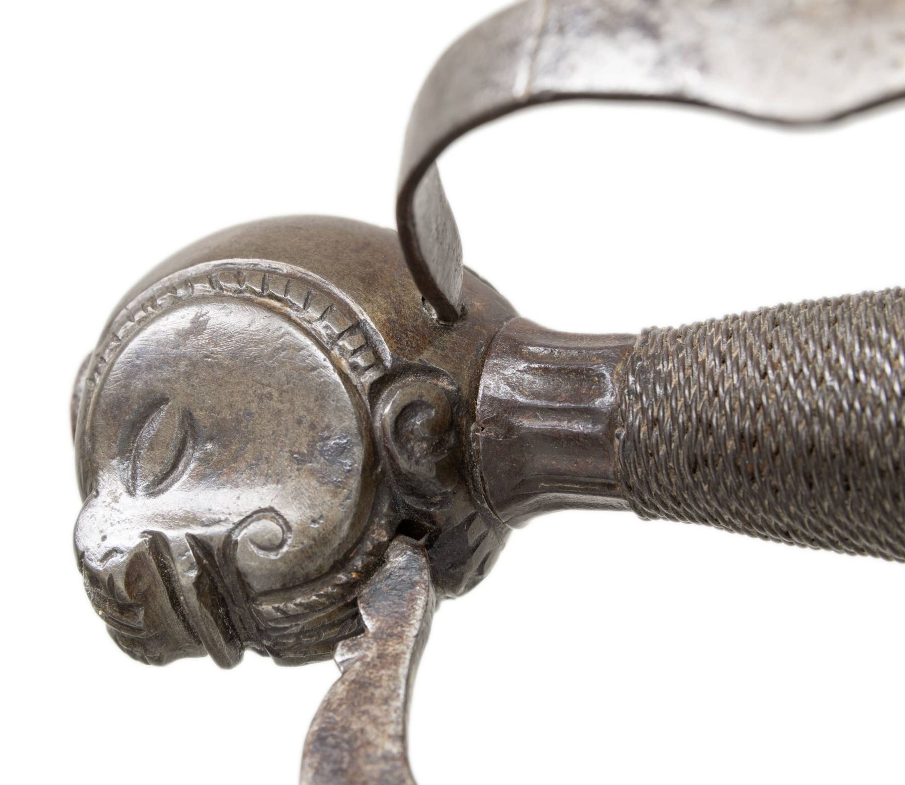 A good heavy example of a European, probably German, backsword of the early 18th century with a stylized eagle or hawk head pommel. This early sword measures 43" overall with a double fullered 37" blade. The blade has an armorers mark on each side along with a six letter word that appears somewhat runic in the top fuller of each side. The iron hilt has a flattened cross guard and knuckle bow with a pierced semi-basket guard. The bulbous pommel is adorned with a stylized eagle of hawks head. Wire wrapped grip with plain ferrules. No Scabbard. CONDITION: blade has a dark overall patina with some very light pitting. The hilt has a similar patina as the blade. PROVENANCE: Estate Collection of Nicholas Apergis. (02-24746/BF). $2000-3000.