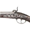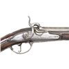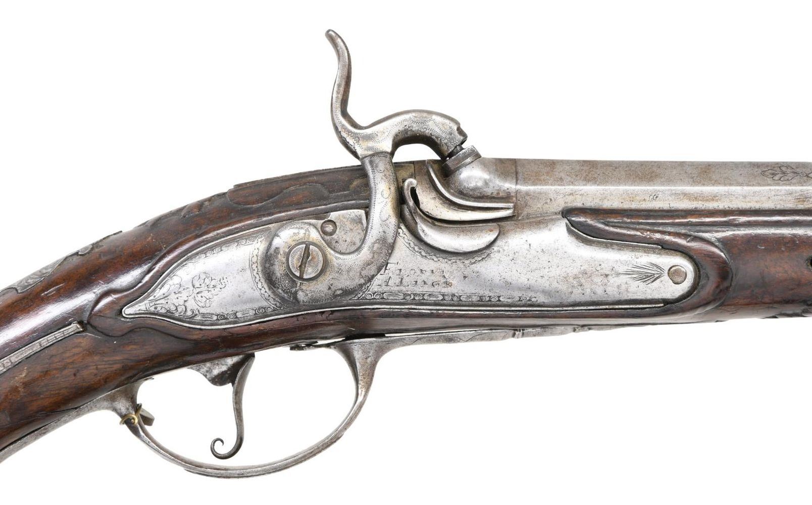CONVERTED TO PERCUSSION. Cal. 65. NSN. The 12" octagon to round barrel with wedding band transition has been converted to percussion with patent breech. Lock with arched and round bodied plate is fitted with thin tall percussion hammer. Original flintlock fence remains in place. Remnants of maker's name ("Florxxx" "a Liege") are in front of hammer. (Godefroid, Jean & Jean David Florkin were all working in Liege in 1730.) Iron mounted stock extends more than half way down barrel and is fastened by pins. Stock has raised mouldings carved around lock and multi-pierced scrolled lockplate as well as along barrel and around thimble. Raised carved acanthus is behind thimble and barrel tang. Other mounts include heavy knob grip cap with side spurs and chamfered trigger guard. A crestplate is at top of grip. Hickory ramrod with steel plate at tip mounts through beaded pipe soldered to barrel and matching thimble. CONDITION: good. Metal cleaned to silver gray. Wood with old finish shows considerable wear. Repairs are noted at left side of grip with crack on right. Pitted bore. Lock is good. (01-24364/MGM). ANTIQUE. $1,200-1,500.