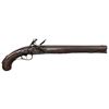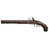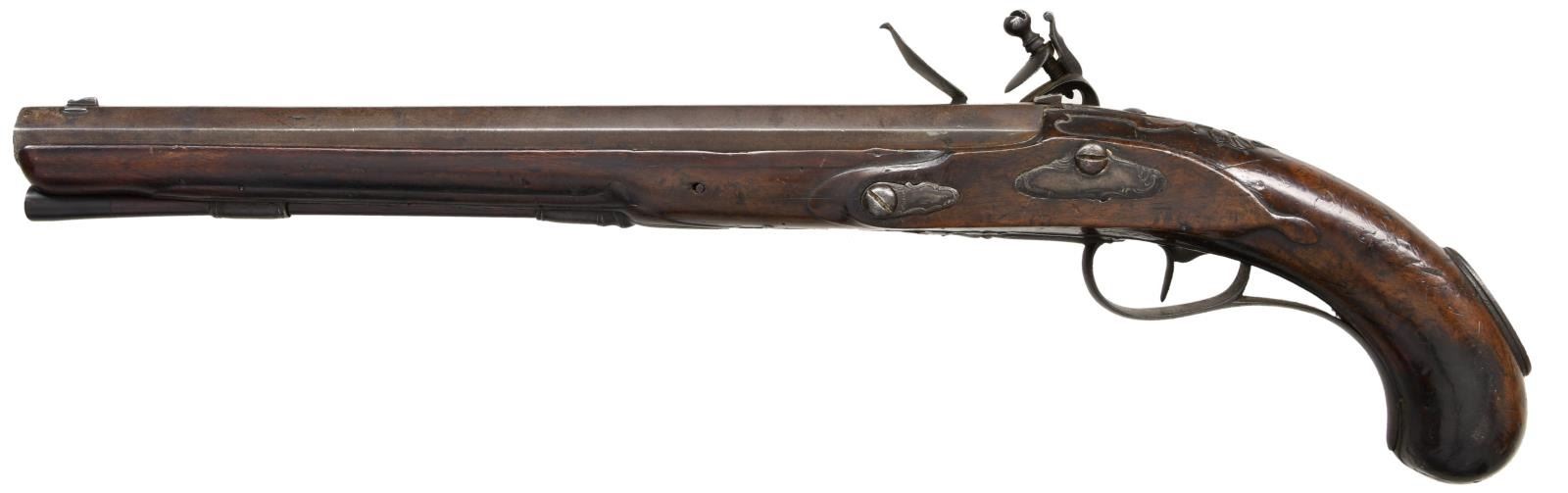 PISTOL CARBINE. Cal. 58. S# NSN. The rifled 13" tapered octagon barrel is fitted with "V" notch rear and blade front sights. Early style lock with slightly arched rounded plate has rounded serpentine cock, inset rounded pan, unbridled friction frizzen and nicely file decorated frizzen spring having large bulbous finial with teat. Lock is fitted with sliding safety at rear. European walnut full length stock is pinned to barrel and is iron mounted. There are raised mouldings around lock, two piece sideplate, barrel channel and trigger guard. There is stylized relief shell carving around barrel tang. There is no grip cap. Trigger guard with foliate finial has long transition into grip. Sideplates are nicely relief chased. There is a large iron boss at rear of grip with socket attachment for shoulder stock (not present). Rosewood ramrod with horn tip mounts through beaded iron pipe and matching thimble. CONDITION: good. Iron parts are a uniform dark brown lightly pitted patina. Wood presents good hand worn surfaces at butt and is sound through lock area and toward forend, however last 3" of fore piece and tops of barrel channels on both sides are replaced for another 3 to 4 inches. Repair is well done and fairly hard to spot. Straight rifled bore is lightly pitted. Lock will not hold at full cock and safety does not engage. Sear spring repaired with piece of coil spring. (01-23465/MGM). ANTIQUE. $750-900.