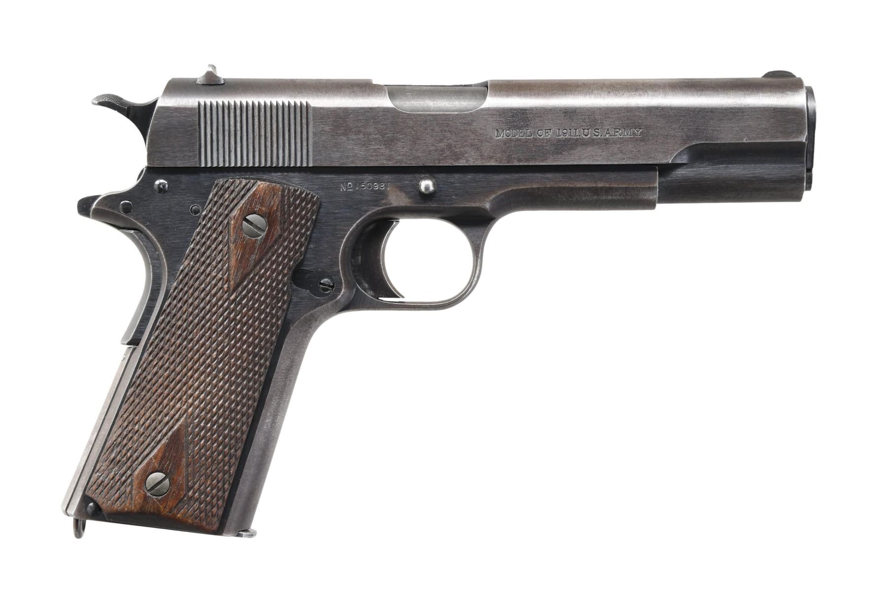Cal. 45 ACP. S# 150981. This pistol originally shipped to Rock Island Arsenal May 1917; The United States entered World War I on April 6, 1917. This Brushed Blue pistol has most correct parts; replacement parkerized 5" Colt Type 6 barrel. Frame has "GHS" stamp & double diamond checkered walnut grips. MAGS: 1 two tone 7 rd. CONDITION: slide has fair original finish showing blue in protected areas, patina throughout & marks. Good original brush blue on receiver sides with fading to brown/gray patina on grip strap, mainspring housing & bottom portions of frame. Good grips with noticeable scratches, wear to checkering & small gouges. Grip screw have reparkerized finish. Very good strong bore. (24-5632/MD). CURIO. $1,000-1,500.