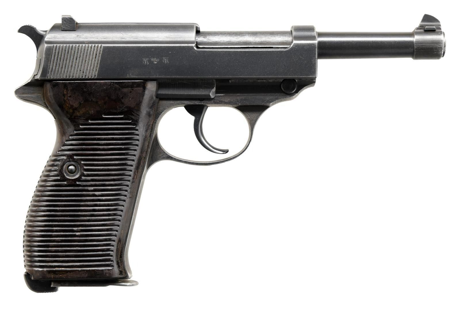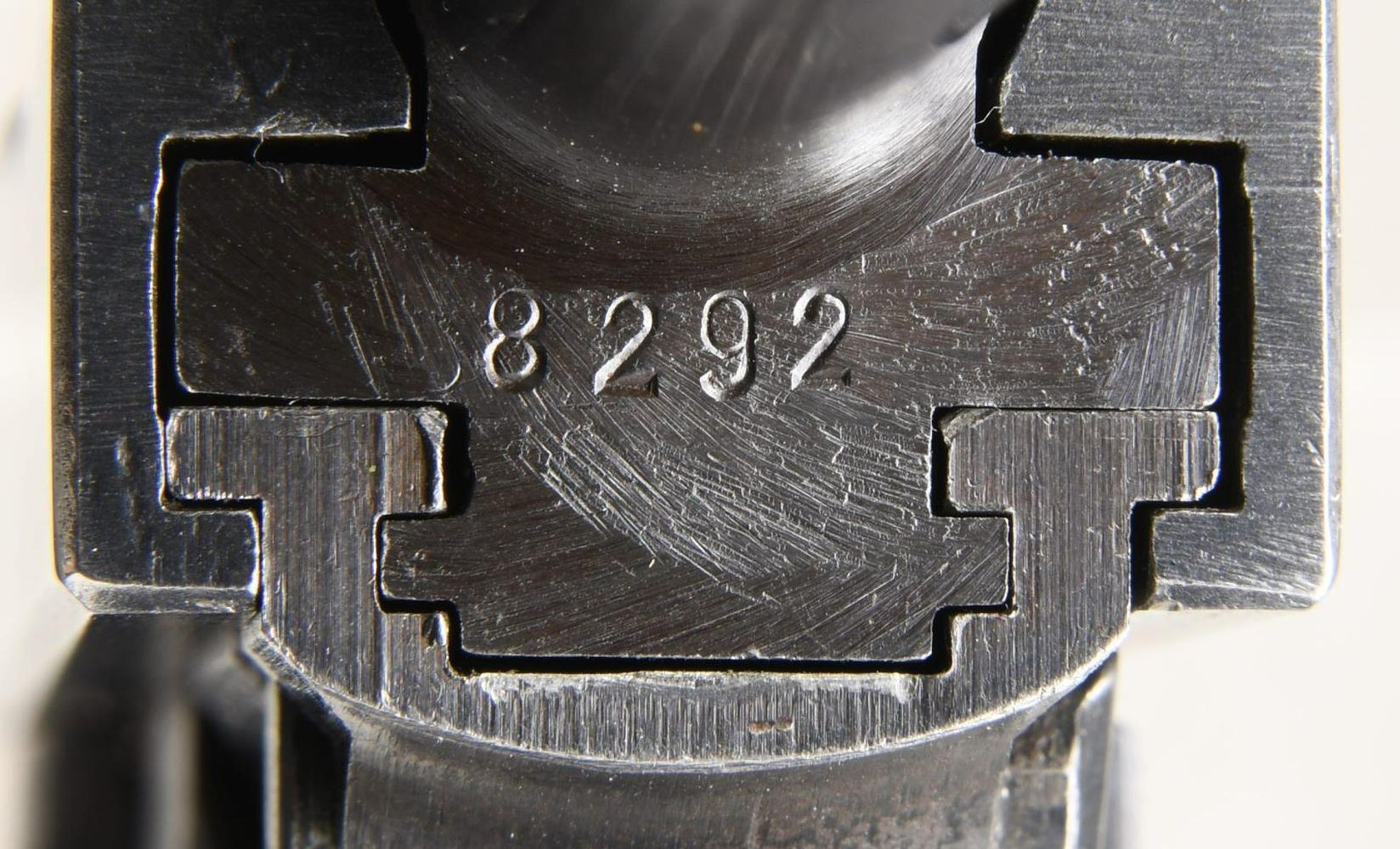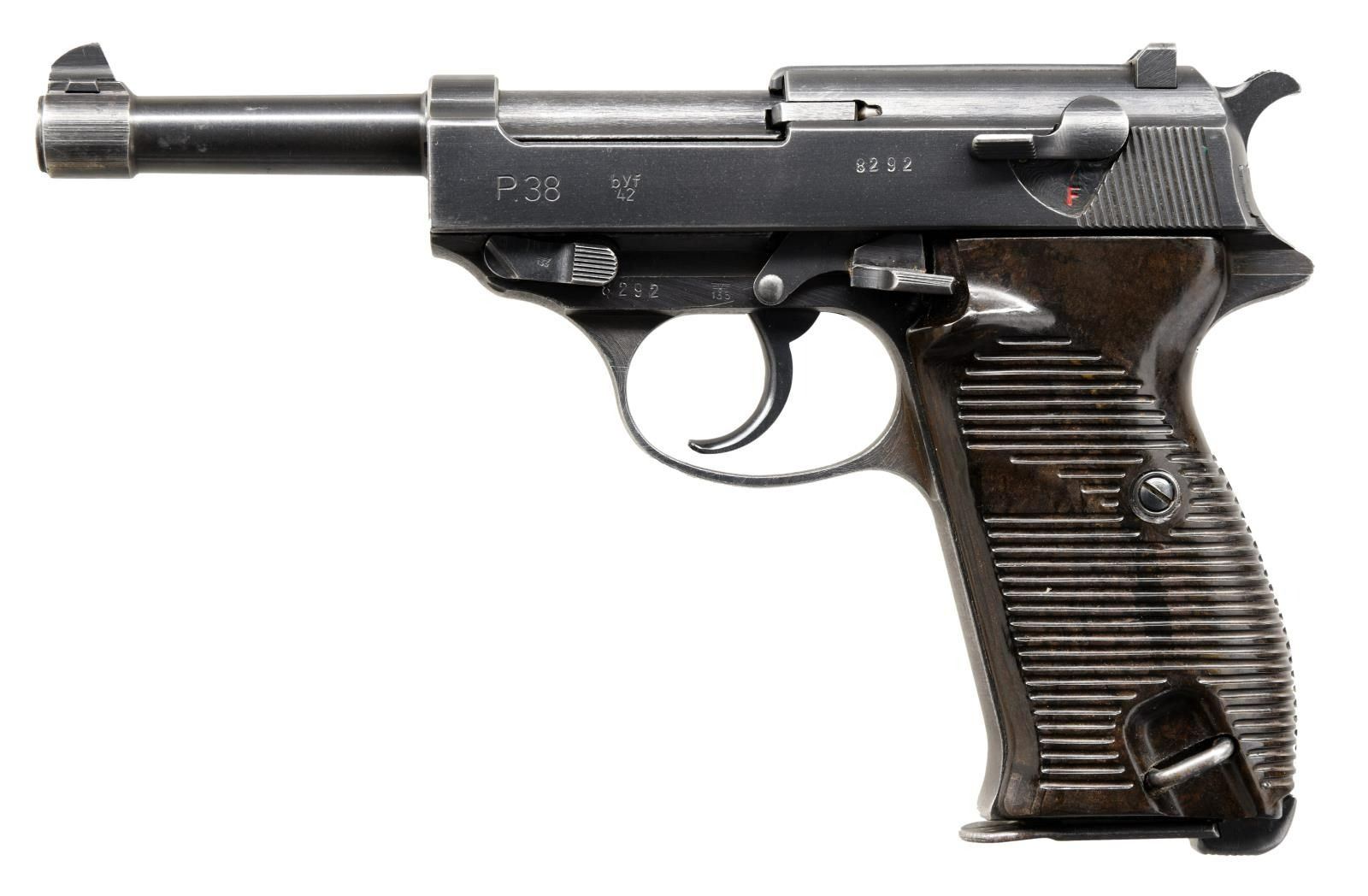 PISTOL. Cal. 9x19mm Parabellum. S# 8292. Bbl. 4 7/8". P.38 semi-automatic pistol mfg. at the Mauser arsenal in 1942. The left side of the slide is marked with the model designation "P.38" followed by Mauser's mfg. and date code "byf/ 42", and the non-suffixed S# "8292". Right side of slide exhibits an Eagle/135 acceptance proof on either side of an eagle firing proof. Metal components are blued, with the frame being mounted with 2 piece grooved pressed resin grips. All numbers are matching and include the frame, slide, bbl., and locking block. Takedown lever spring plunger appears to be a replacement, being slightly too long and causing some difficulty when disassembling the pistol. MAGS: 1 8-rd P.38 mag., and 1 8-rd. Post-War P1 mag. CONDITION: metal components retain the majority of their original blue finish, exhibiting edge wear, and areas of mild wear and thinning overall. Very bright bore, exhibiting light pitting and retaining well defined rifling throughout. Grips show a few minor marks from storage and handling, but are otherwise very good overall. (23-5436/MLW). CURIO. $500-700.