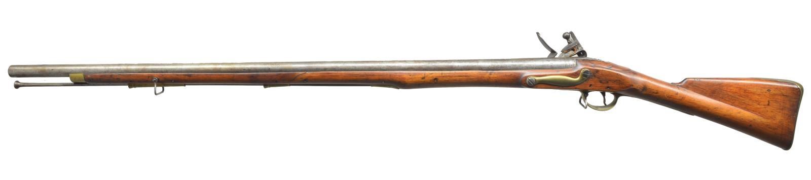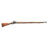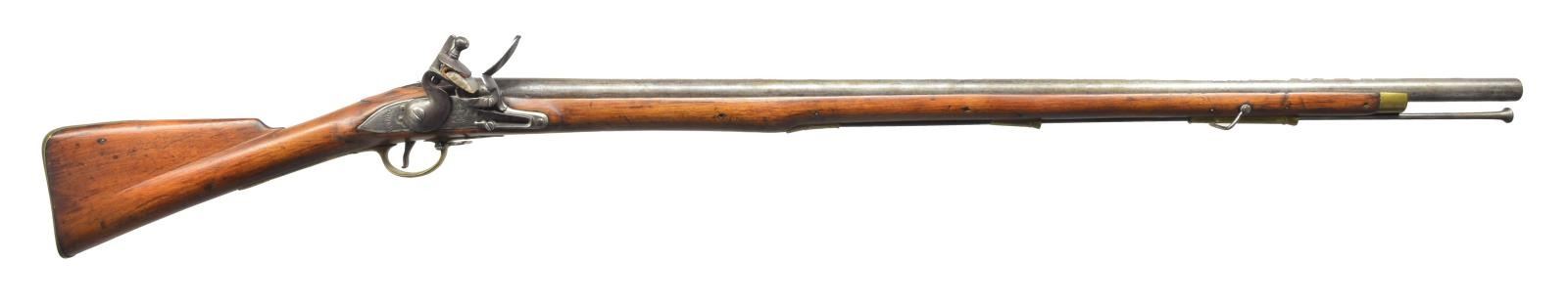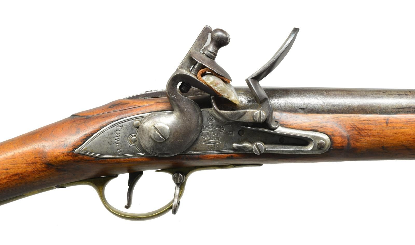 Cal. .765. NSN. 39" Rnd. bbl. w/ black powder proofs at breech end, also stamped “SG”. Tower marked lock has crown over “GR” in front of goose neck cock w/ view proof under pan. Musket has not been reconverted. Interior of lock marked w/ crowned "3" & “PS”. Brass mounted stock of European walnut has no visible brands or marks, but does have beaver tail relief carving behind bbl. & palm swell at thimble. Musket is complete w/ steel ramrod & sling loops. CONDITION: good. Iron & steel parts cleaned to silver gray over considerable light pitting. Stock heavily refinished w/ deep sanding marks & rounded edges. Brass w/ file marks & heavy cleaning has toned back to mustard under a coat of lacquer. A piece of wood is missing at right side of bbl. tang. Otherwise, stock appears to be sound. Cock somewhat loose on tumbler. (01-18705/MGM). ANTIQUE. $1,000-1,500.
