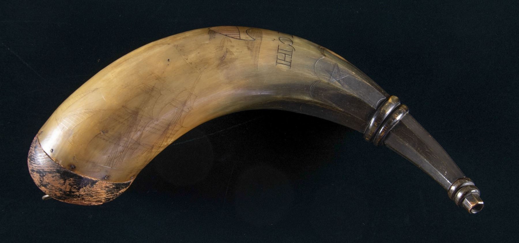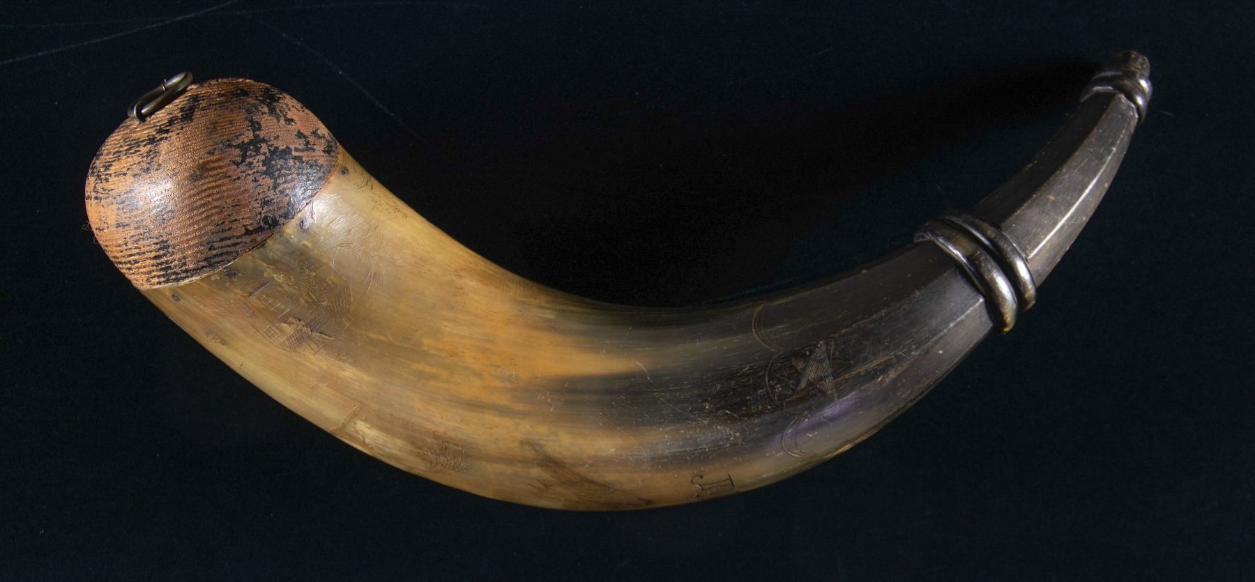 EARLY AMERICAN POWDER HORN WITH 2 MASTED