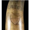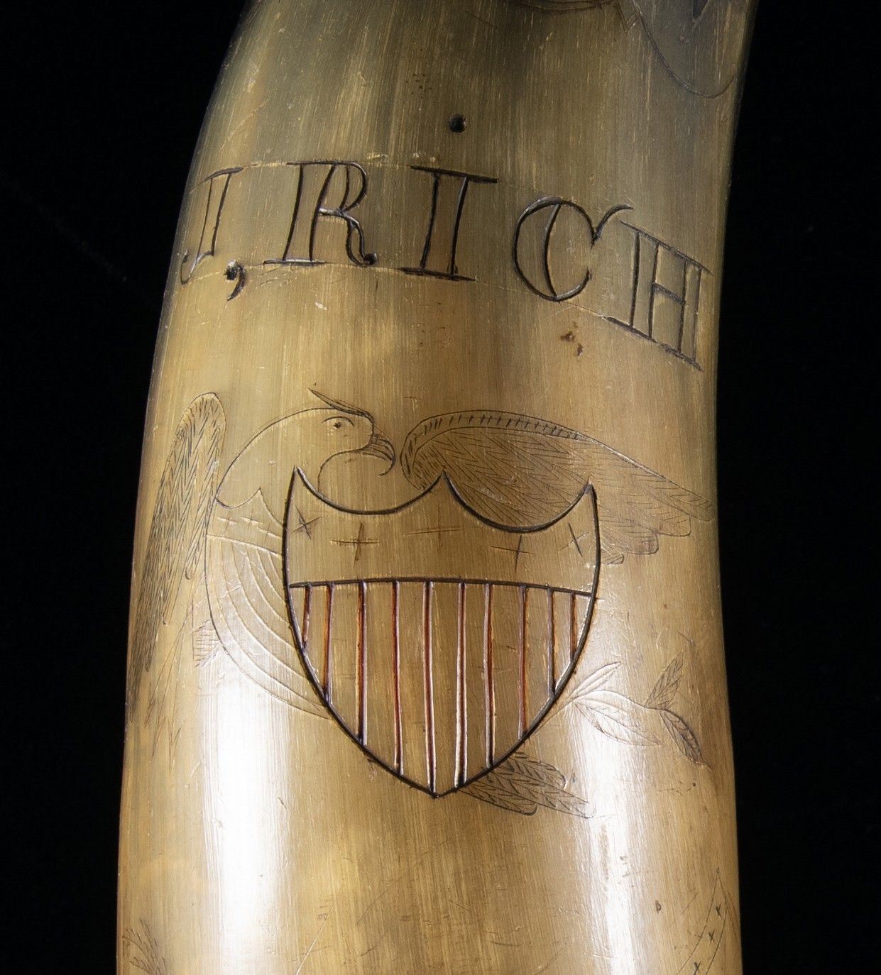 SAILING SHIP. A very fine 14" powder horn with a large rounded butt plug with a octagonal and turned spout. The horn is decorated with a finely done 4" 2-masted sailing ship and a willow tree. Furthermore, There is an American eagle wrapped around a Federal shield that has been colored with sealing wax. The name " J, RICH " appears above the eagle, and above the name is a surrounding swag with alternating stars. CONDITION: The horn remains in solid condition with no notable faults. PROVENANCE: Estate Collection of Nicholas Apergis. (02-24658/BF). $1000-1600.