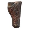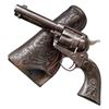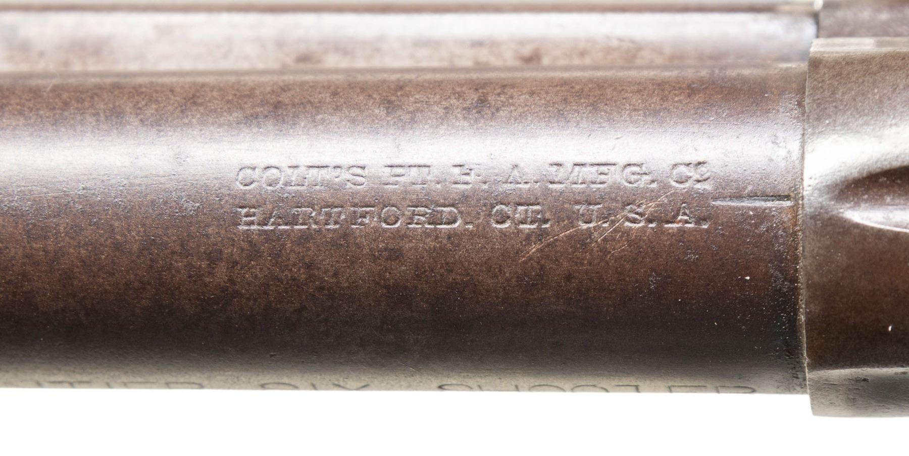SHOOTER SAA REVOLVER WITH FACTORY LETTER & TOOLED LEATHER HOLSTER. Cal 44-40. S# 167340. Mfg. 1896. Bbl. 4 3/4" with 2 line bbl. address & low profile blade front sight. Up until 1896, Colt SAA frames were mfg with a transverse frame screw mfg to holt the cyl. pin in place, beginning with S# 164000 (approx.), the company made a switch to the pushbutton release as seen here. The design remains the same to this day. With the Federal legislation of 1968 classifying firearms manufactured prior to 1899 as antique, a small window was created in which these push button release guns are considered antique (1896-1898). Left side of frame roll stamped "COLT FRONTIER SIX SHOOTER". Hammer appears replacement. Revolver is stocked with 2 piece checkered hard rubber "Eagle" grips. UNATTACHED ACCESSORIES: vintage tooled leather holster marked at front near loop "RJ ANDREWS / SAN ANTONIO". Colt factory letter stating the following: "Serial Number: 167340 / Caliber: .44/40 / Barrel Length: 4 3/4" / Finish: Blue / Type of Stocks: Not Listed / Shipped To: Simmons Hardware Company / Address: St. Louis, Missouri / Date of Shipment: October 1, 1896 / Number of Same Type Guns in Shipment: 20". CONDITION: metal has faded to an even brown patina with light oxidation & fine pitting. Grips are worn with handling marks & scratches. Fair bore shows strong rifling with darkened areas of pitting. Mechanically fine.PROVENANCE: From the Buckstix Collection. (01-28604/BH). ANTIQUE. $2,500-3,500.