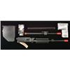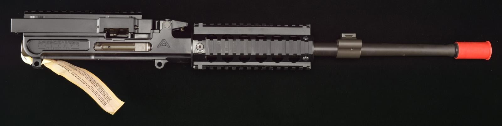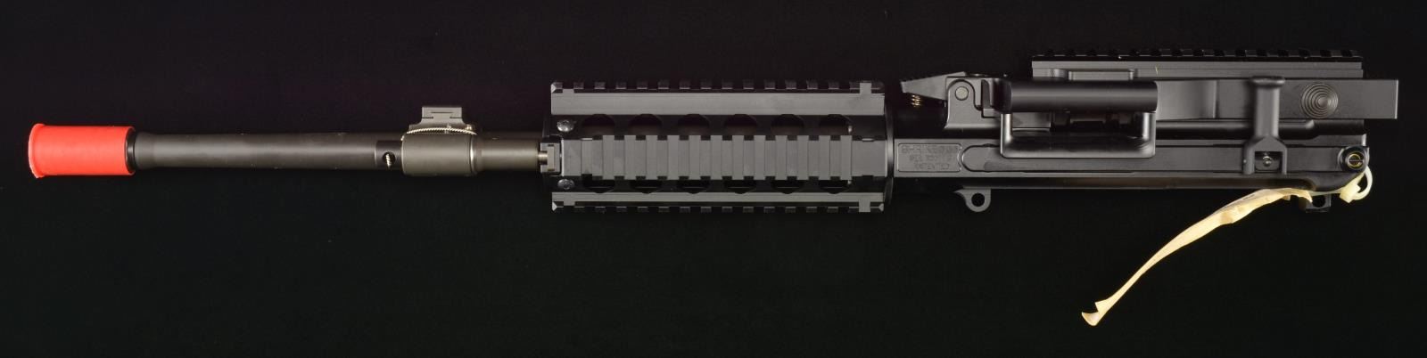UPPER RECEIVER FOR AR-15 OR M16. Cal. 223. S# B00118. Bbl. 16". The Shrike belt feed conversion system is truly a modern marvel in engineering, allowing an upgrade to the US militaries primary service rifle of over 50 years from simply box fed magazines to belt fed while retaining the ability to utilize the standard box magazine & drums. It was designed to utilize the standard M-27 & Stoner links & linked SAW ammunition. It incorporates a quick change bbl. system & side mounted piston operating system upgrade w/ out the use of any tools while retaining almost every lower receiver part in the current US armory. Numerous configurations were offered w/ several optional bbl. lengths & furniture choices. These utilize a traditional top cover w/ shuttle feed mechanism & left side mounted, folding non-reciprocating charging handle. Today these are marketed through a company named FightLite Industries as the MCR re-designed for the more destructive M855A1 ammunition. This particular example has a 6" Mil-Std rail system on the top cover & a free floating 6.5" quad rail hand guard. Finish on all external components are a suitable combination of matching black parkerizing & anodizing. MAGS: 10 piece advanced weapon system link set. UNATTACHED ACCESSORIES: spare 16" quick change bbl., main action spring, carbine stock spacer, modified bolt catch, front sight assembly, rear sight assembly, SAW box magazine adapter & SAW box & operators manual. CONDITION: all parts w/ the exception of 200 rd. plastic SAW box are brand new, never having been assembled. Still retains factory hang tag. (02-16596/JZ) $2,500-3,500.